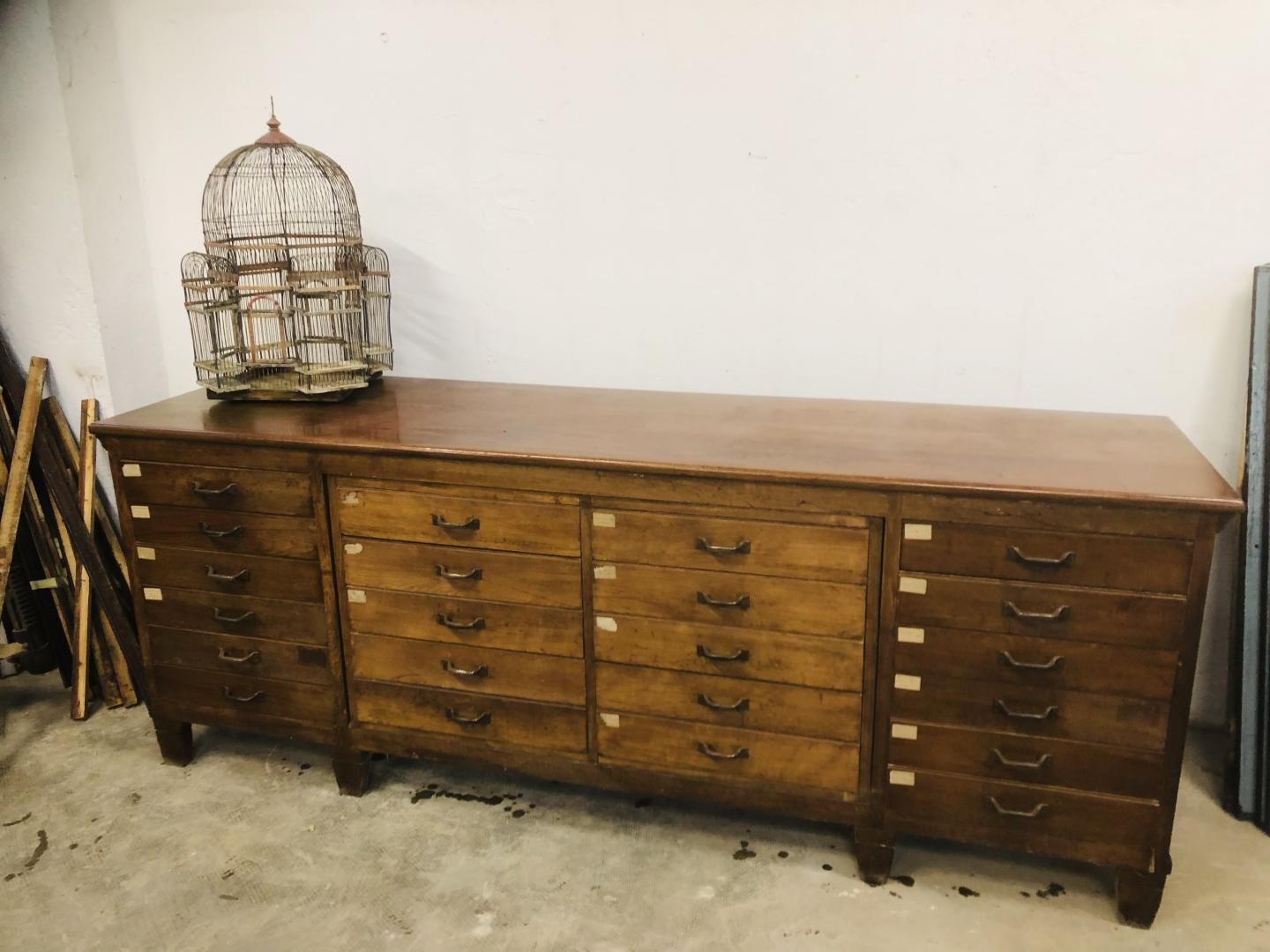 Grande bancone cassettiera da merceria da centro anni '50 con 24 cassetti.