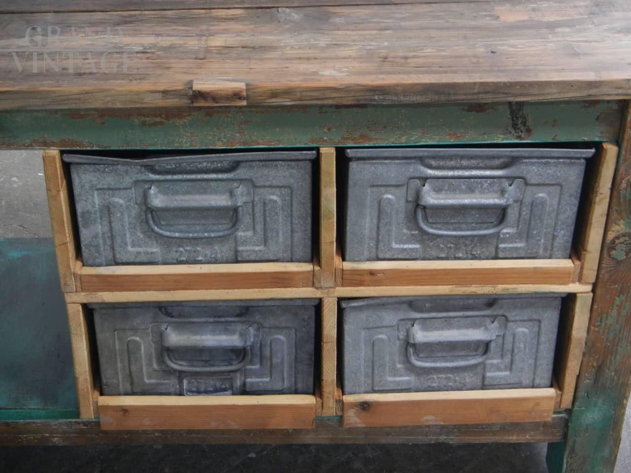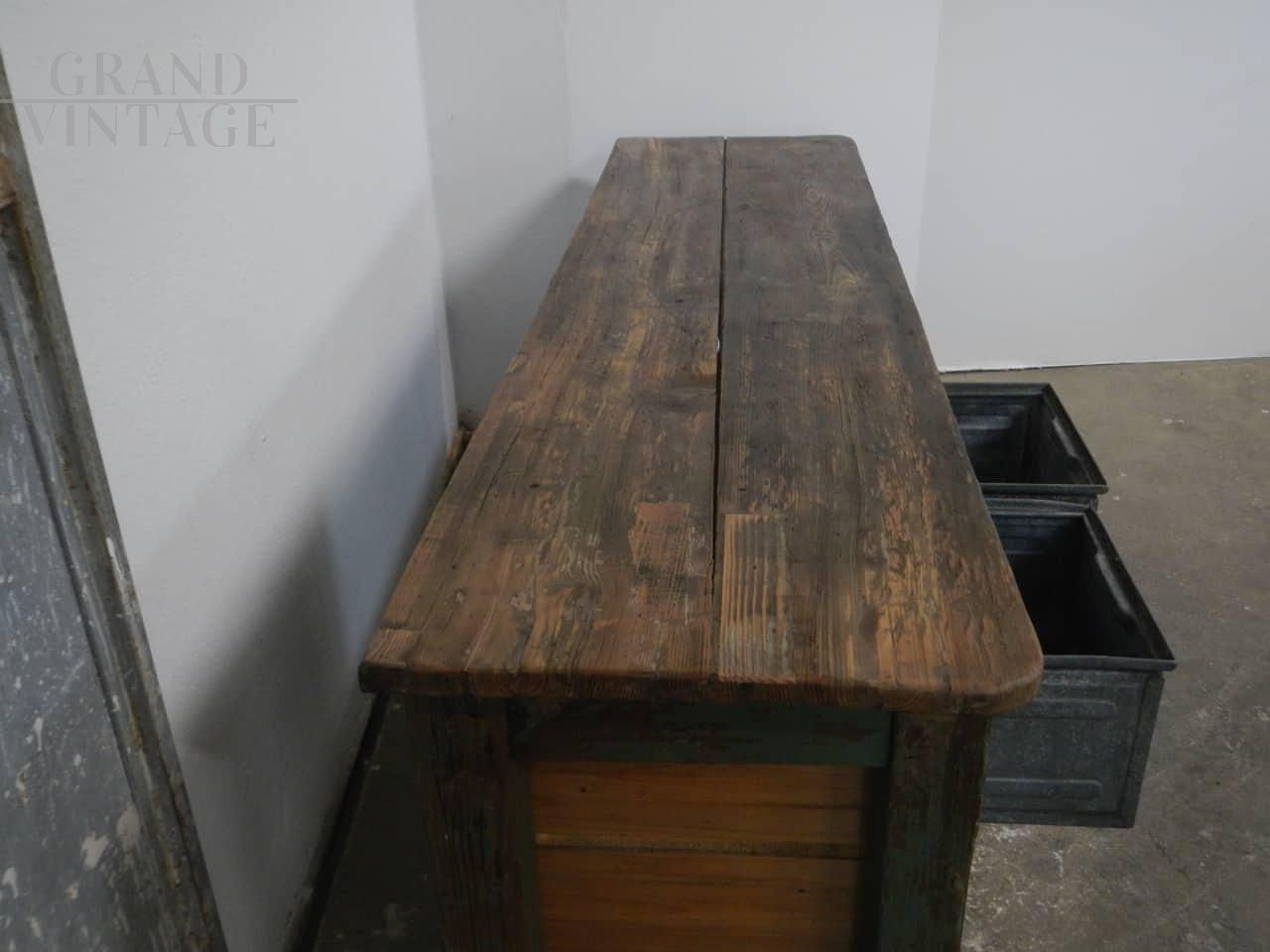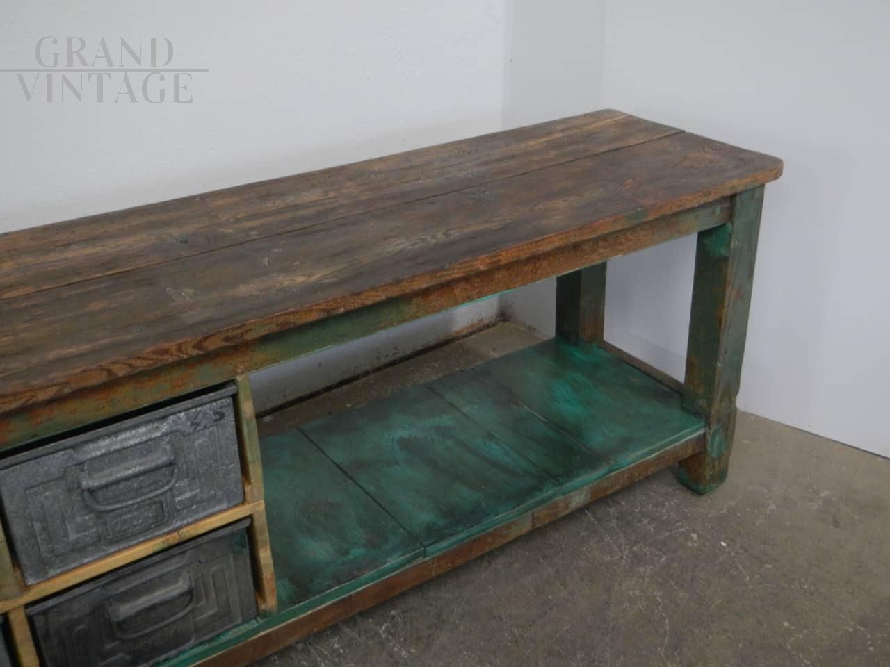 Bancone vintage industriale in legno di abete laccato, restaurato mantenendo la sua naturale patina e rifinito con una cassettiera con 4 cassetti in ferro di cm 31 x 46 x altezza 20 cm. Lo spazio fra mensole è di 44 cm. Rifinito con vernice da legno e ferro. Il piano è curvato.