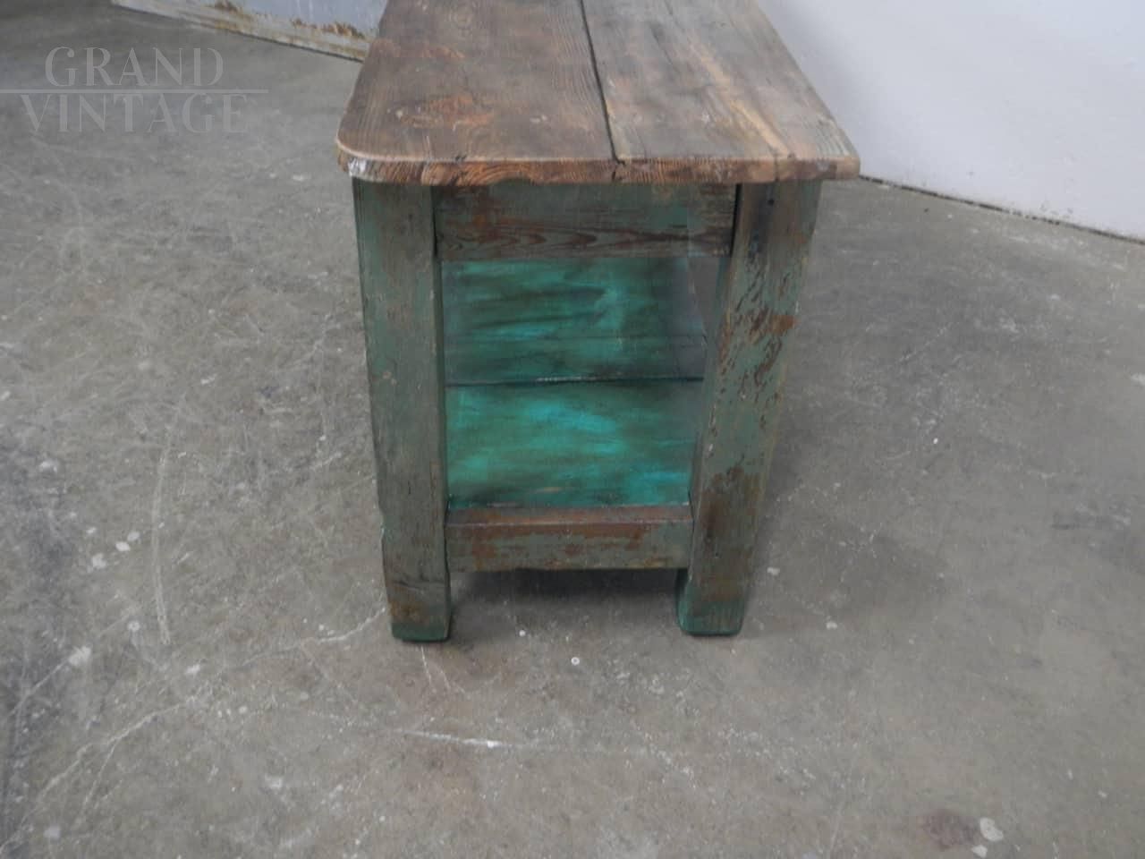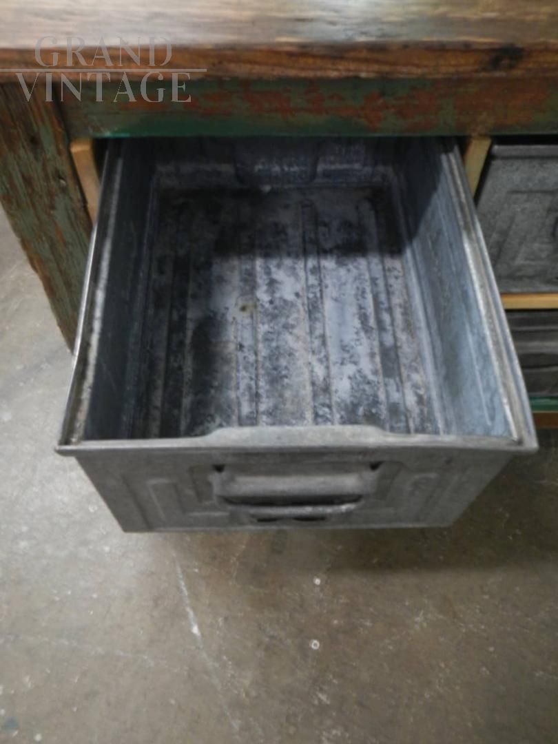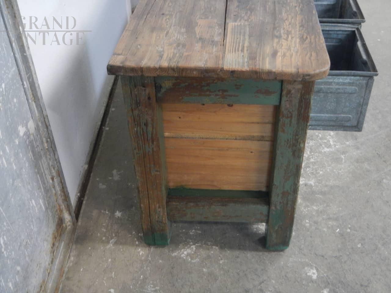 Bancone vintage industriale in legno di abete laccato, restaurato mantenendo la sua naturale patina e rifinito con una cassettiera con 4 cassetti in ferro di cm 31 x 46 x altezza 20 cm. Lo spazio fra mensole è di 44 cm. Rifinito con vernice da legno e ferro. Il piano è curvato.