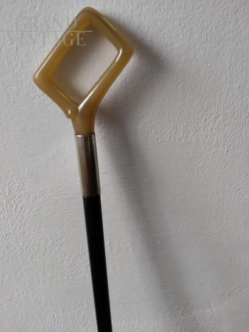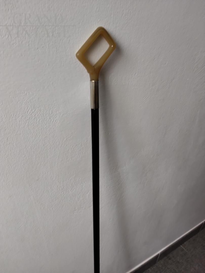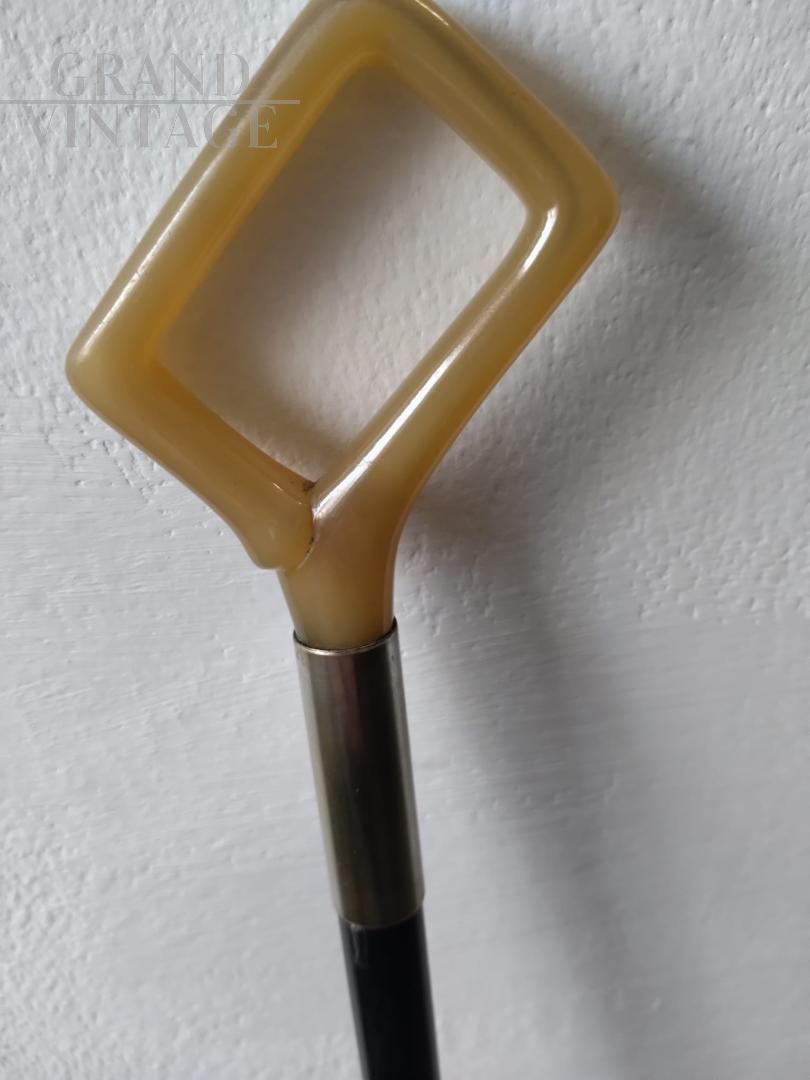 Bellissimo bastone vintage da donna della fine del XIX secolo in legno ebanizzato con manico in bachelite (o altro materiale plastico) e veretta in argento.
