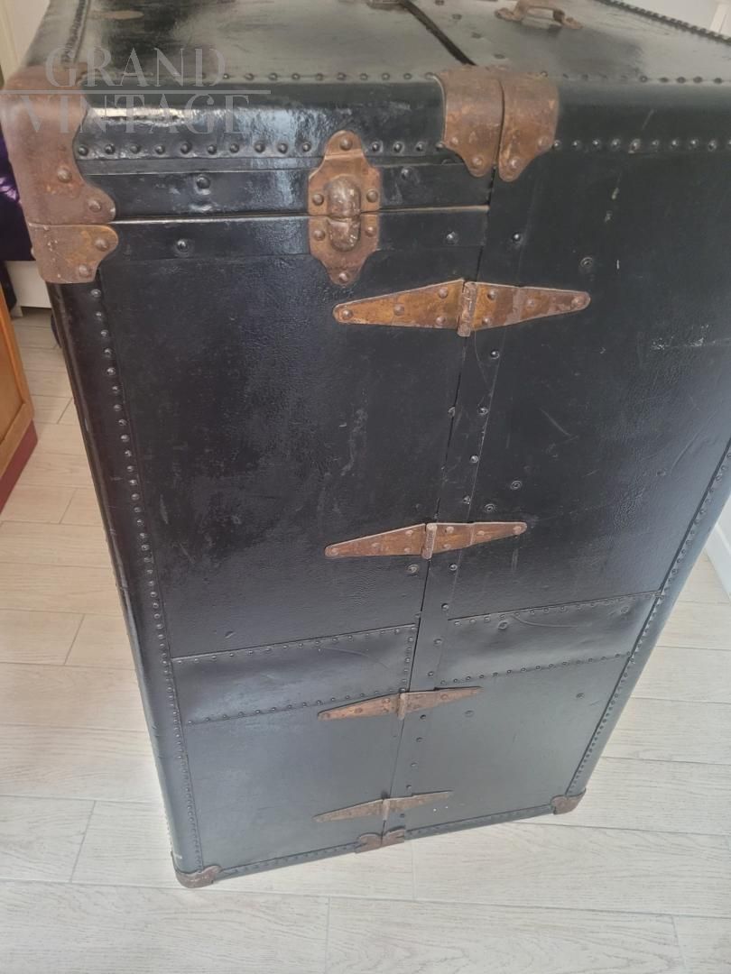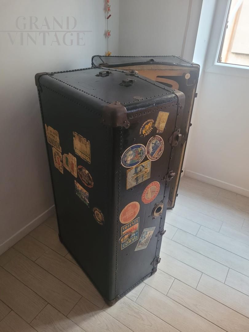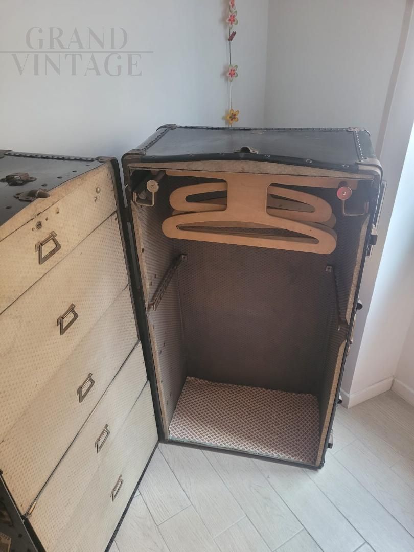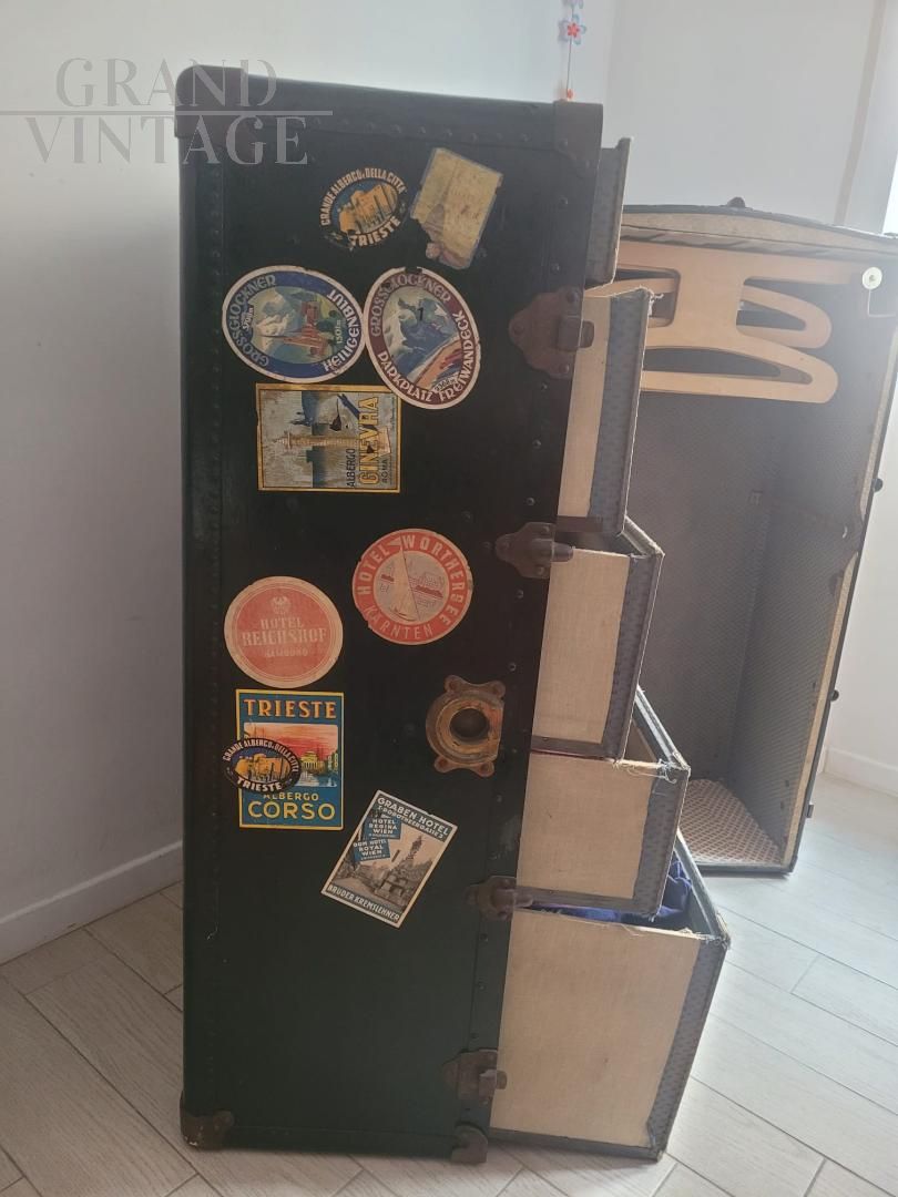 Baule armadio da viaggio vintage con 5 cassetti interni di varie misure e vano con 5 appendini in legno, con tubo allungabile e sezione apribile nella parte superiore. I cassetti sono rivestiti in tessuto, un po' rovinato. L'esterno del baule è di ferro con vari adesivi dei vari viaggi effettuati dal proprietario del baule. C'è la serratura ma manca la chiave.