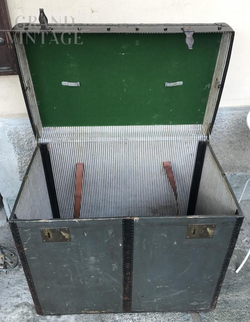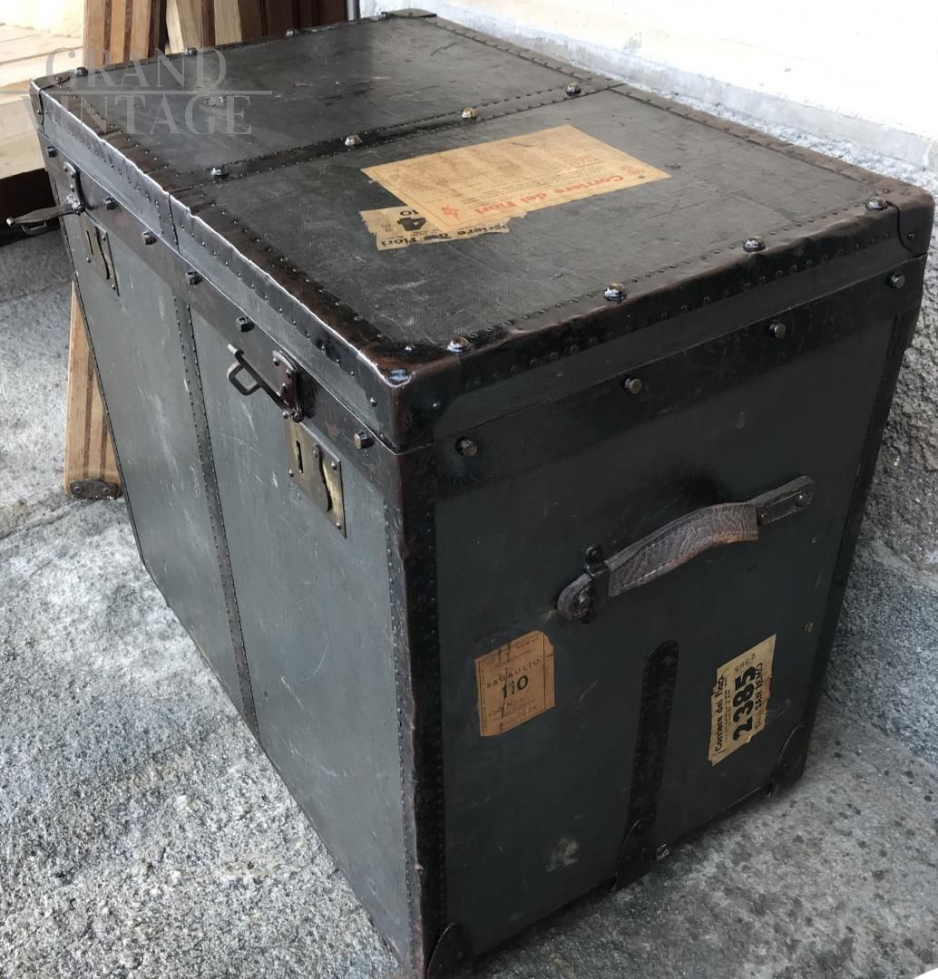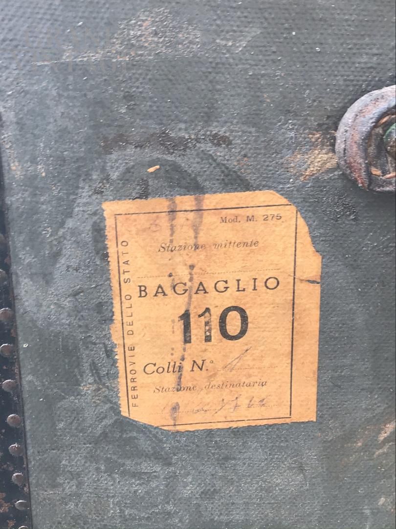 Baule da viaggio con etichette di spedizione originali del Corriere dei Fiori di Sanremo, con blocco originale per fermo sull’apertura.