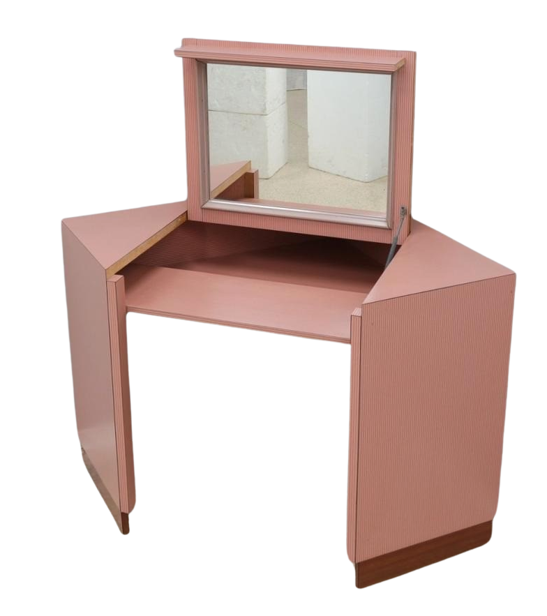 Chi desidera prendersi del tempo da dedicare al benessere personale, al trucco o alla cura della pelle, potrebbe apprezzare molto una toeletta angolare con specchio a scomparsa, come questa attribuita al designer Ettore Sottsass.