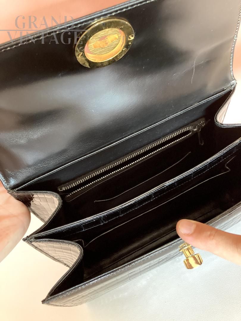 Borsa vintage in vera pelle di coccodrillo nera con finitura in vernice, realizzata tra gli anni '50 e gli anni ‘60, in stile Gucci, con dettagli in metallo dorato. Chiusura ad incastro. Interno in pelle nera e due taschine a soffietto, una tasca con chiusura a cerniera con all’interno specchietto amovibile. Mai indossata e in perfette condizioni.