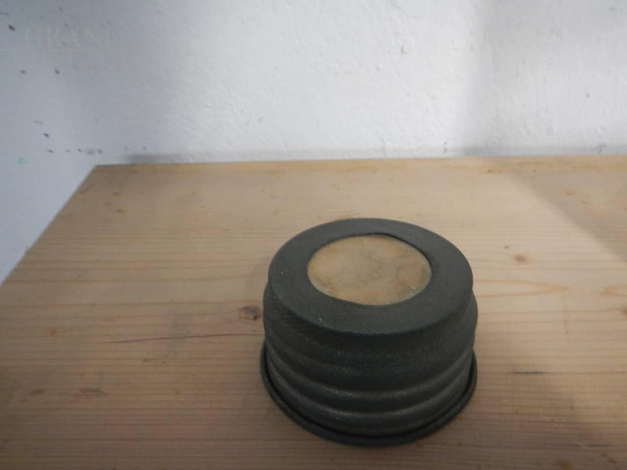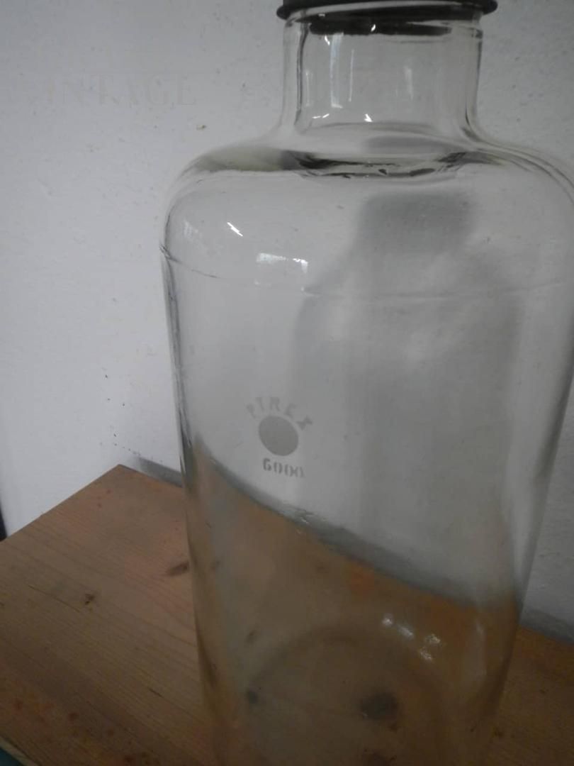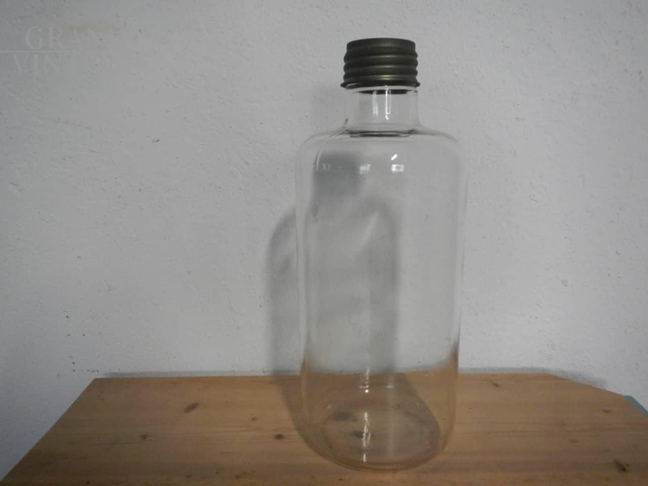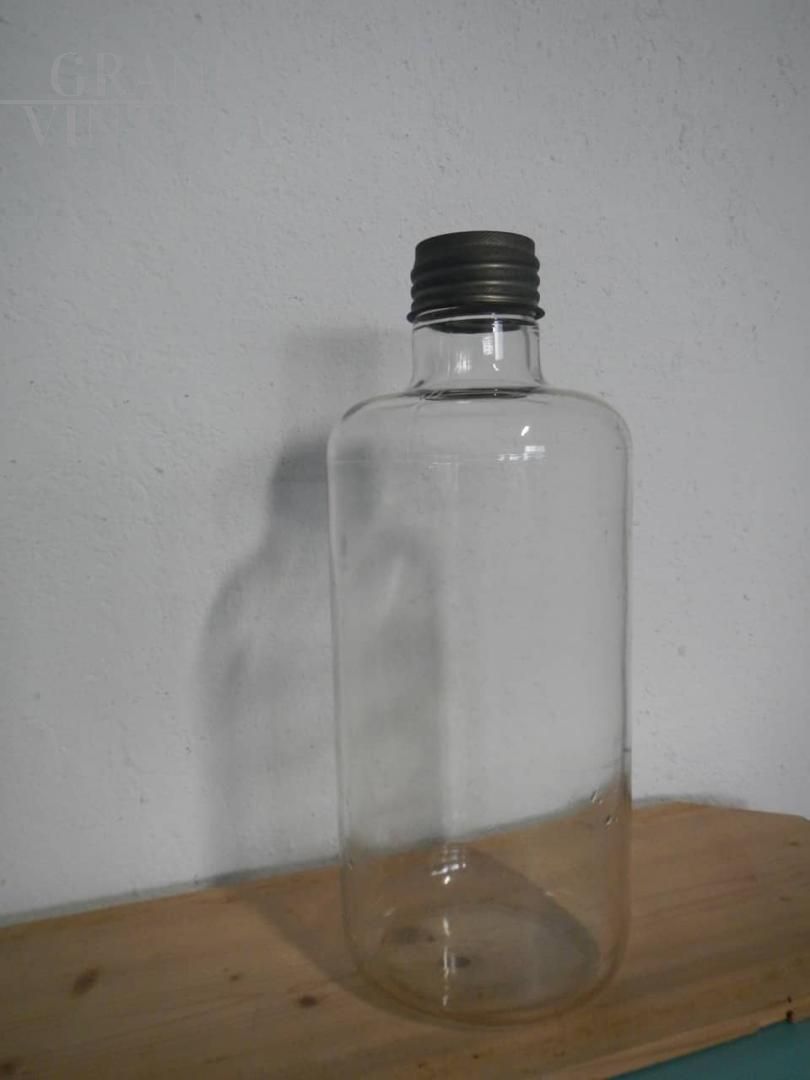 Bottiglia vintage usata nei laboratori scolastici, in vetro trasparente con tappo in ferro. In buone condizioni.