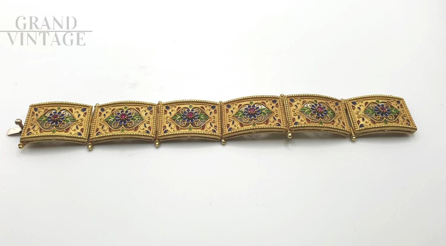Bellissimo bracciale da donna vintage in oro giallo con maglie larghe decorate con fiori delicati in pietre preziose.