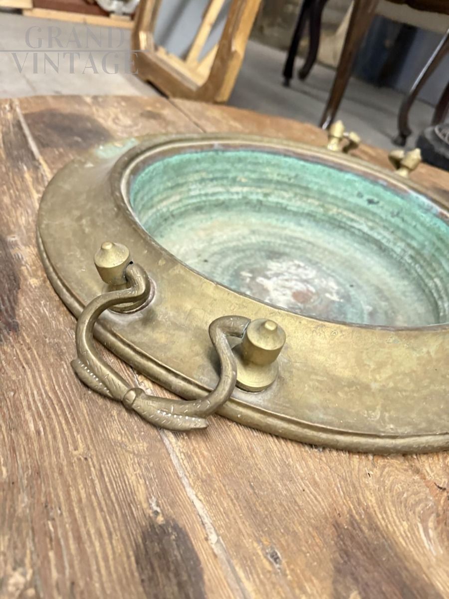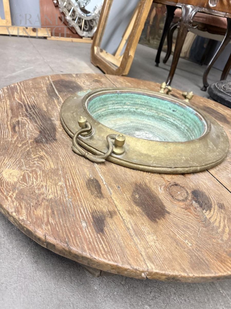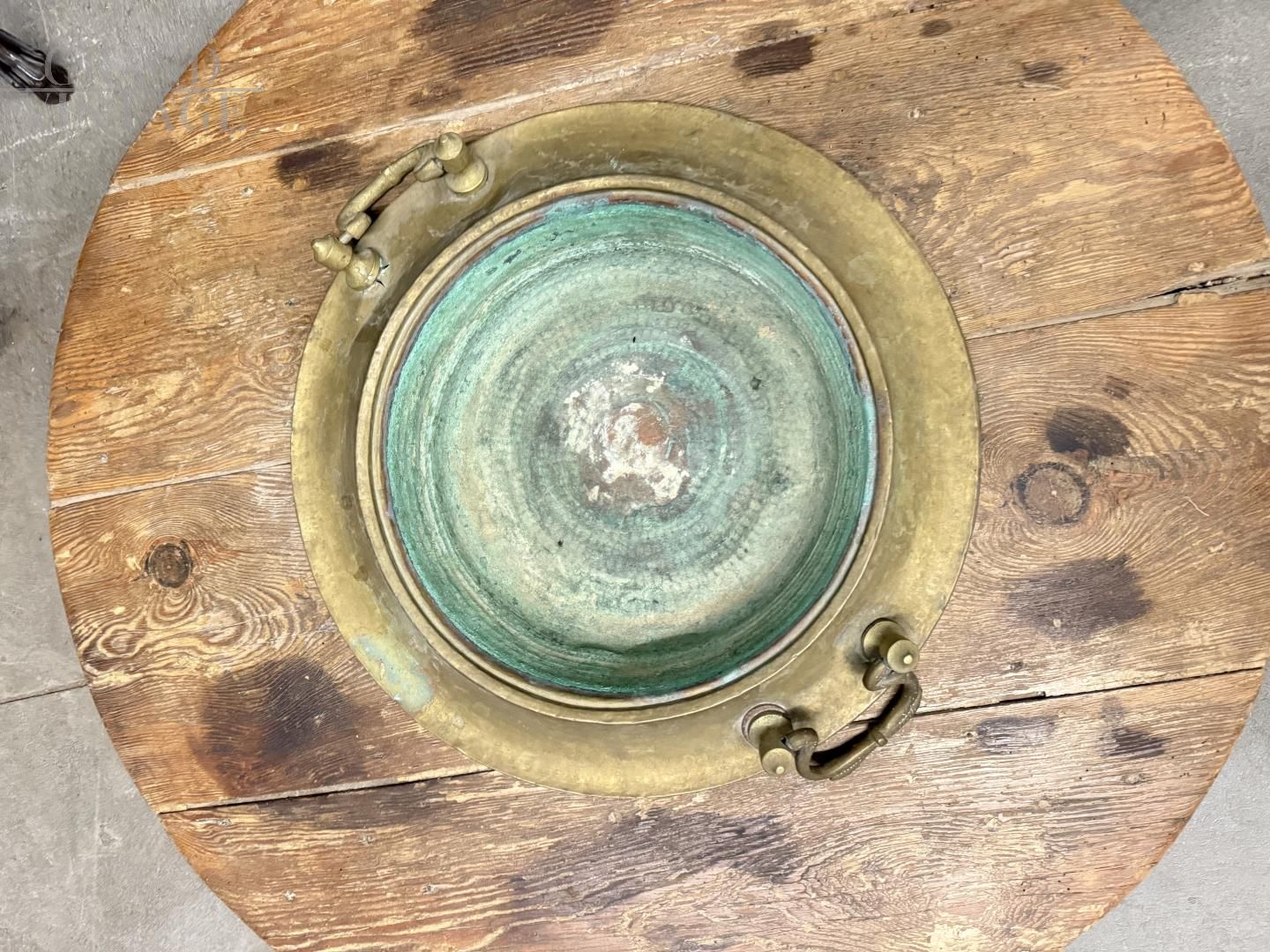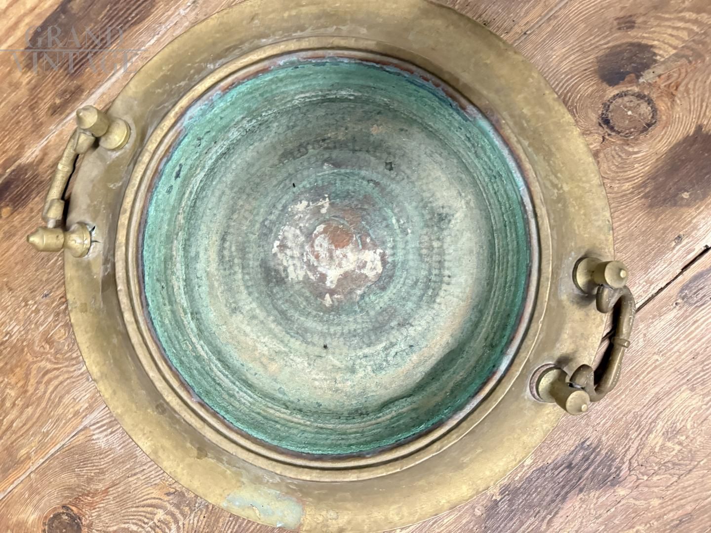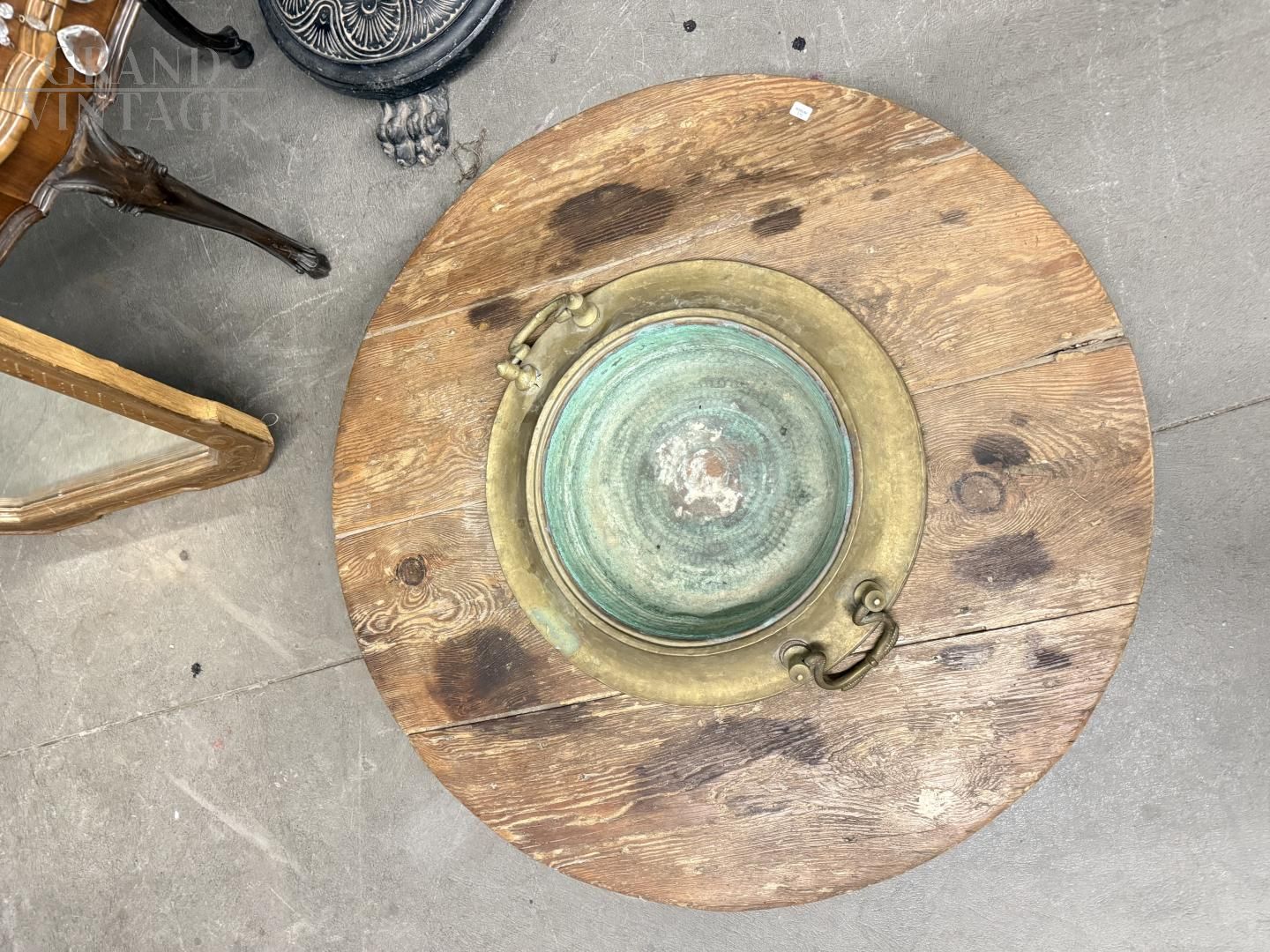 Braciere antico del XIX secolo costituito da un paiolo in rame con struttura da appoggio in legno, proveniente dal sud Italia, presenta i naturali segni del tempo e dell'utilizzo. Diametro cm 90. Buono stato di conservazione.