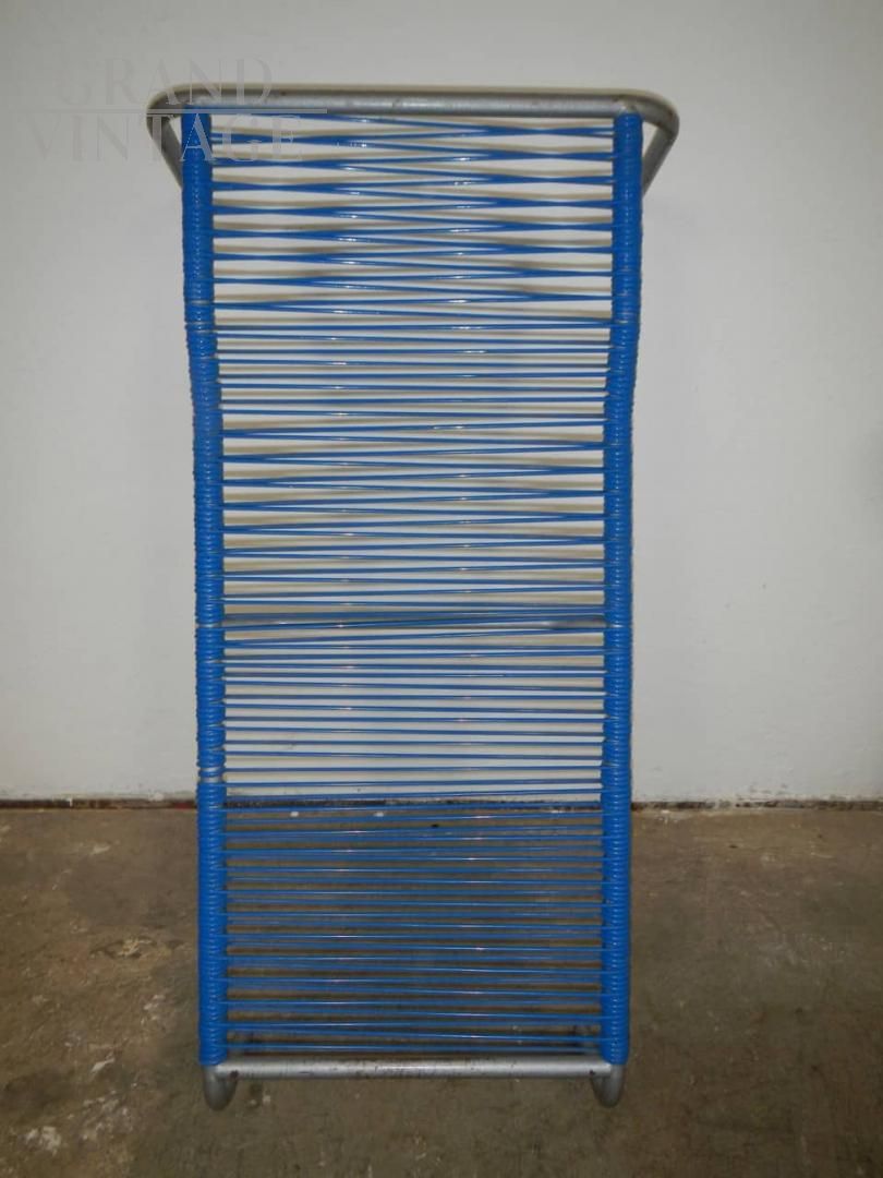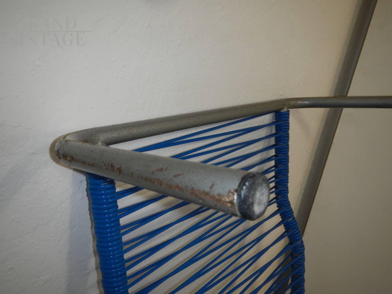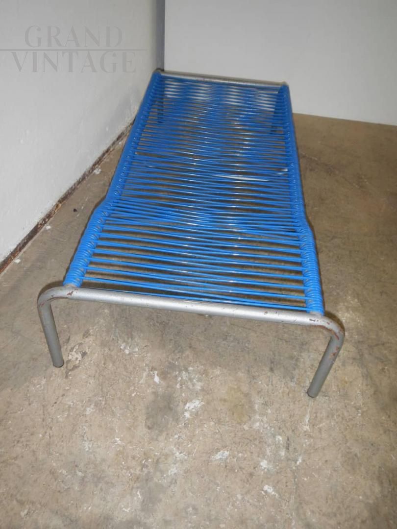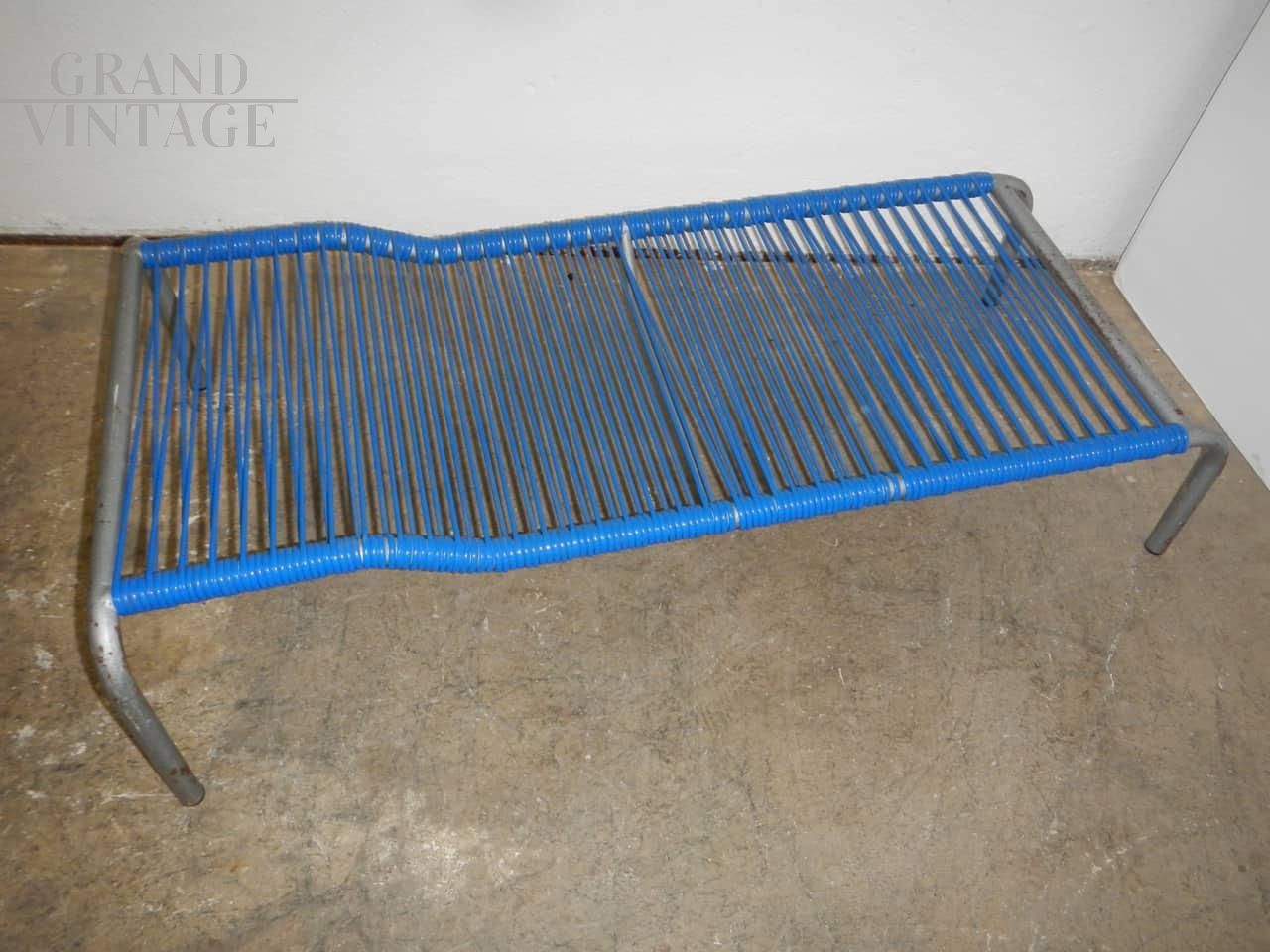 Piccola branda da bimbo vintage con struttura in metallo e seduta in corda di plastica blu, anni '70.