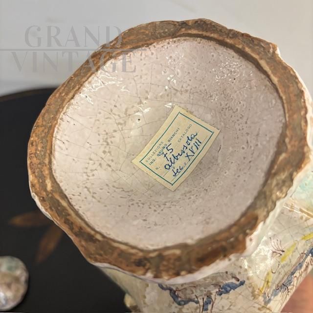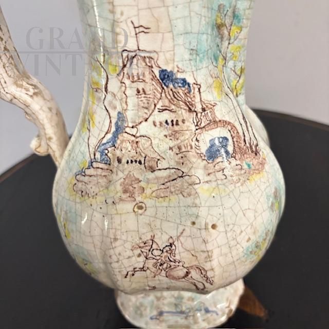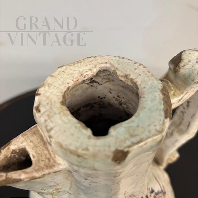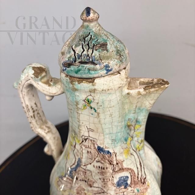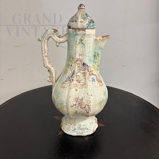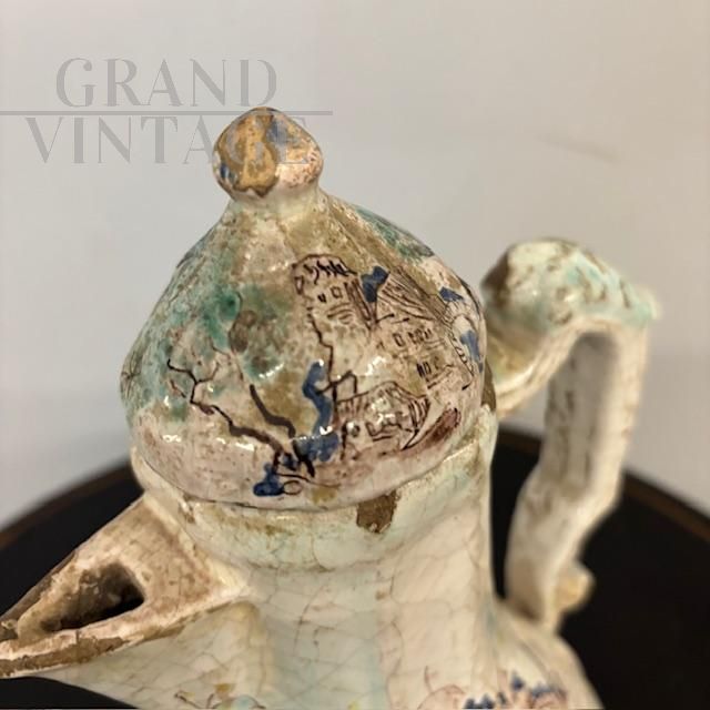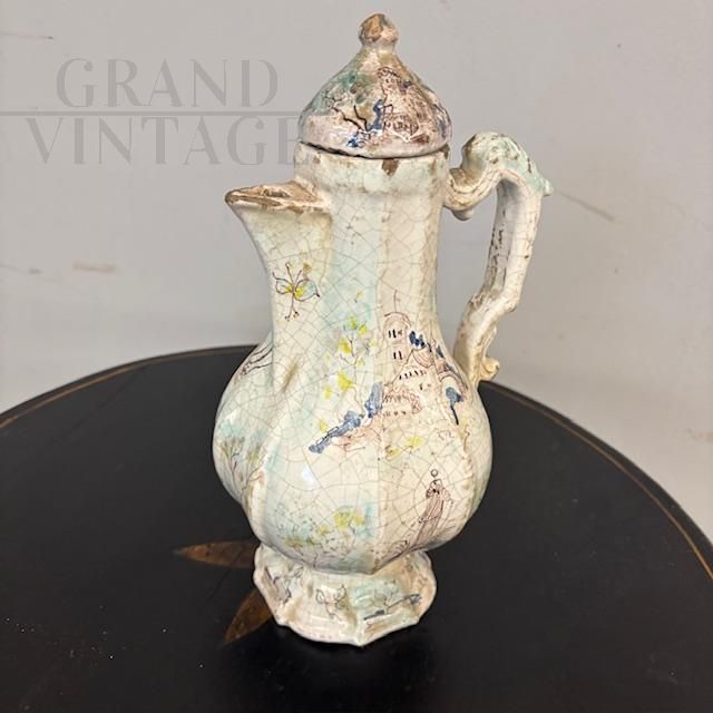 Caffettiera o versatoio antico in ceramica di Albisola dipinta, XVIII secolo