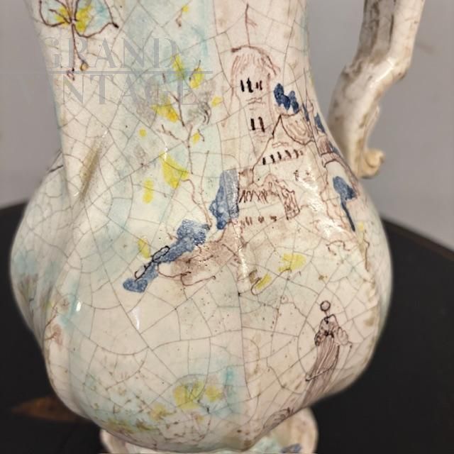 Antica splendida caraffa, caffettiera o versatoio in maiolica ceramica di Albissola dipinta con architetture, XVIII secolo, completa di coperchio, con altezza 33 cm.