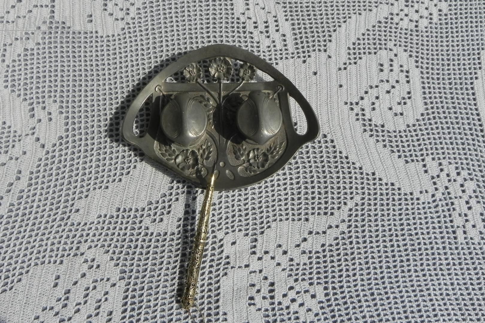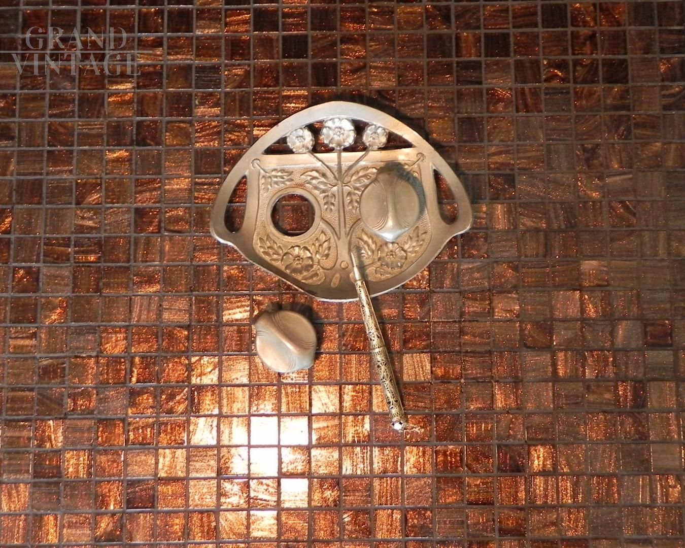 Elegante set da scrittura in stile art nouveau composto da un vassoietto con calamaio doppio in peltro e un pennino in argento finemente cesellato, una bella riproduzione del '900. I due contenitori per inchiostro sono dotati di coperchio, il pennino in argento è molto raffinarto e lavorato tipo uncinetto.