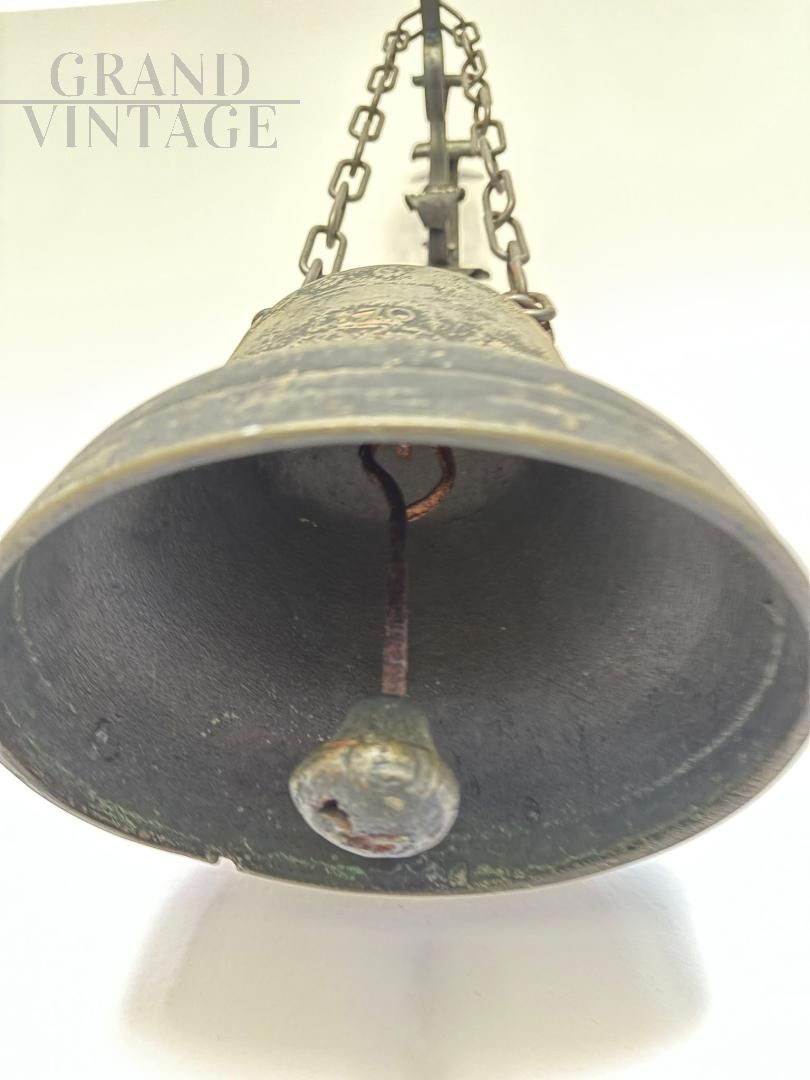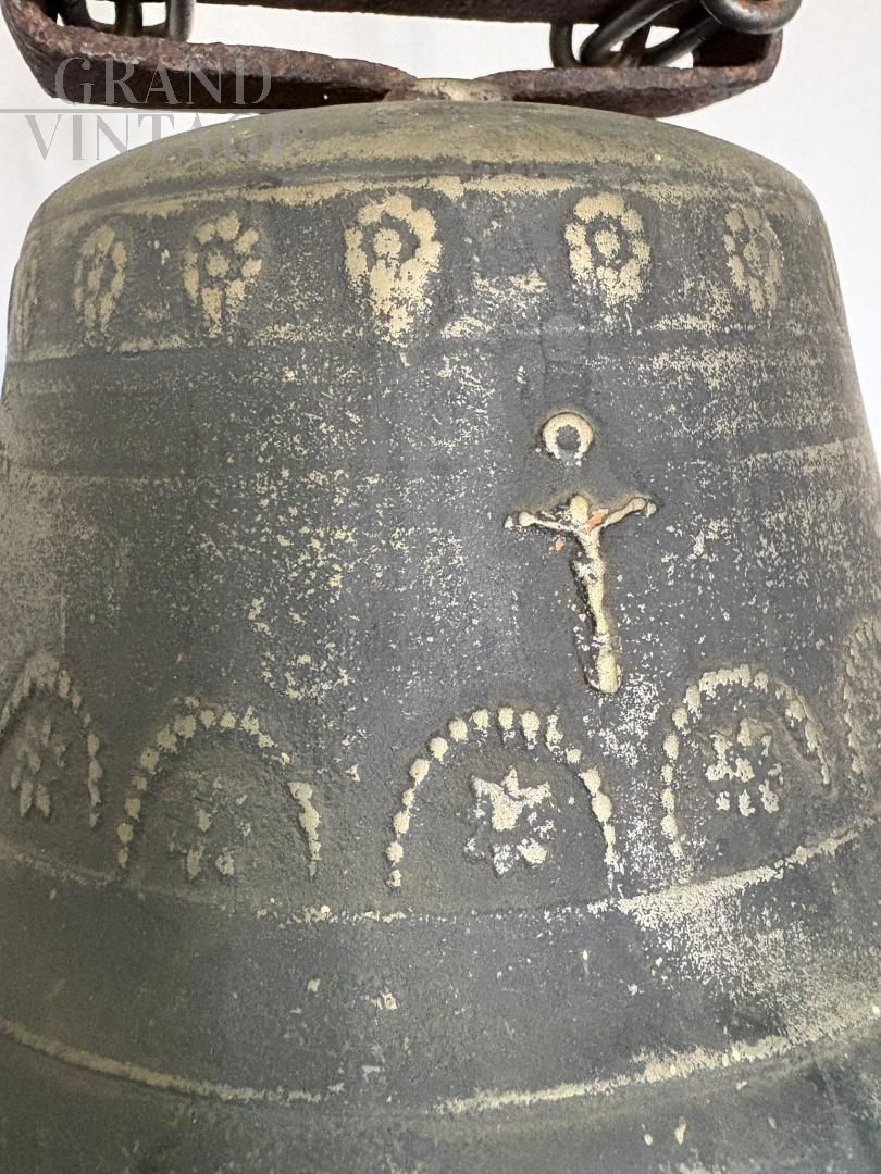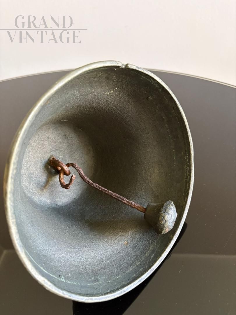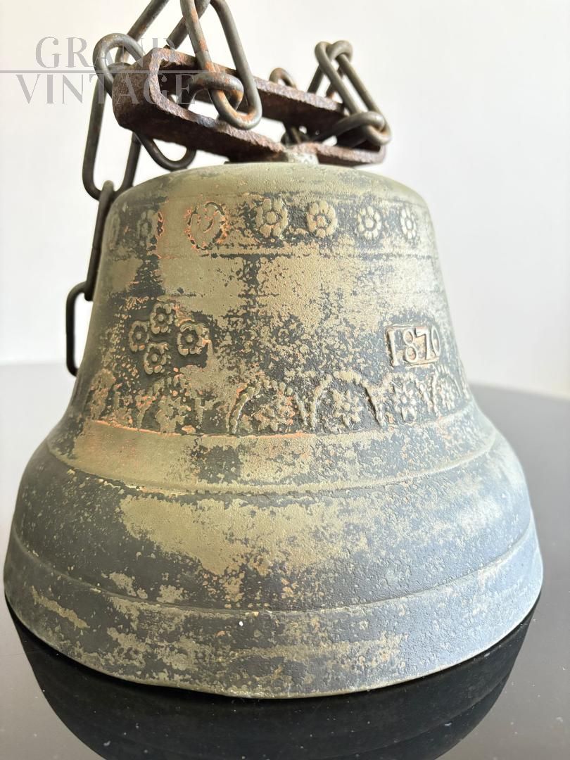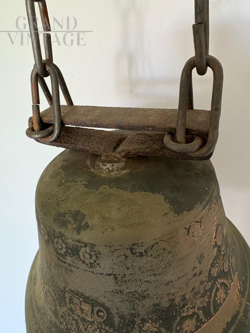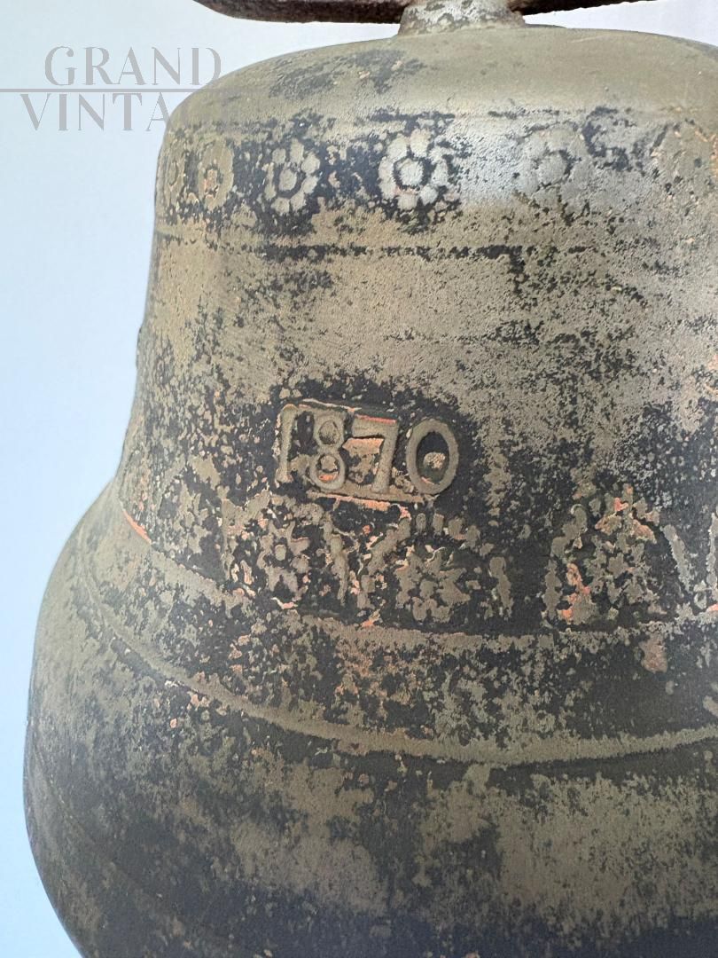 Campana originale antica in bronzo, datata 1870, realizzata in Italia. Presenta una raffinata decorazione floreale a rilievo e un’elegante patina naturale che ne testimonia l’autenticità e l’età. Pezzo storico dal grande fascino, ideale per collezionisti, ambientazioni d’epoca, giardini o spazi rustici. Solida e ben conservata, rappresenta un raro esempio di artigianato ottocentesco italiano.