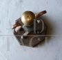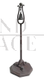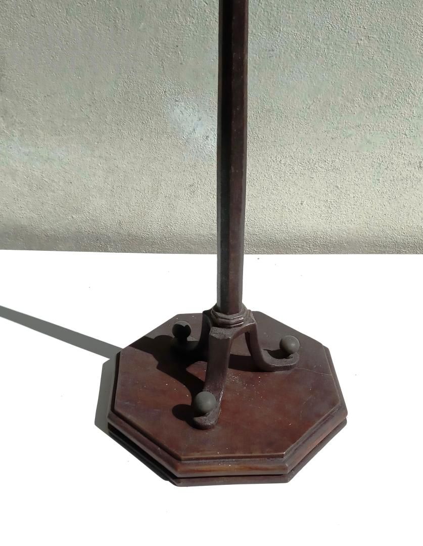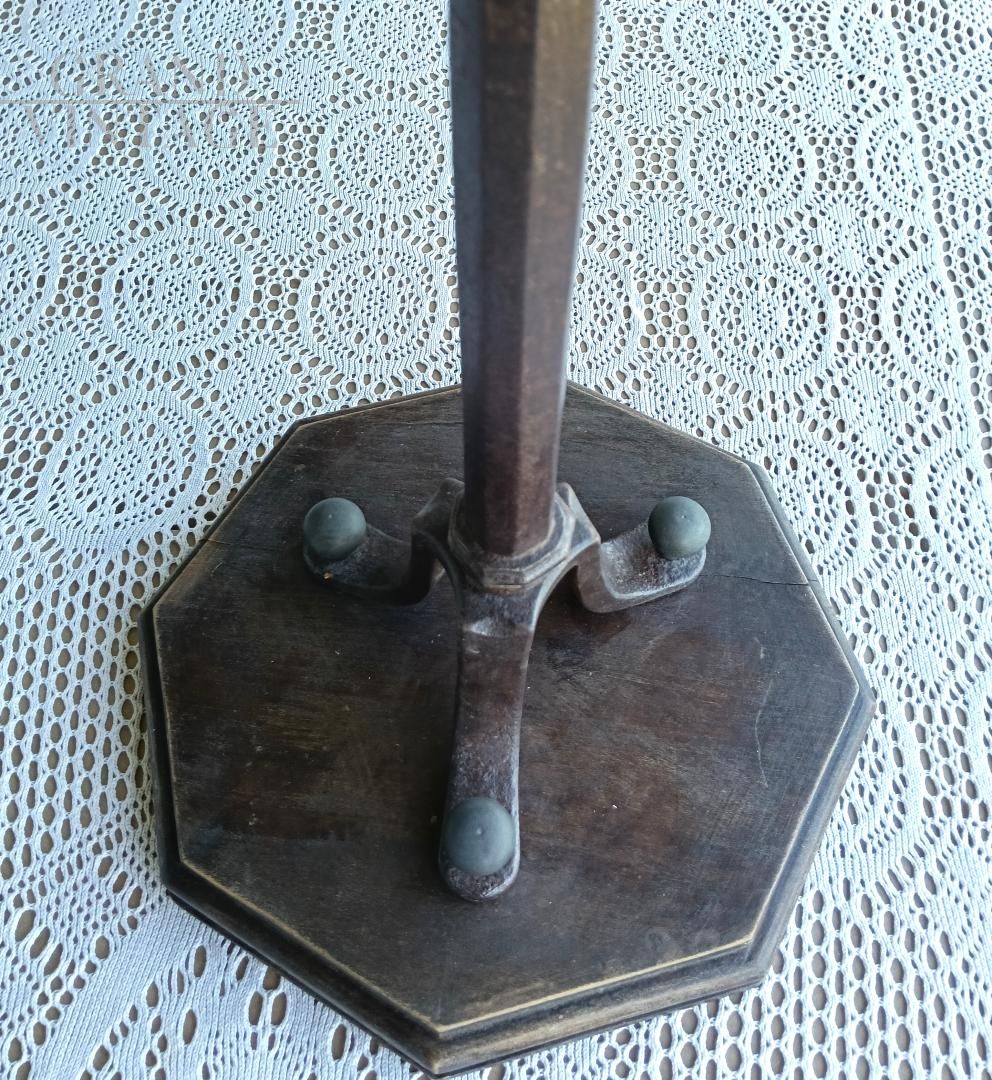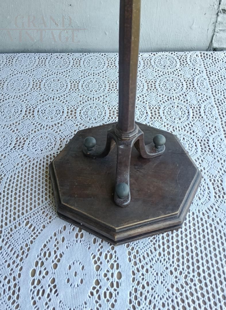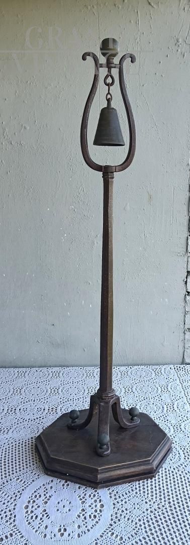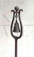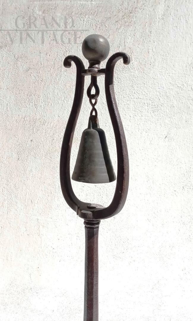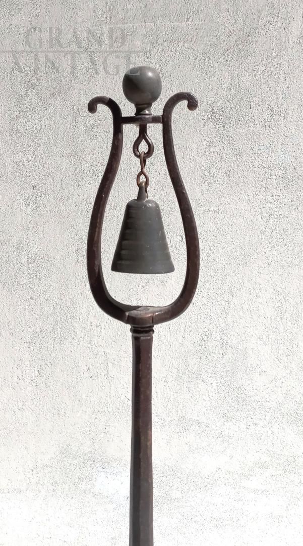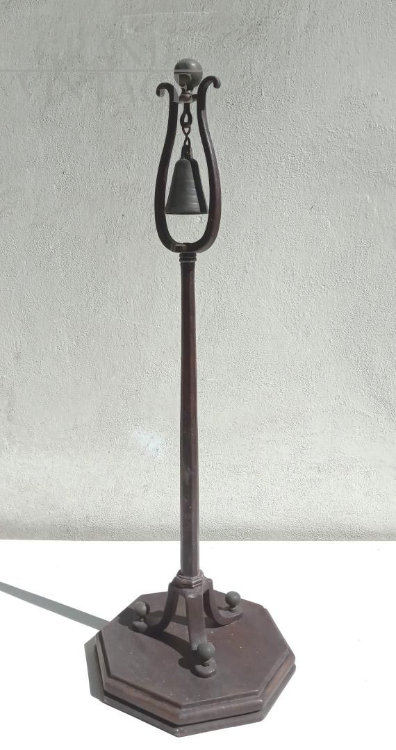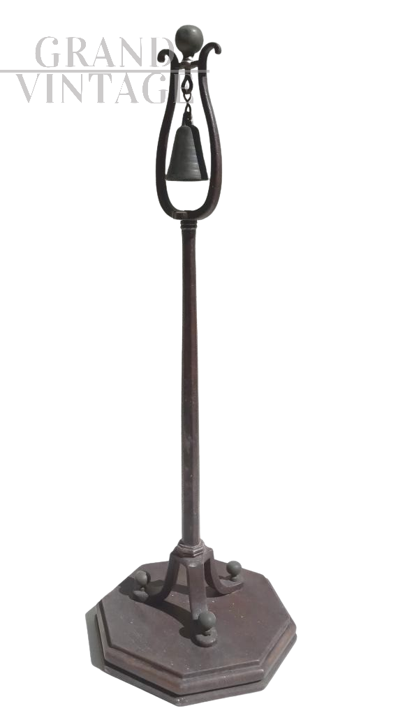 Campanella di servizio a colonna degli anni '20 utilizzata nel refettorio di un convento per avvisare i monaci del pasto pronto. Non ha il battacchio, ma emette un bel suono agitandola sui supporti metallici di sostegno. Il pomolo e di ottone, la parte metallica in ferro battuto finemente lavorato. La base invece è in legno di castagno, probabilmente sostituita in epoche recenti. Le condizioni generali sono ottime, l'oggetto risulta stabile ed adatto all'utilizzo.