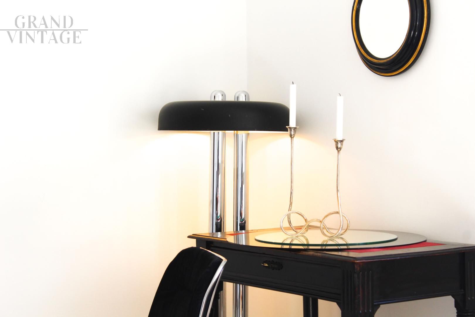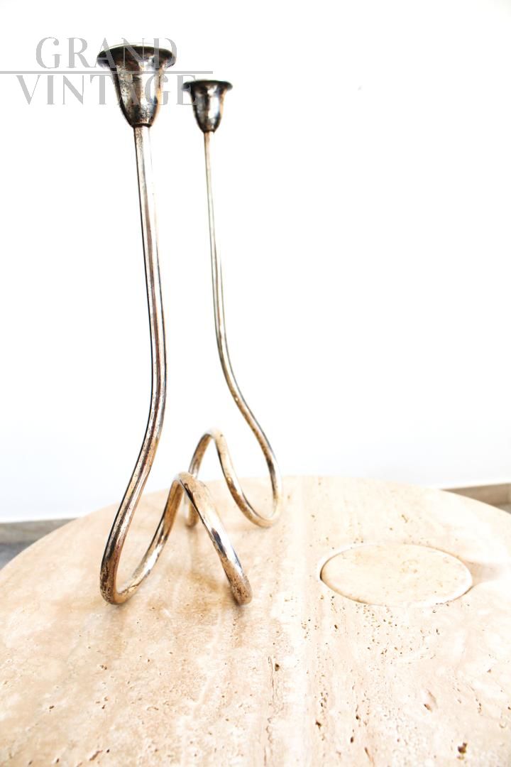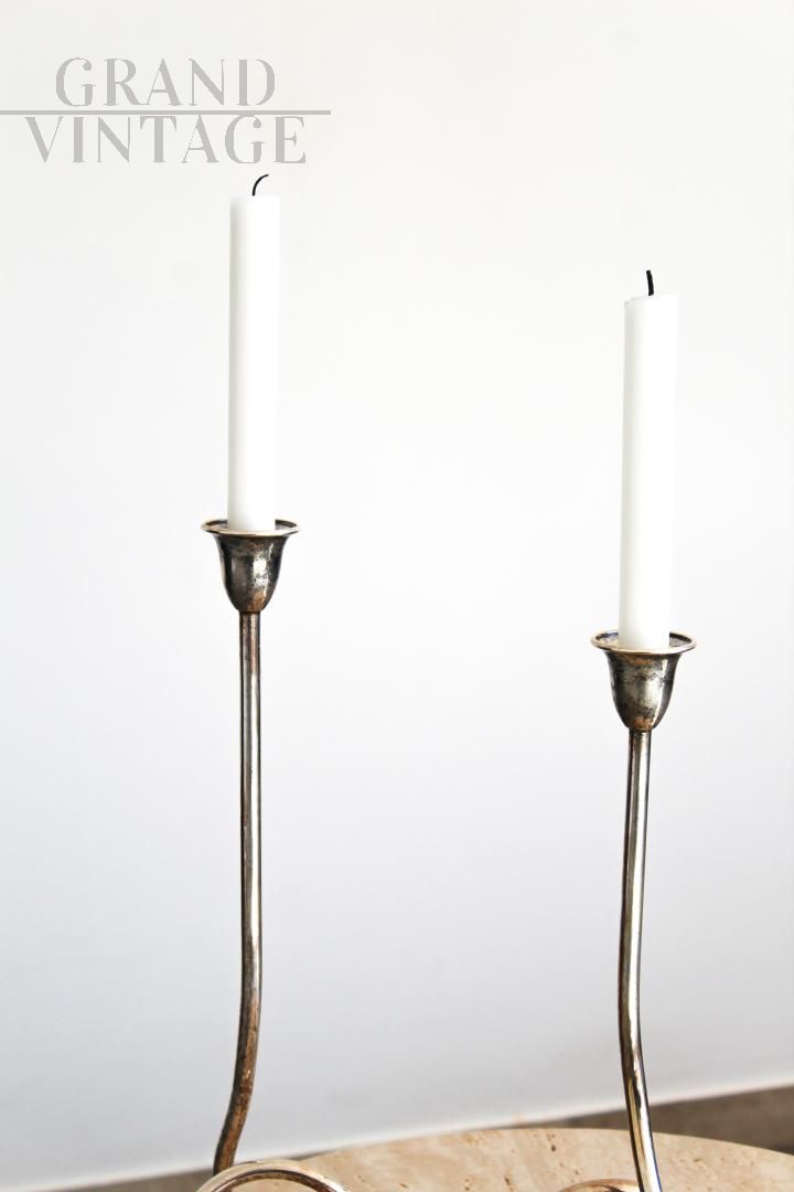 Candelabro in argento Sheffield a 2 candele, Italia anni '70, in ottime condizioni, molto elegante e di aspetto minimal.
