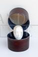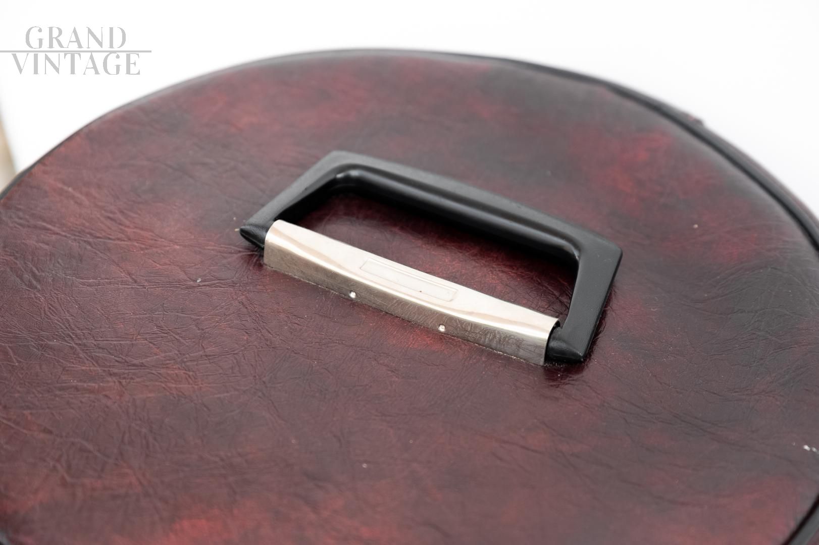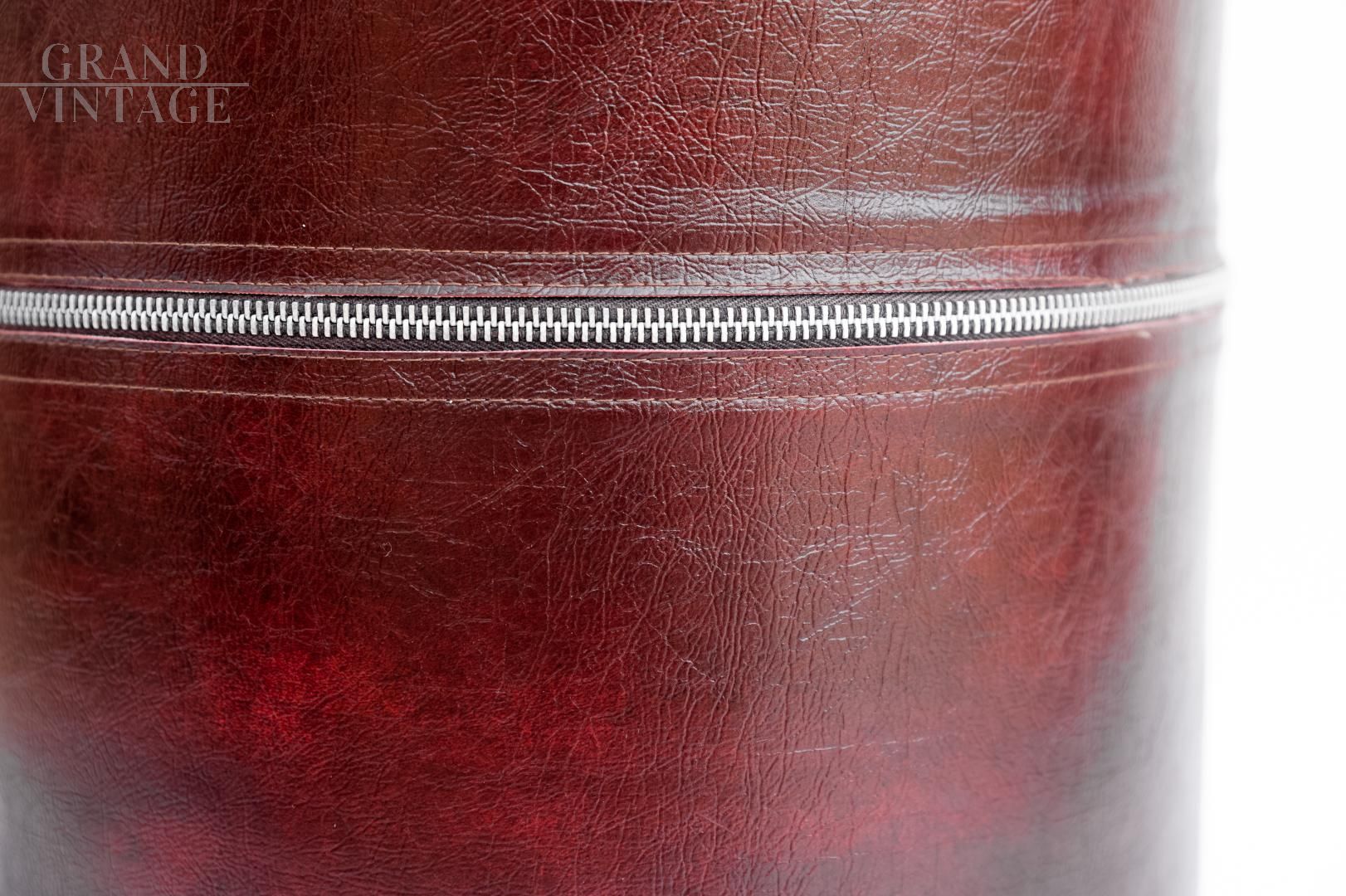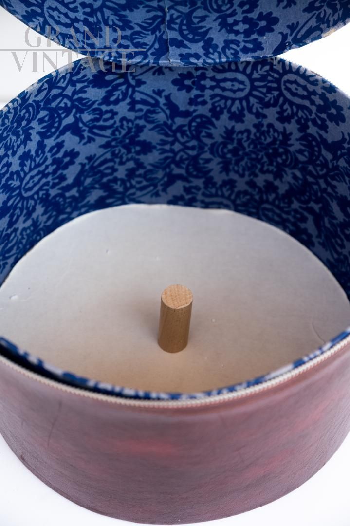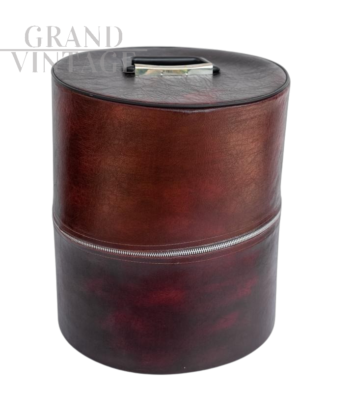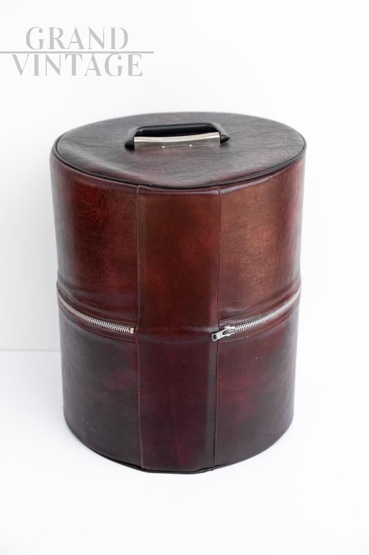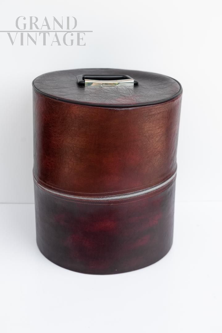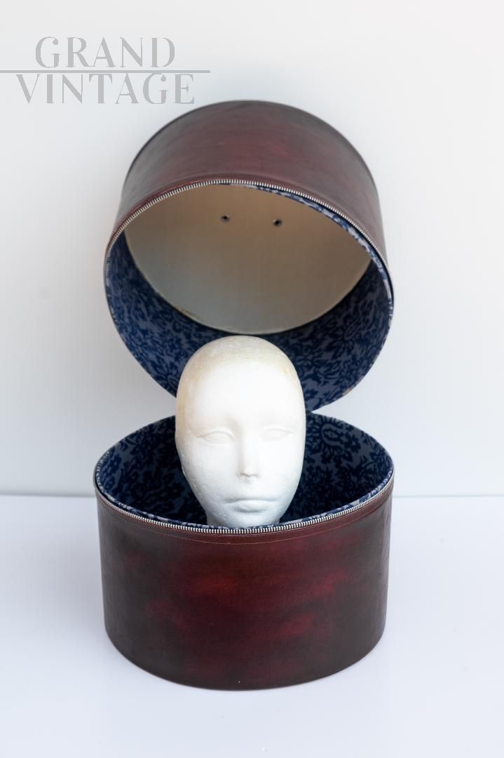 Cappelliera vintage porta cappelli e porta parrucche in finta pelle skai color marrone a forma cilindrica, con chiusura a zip. All'interno contiene una testa in polistirolo per parrucca. Prodotto in ottime condizioni.