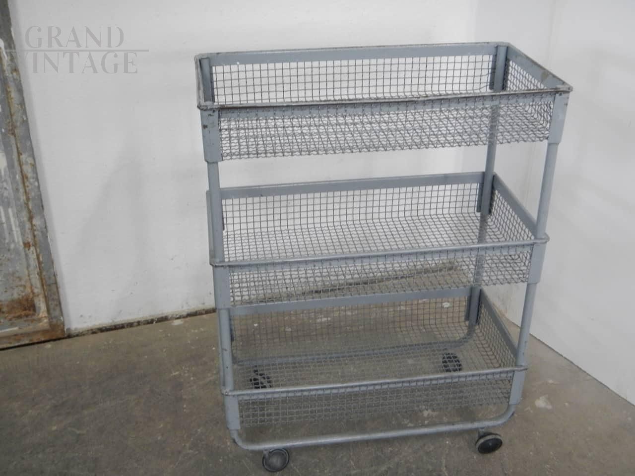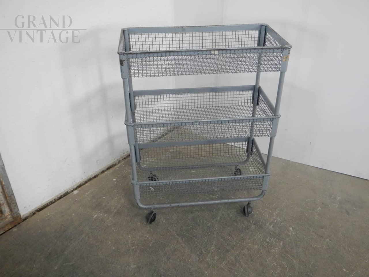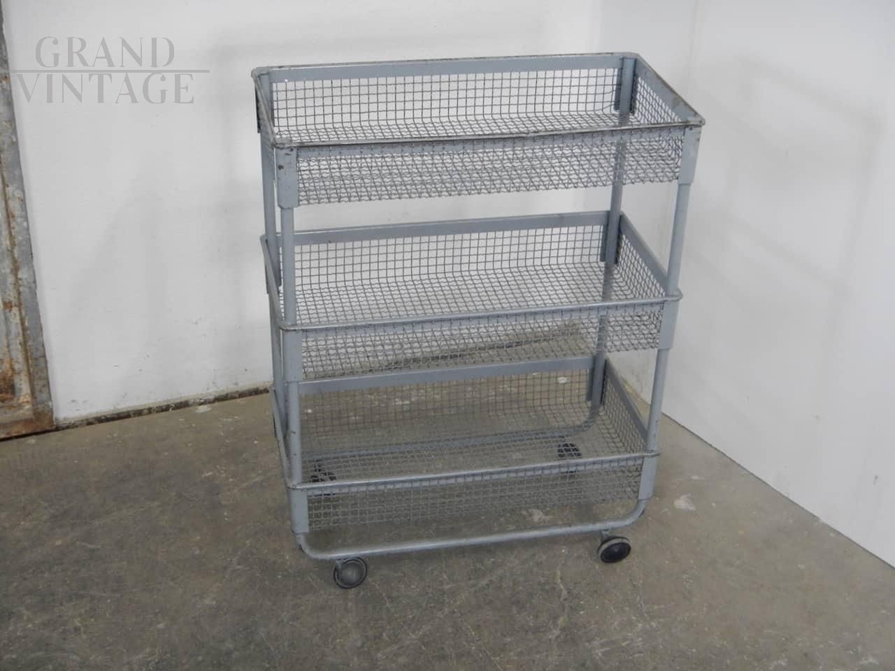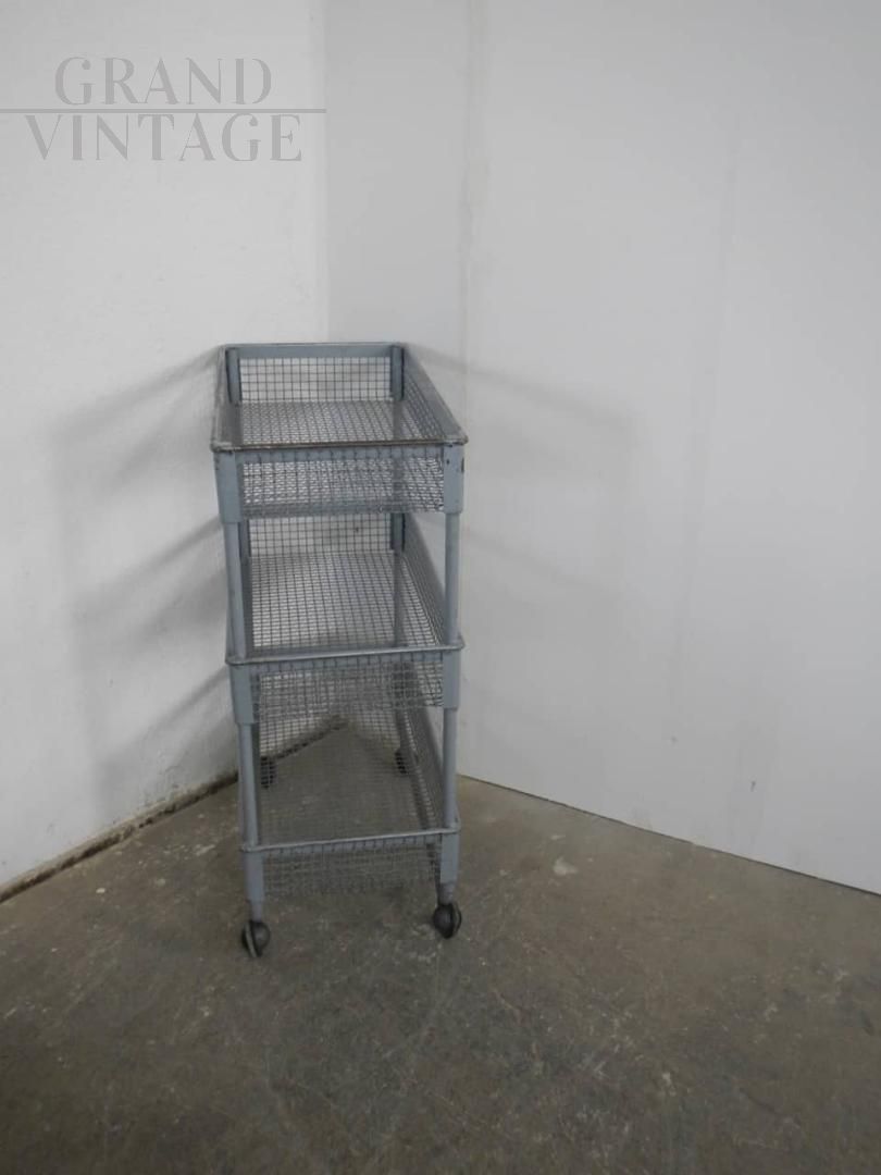 Carrellino espositore industriale con ruote e ceste contenitori in rete metallica grigia. Le ceste misurano 59 x 29 x altezza 9 cm, e lo spazio tra l’una e l’altra è di 29 cm. Le ruote sono originali. In buone condizioni, con segni d’uso.
