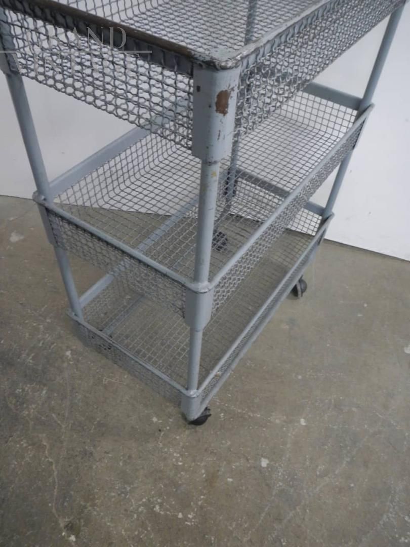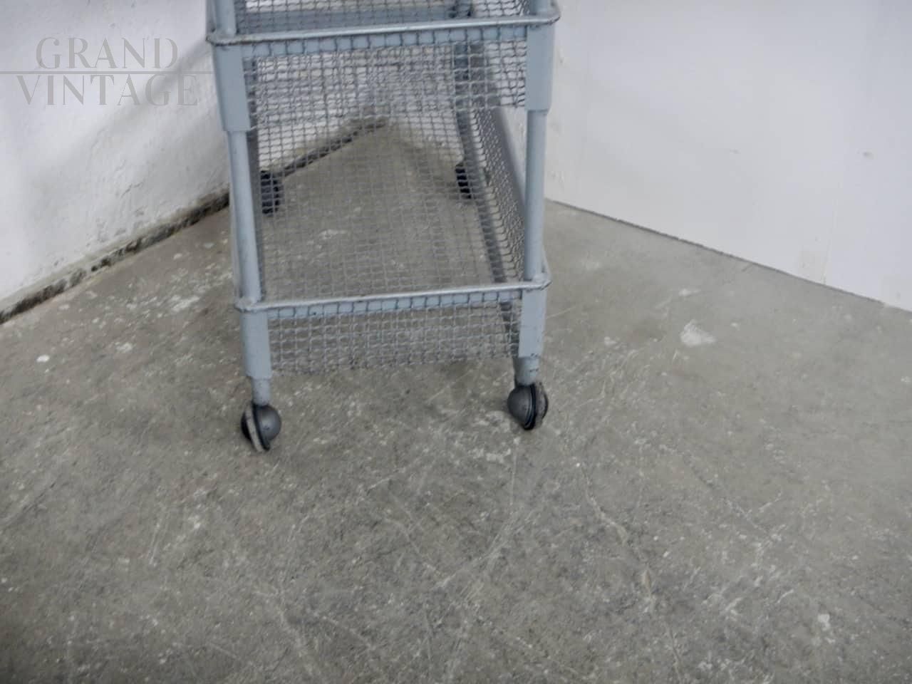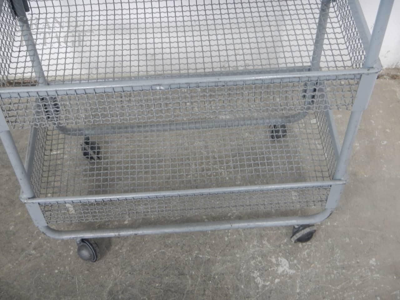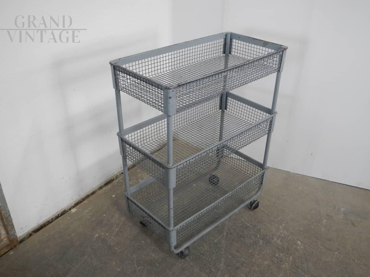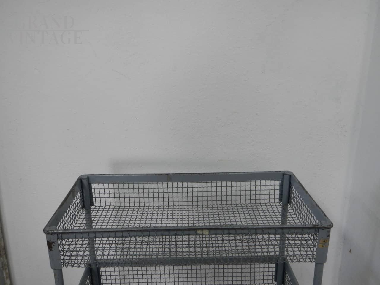 Carrellino espositore industriale con ruote e ceste contenitori in rete metallica grigia. Le ceste misurano 59 x 29 x altezza 9 cm, e lo spazio tra l’una e l’altra è di 29 cm. Le ruote sono originali. In buone condizioni, con segni d’uso.