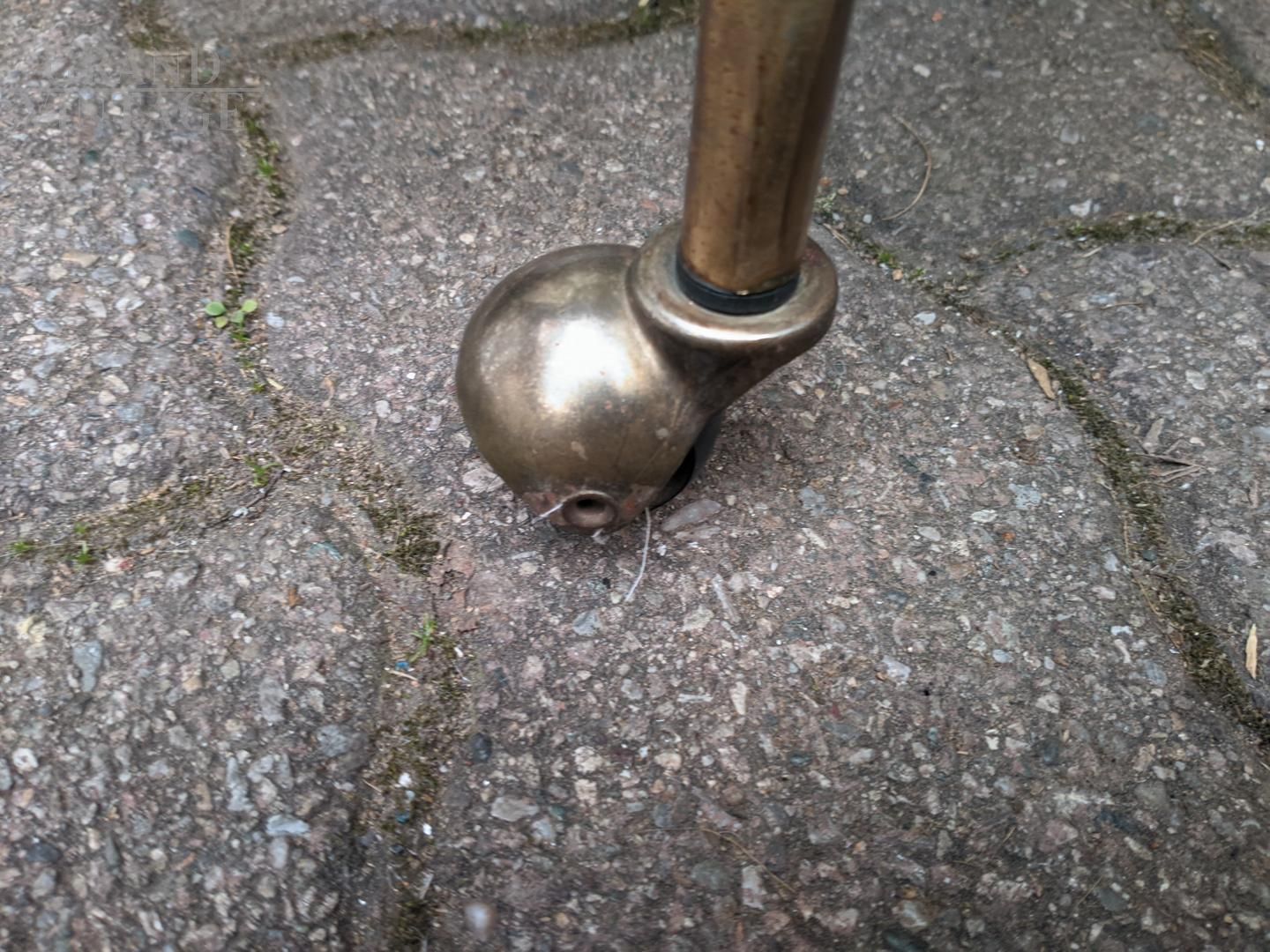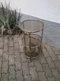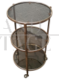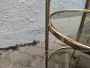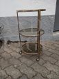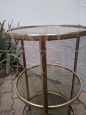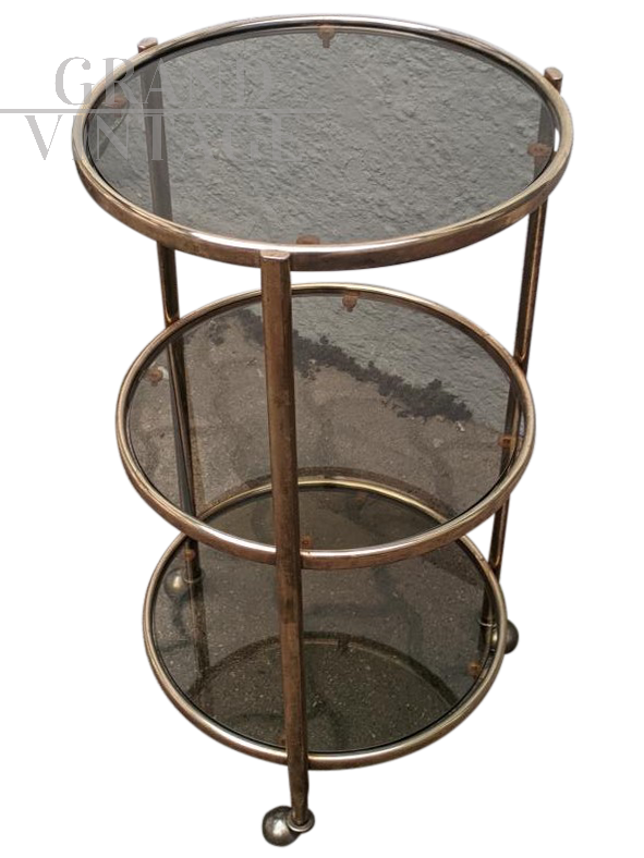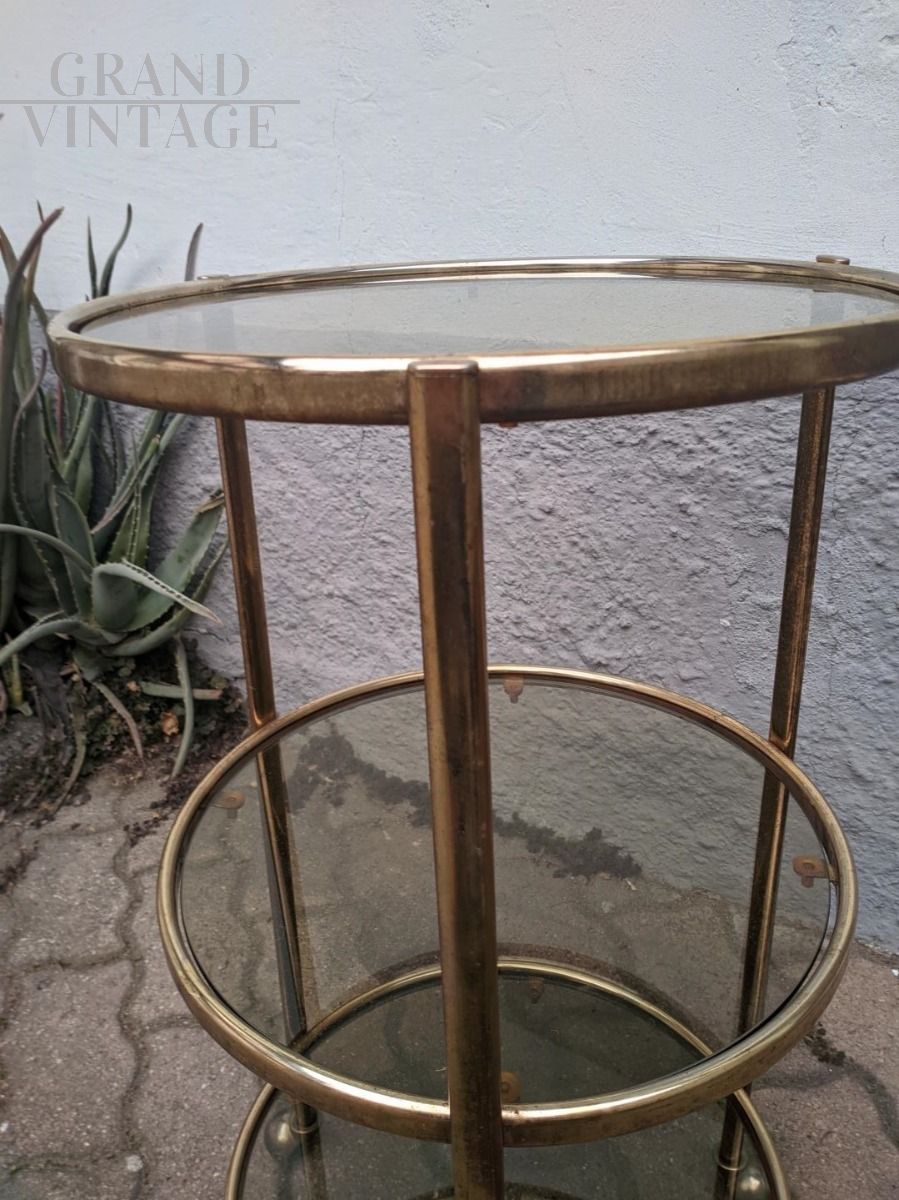 Particolare tavolino étagère vintage con rotelle, con struttura completamente in ottone, comprese le ruote, e ripiani in cristallo fumé. Databile 1960 circa.