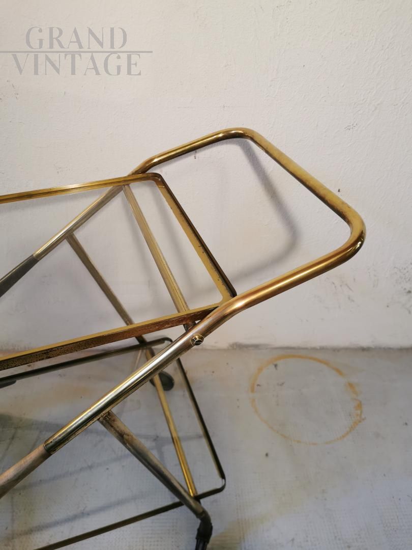 Carrellino in ottone e legno, anni '50, con portabottiglie.