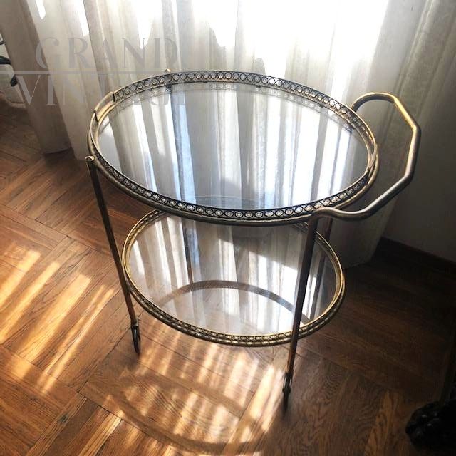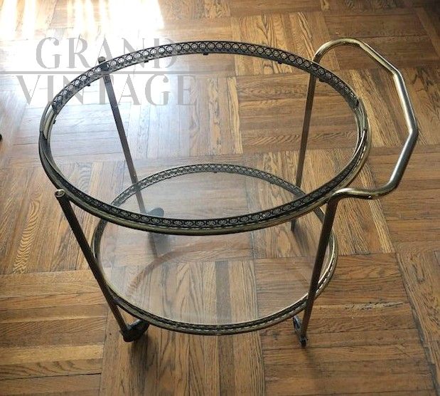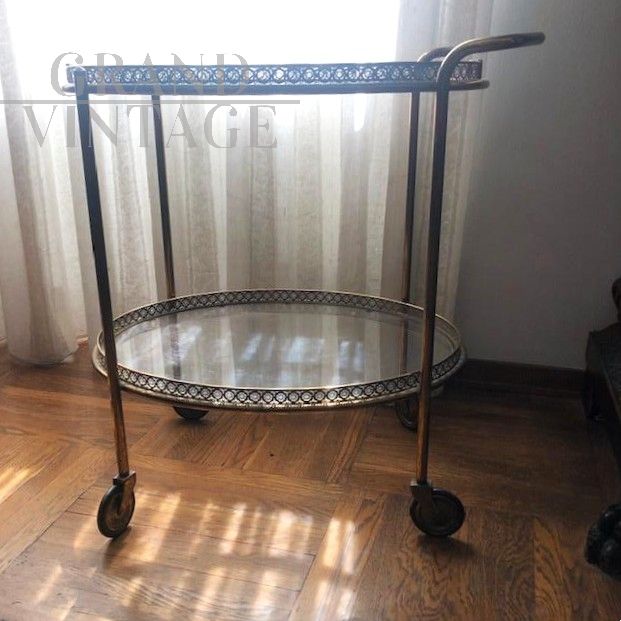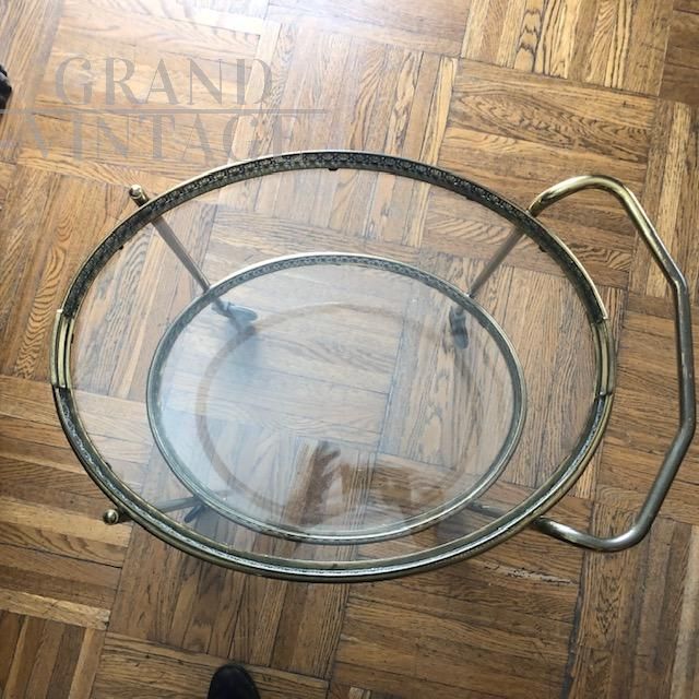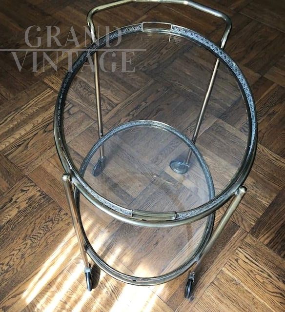 Carrello da servizio vintage degli anni '70 di forma ovale con struttura in ottone e doppio piano in vetro, il piano superiore diventa un pratico vassoio asportabile.