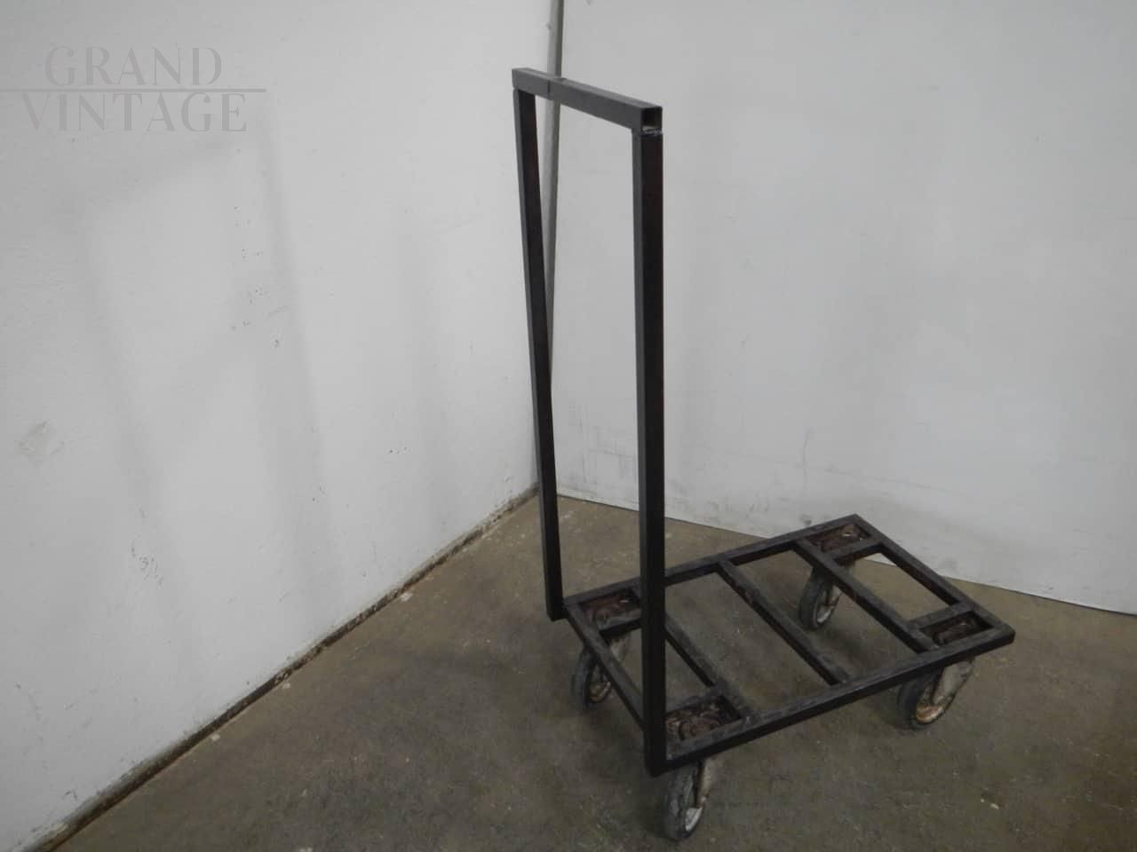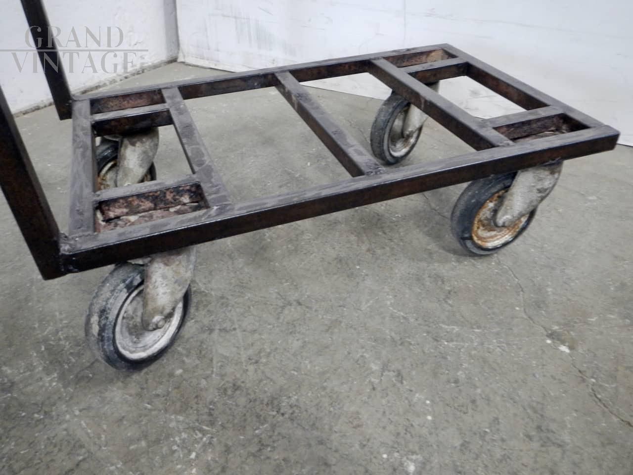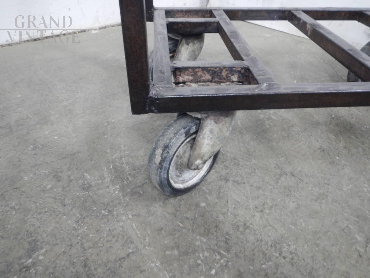 Carrello industriale vintage in ferro proveniente da una fabbrica di stampe per ceramiche, con ruote originali, adatto per il giardino. Trattato con vernice da ferro in buone condizioni e funzionante. Altezza piano cm 19.