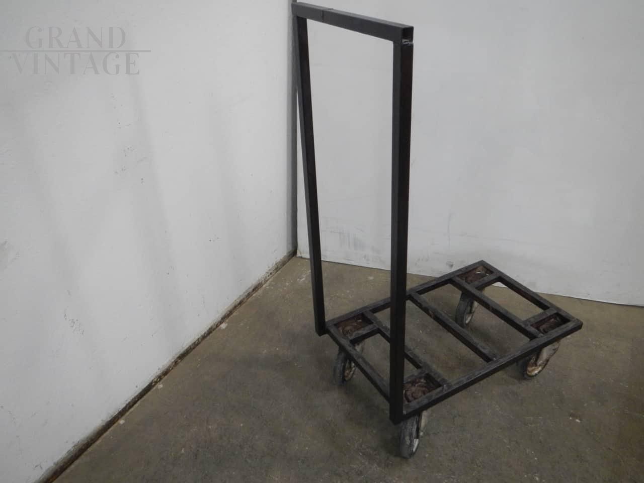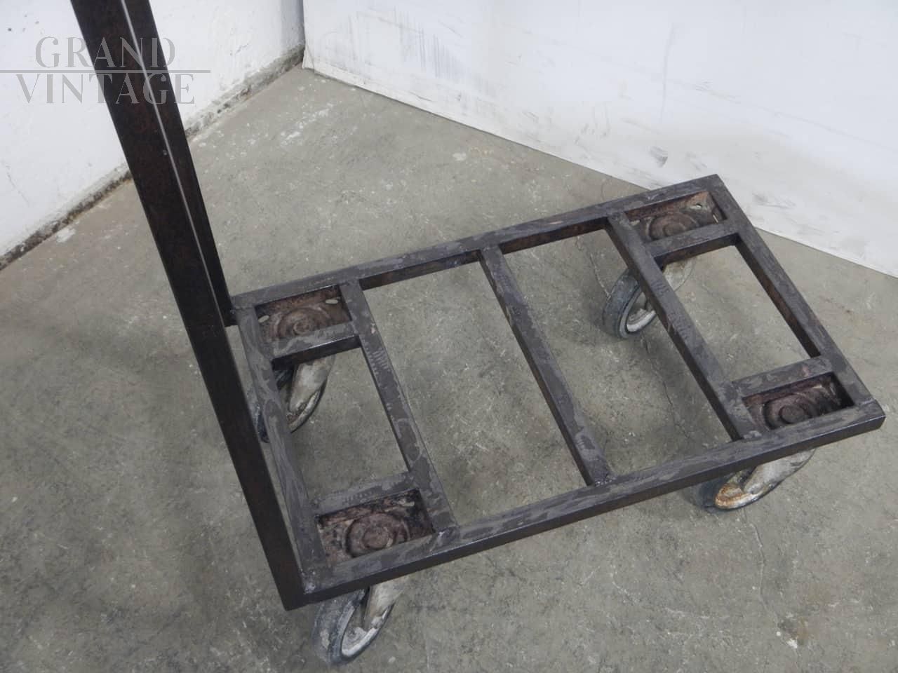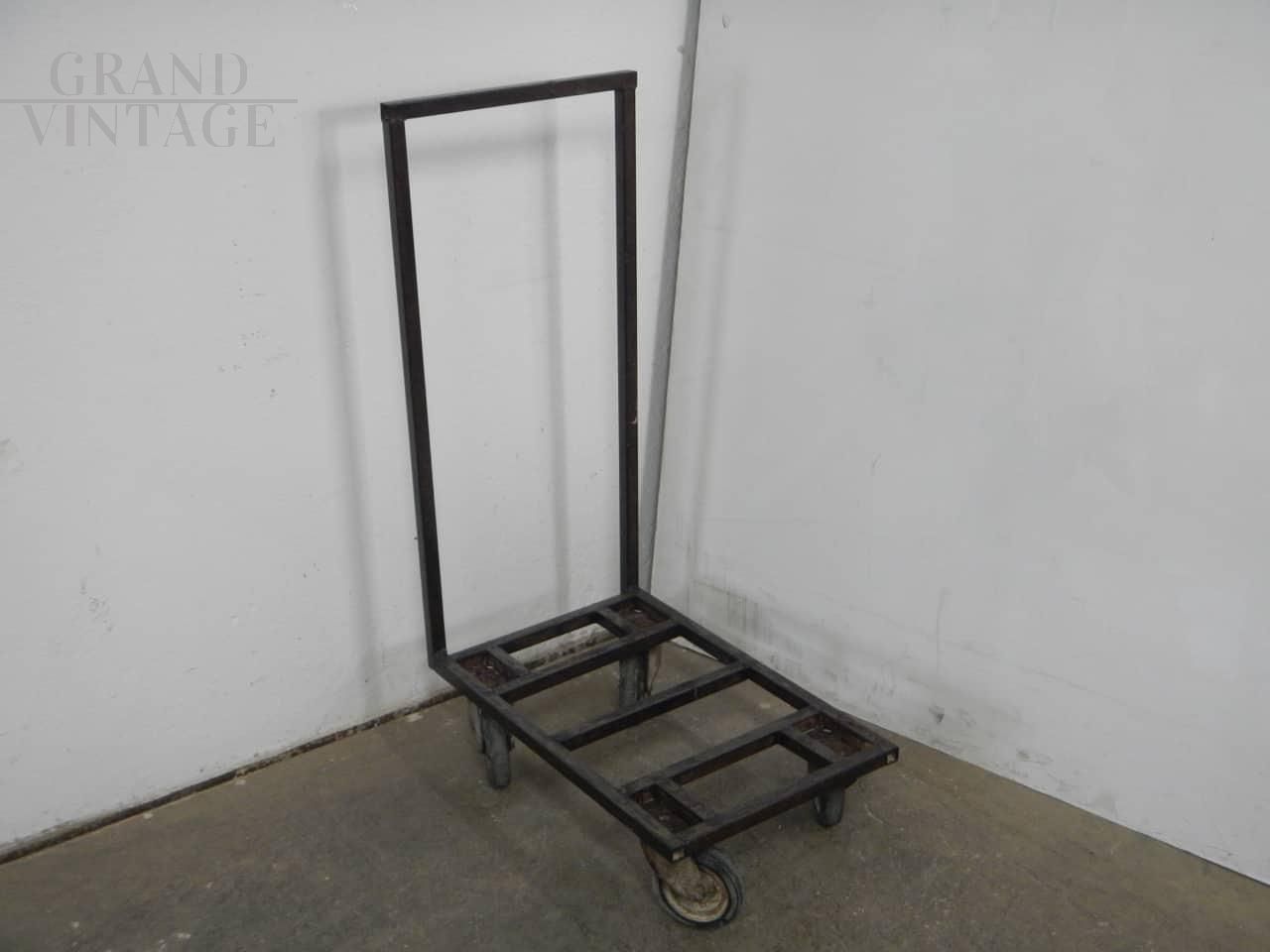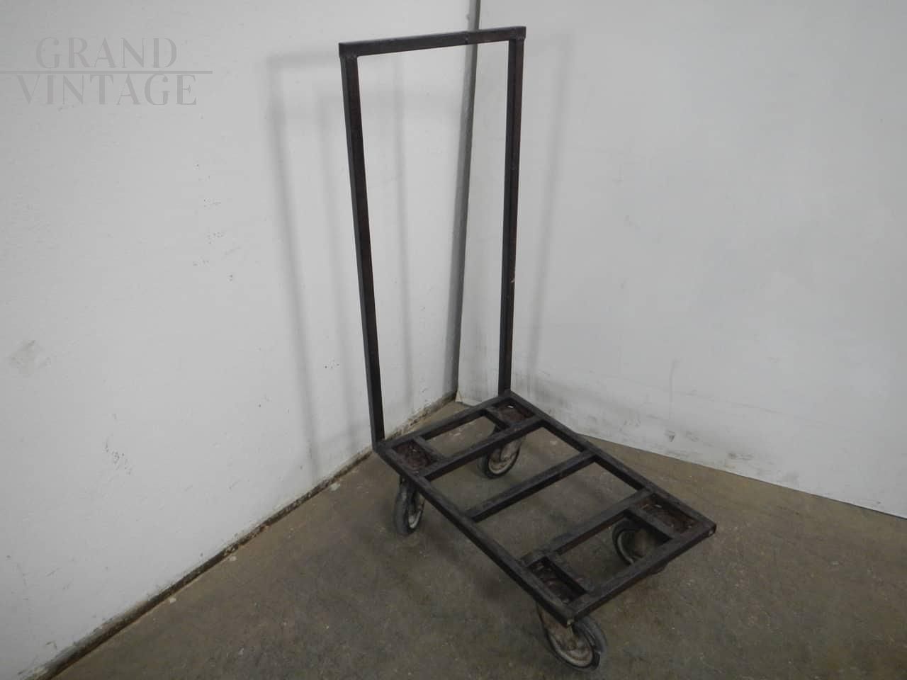 Carrello industriale vintage in ferro proveniente da una fabbrica di stampe per ceramiche, con ruote originali, adatto per il giardino. Trattato con vernice da ferro in buone condizioni e funzionante. Altezza piano cm 19.