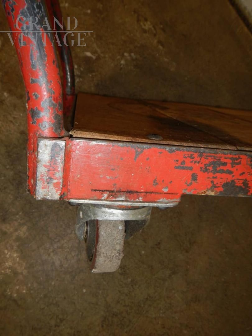 Carrello industriale anni '70 con struttura in metallo laccato rosso, con ruote e piano in legno di rovere.