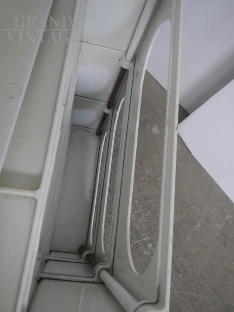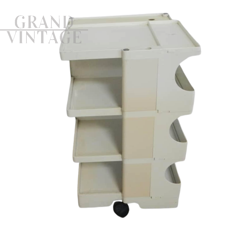 Carrello portaoggetti per ufficio modello Boby di Joe Colombo per Bieffeplast in plastica bianca avorio, Made in Italy, con 4 ripiani e vari scomparti, completo di firma e ruote originali. Il carrello presenta segni vari nella struttura, le barre di sostegno presentano segni di usura con ruggine.