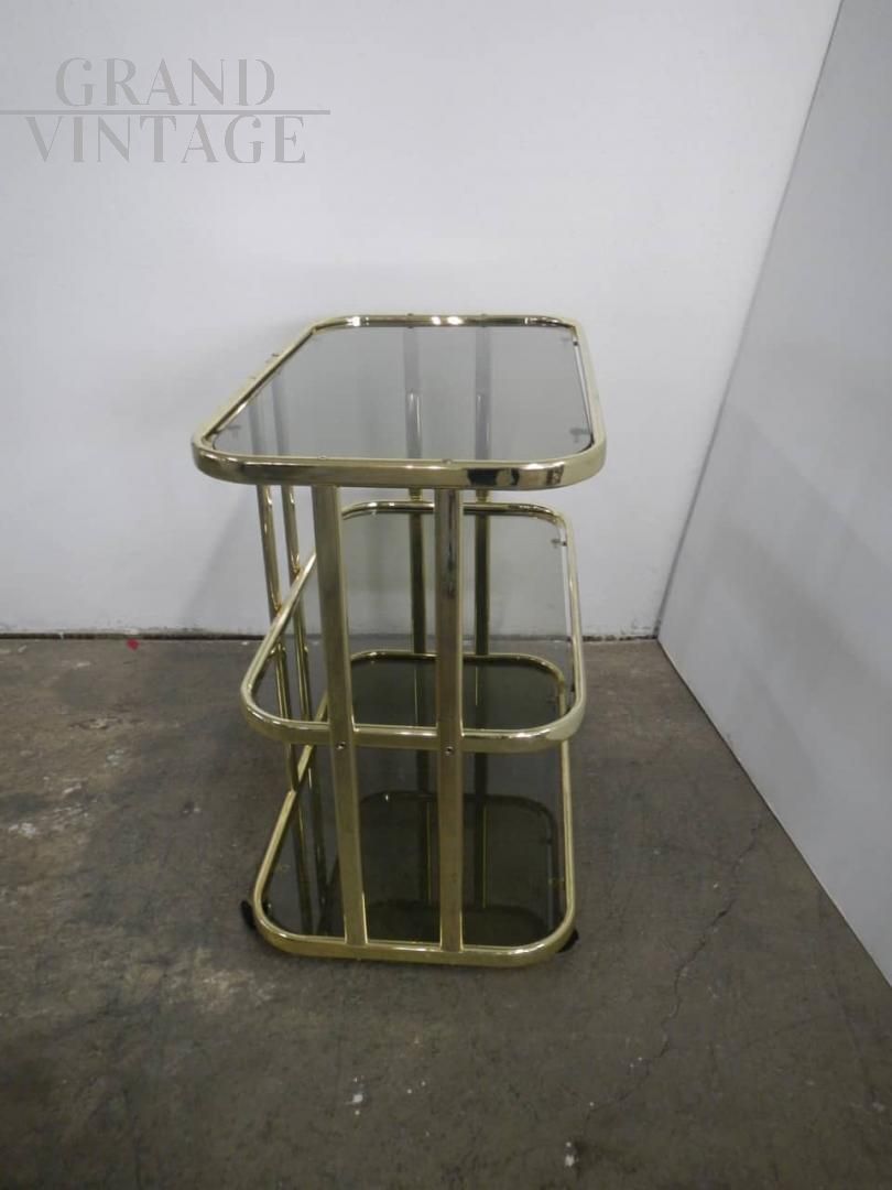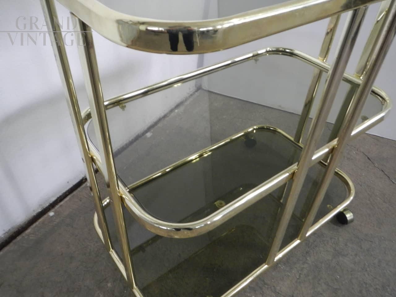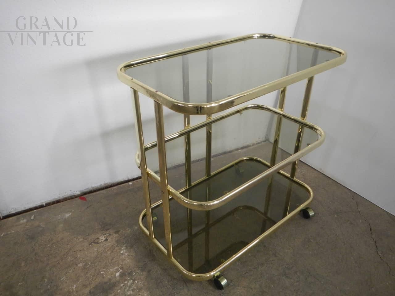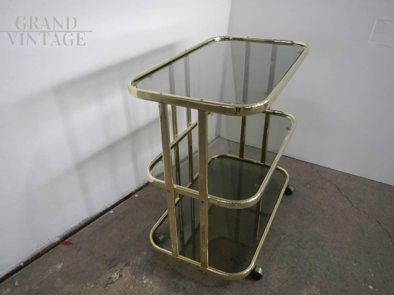 Carrello vintage in metallo ottonato con piani in vetro fumé, anni '70