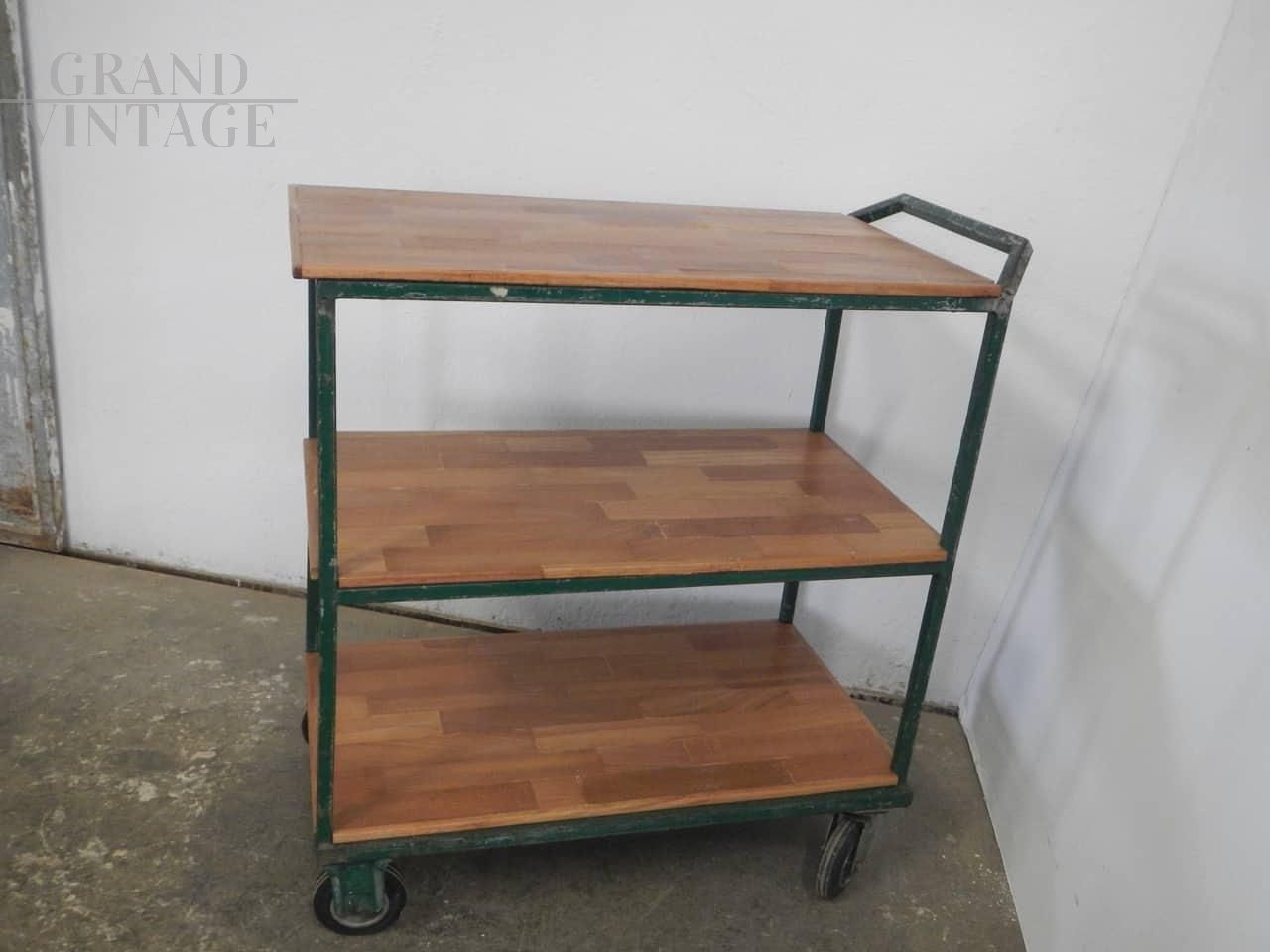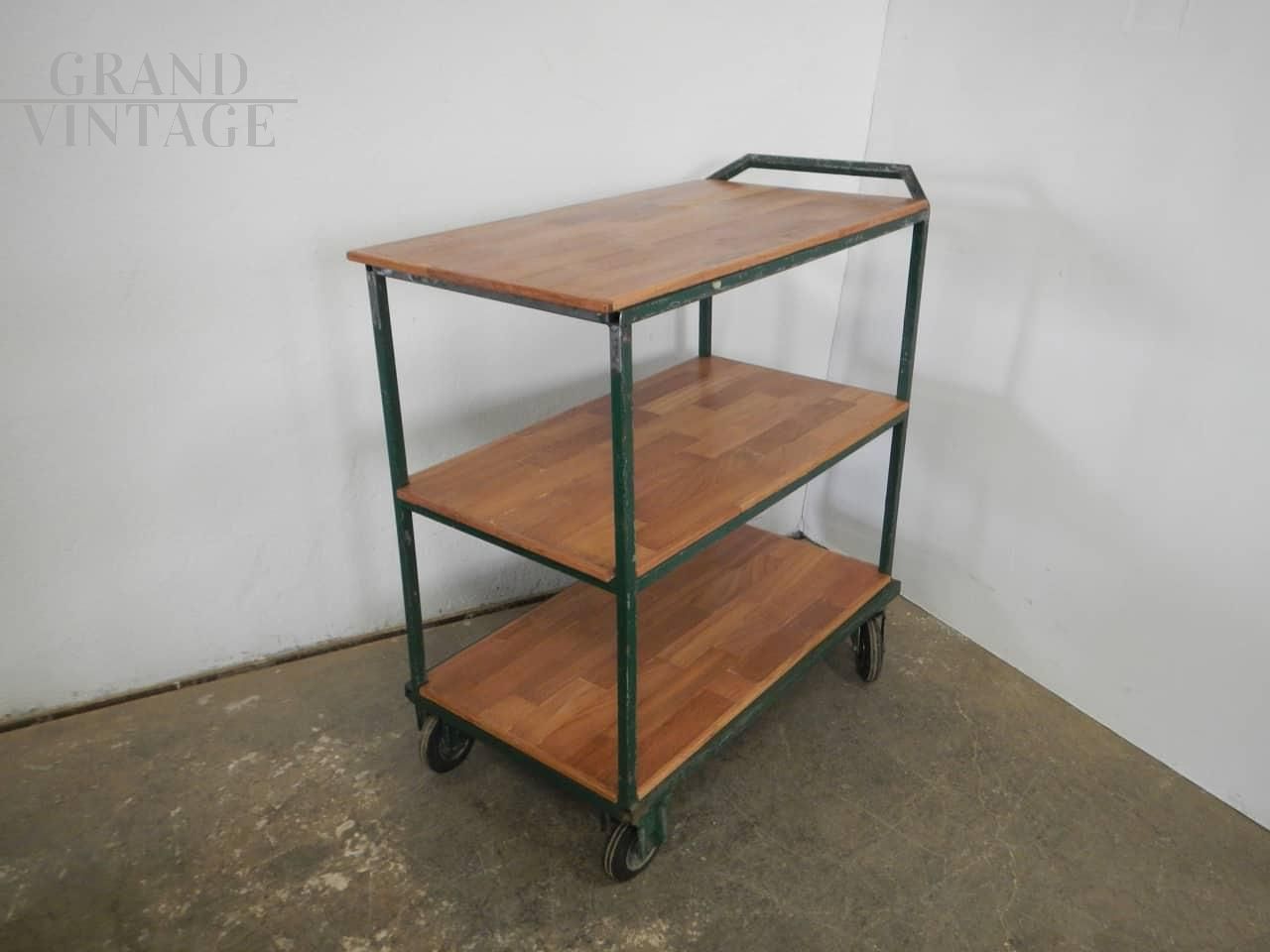 Carrello industriale da officina in ferro colorato verde con ripiani in legno di quercia. La distanza tra i ripiani è di cm 32, e le mensole sono lunghe cm 82 - 83. Dotato di manico per lo spostamento. Le ruote sono originali: le anteriori sono girevoli, le posteriori fisse. Trattato con vernice da ferro.