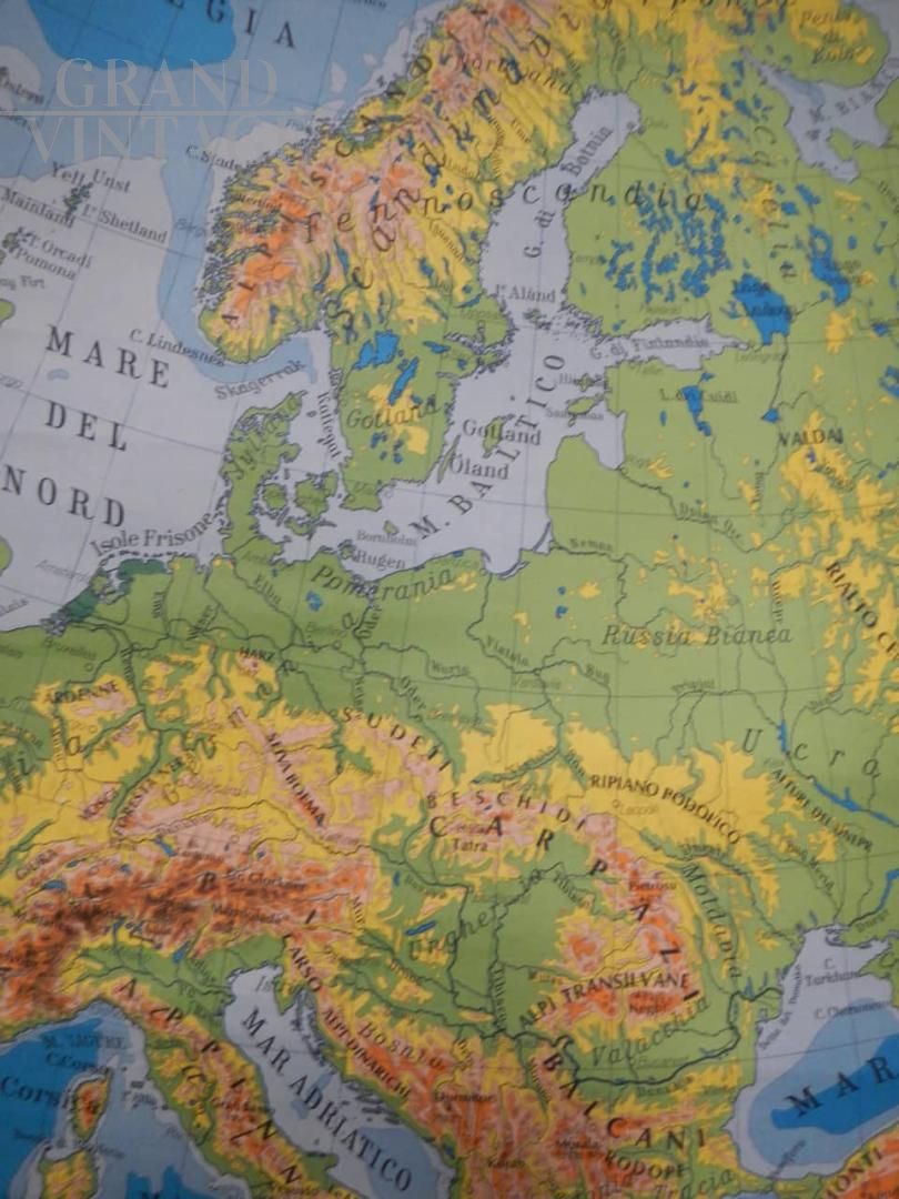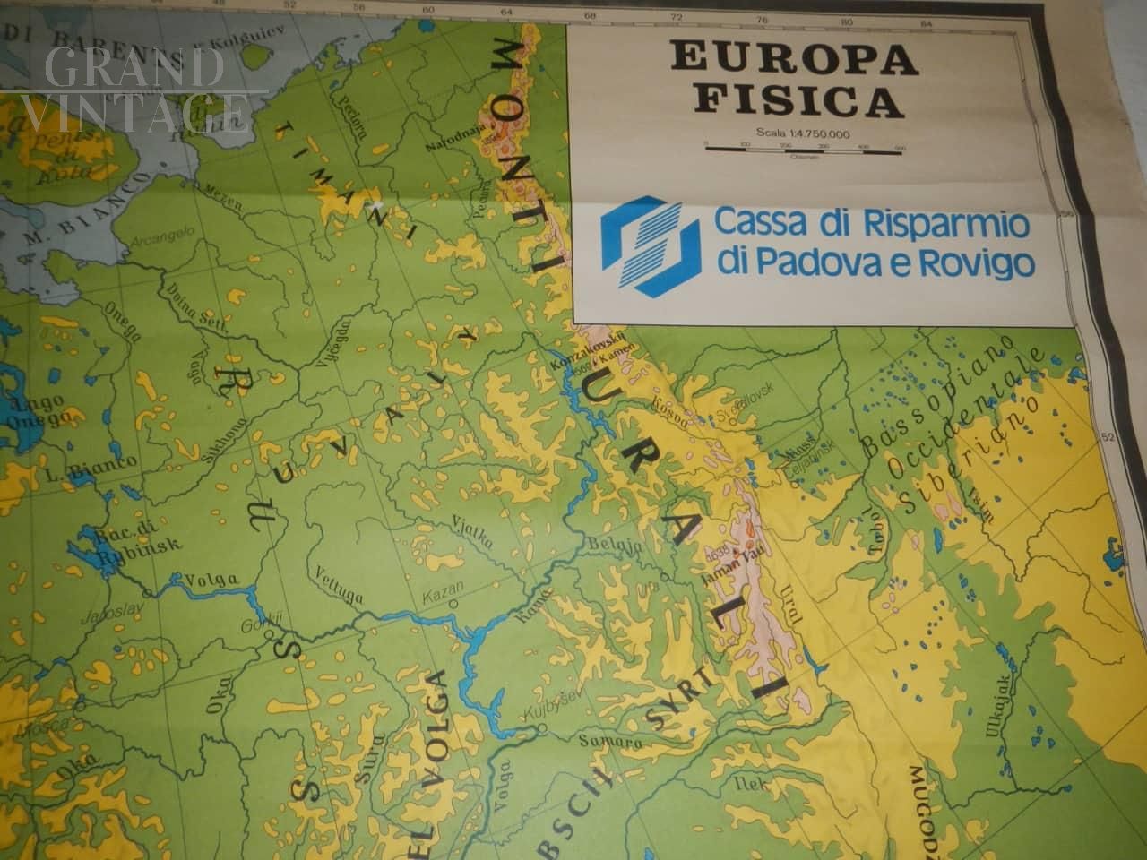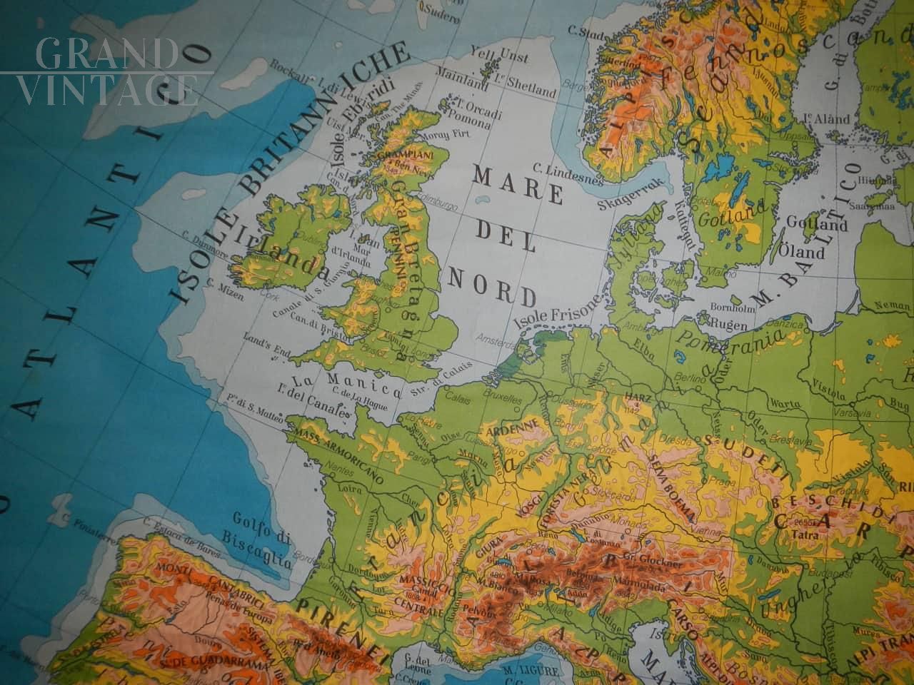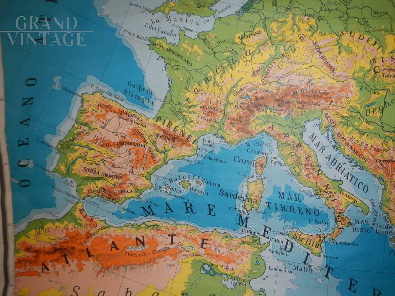Cartina vintage dell’Europa fisica prodotta da Vallardi Industrie Grafiche Lainate MI nel 1990, in buone condizioni, con segni d’uso e piccoli strappi riparati.