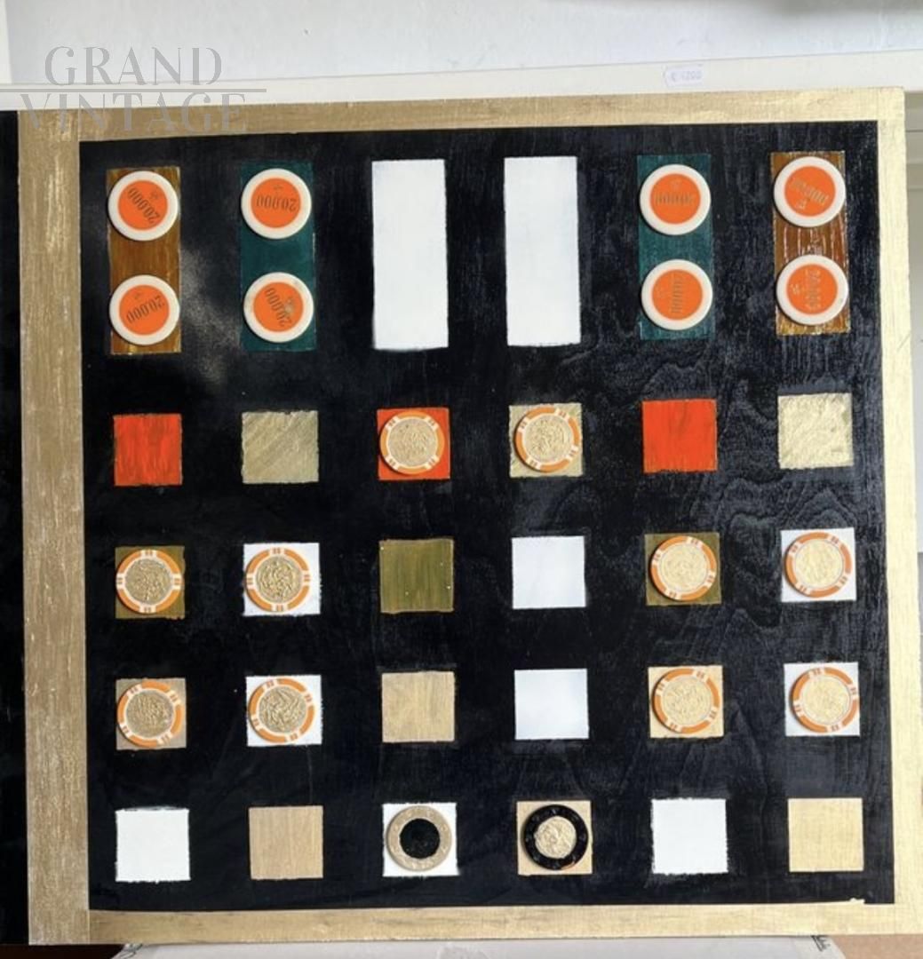 Dipinto astrattista del 2023 realizzato dall'artista siciliano Bruno Carlino (1952) su tavola con tempera, smalto e plastica, dal titolo Casinò. Un'opera originale in cui forme geometriche si fondono con vere e proprie fiches di plastica come su piccoli tavoli da gioco.