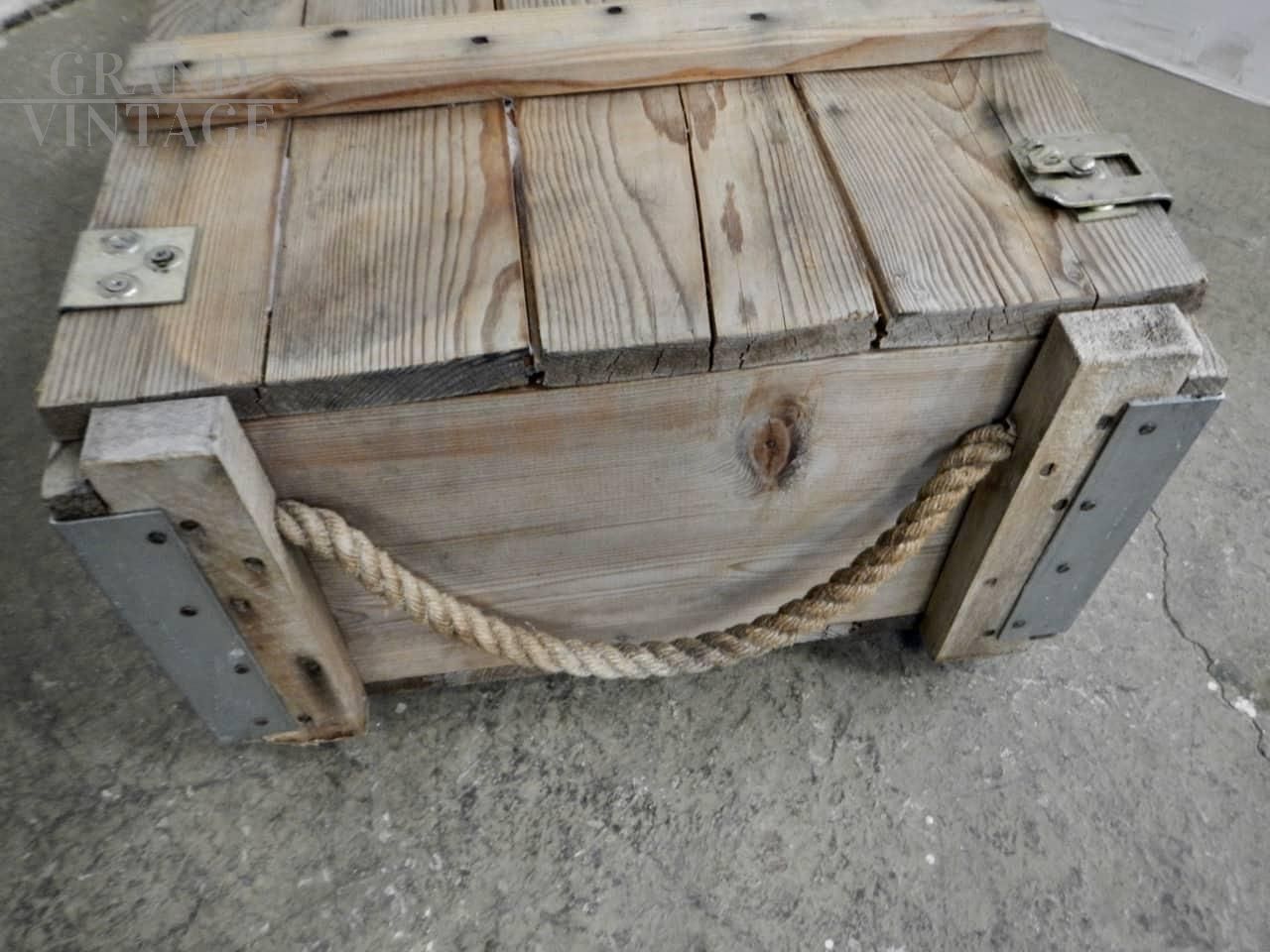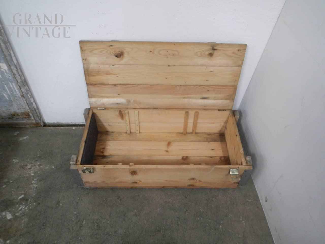 Cassa in legno di abete a listelli con manici in corda, vintage anni '80, chiusura particolare con cerniere. In buone condizioni.