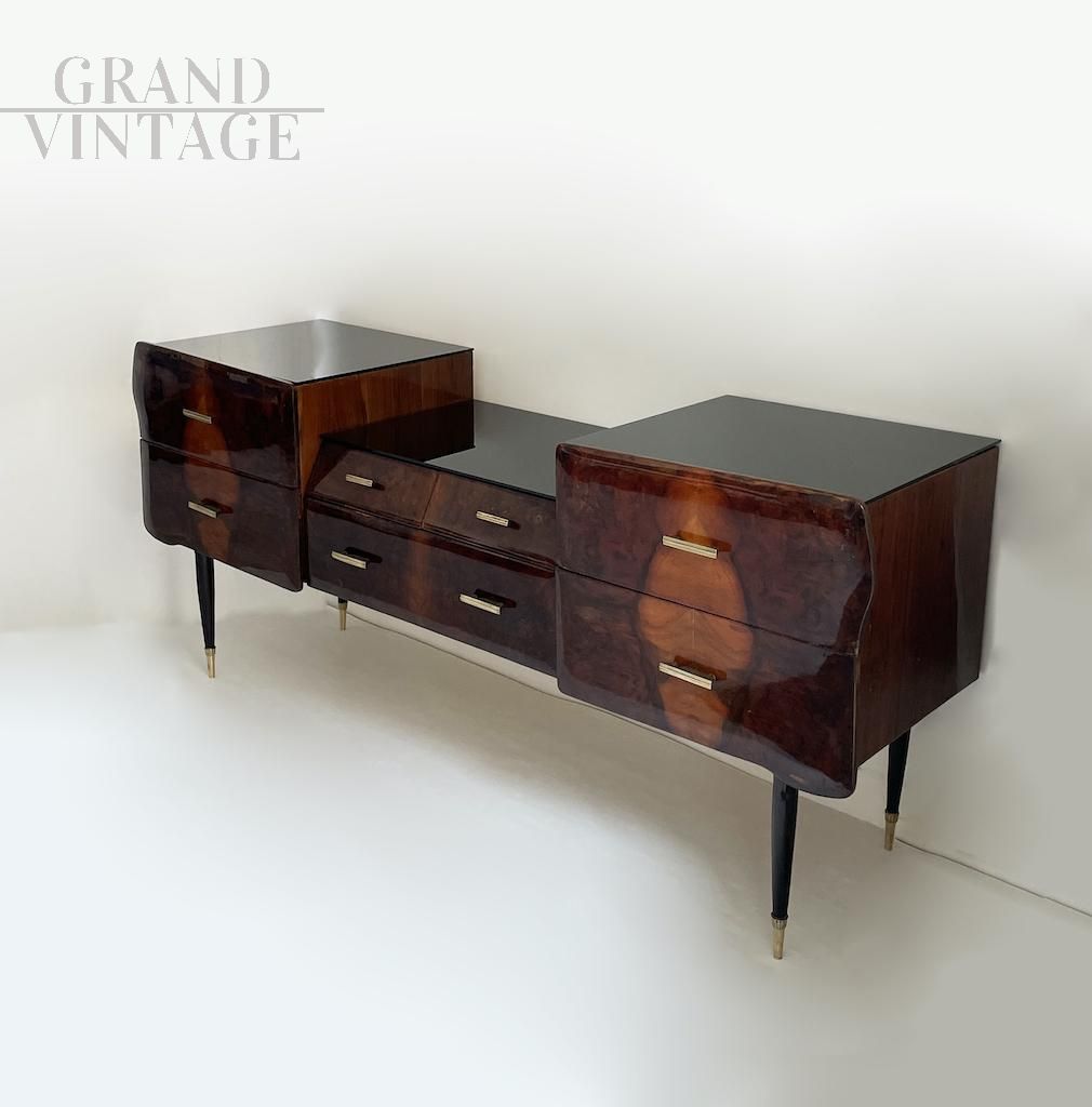 Particolare credenza buffet o cassettiera Art Déco dei primi anni '50. Il mobile presenta una struttura in legno, un piano in vetro colorato nero e maniglie dei cassetti in ottone. Caratterizzata da ben 7 cassetti di cui quattro laterali e quattro centrali con misure diverse. Eleganti gambe con punte in ottone. Presenta normali e leggeri segni d'usura dovuti all'età e all'utilizzo.