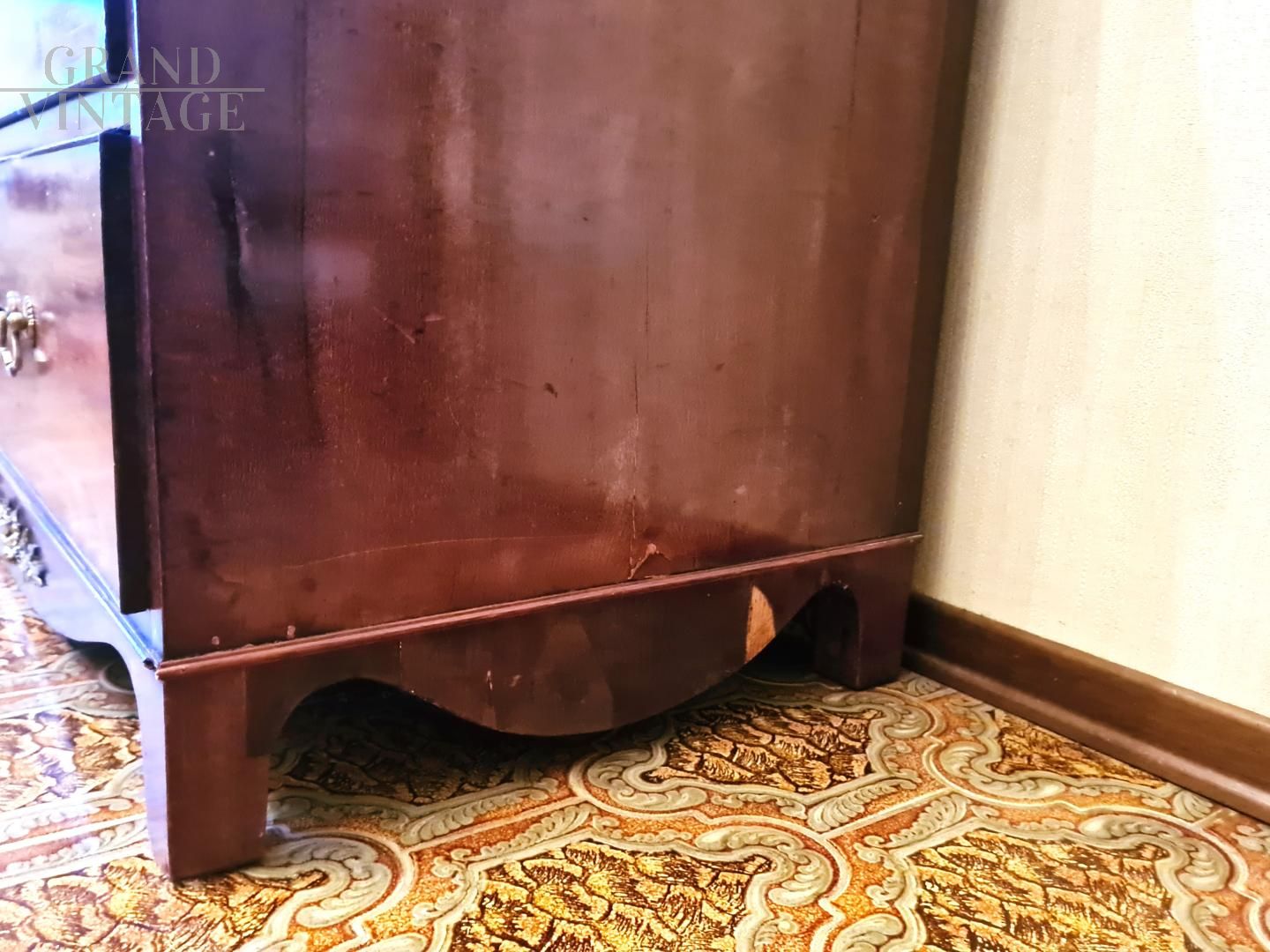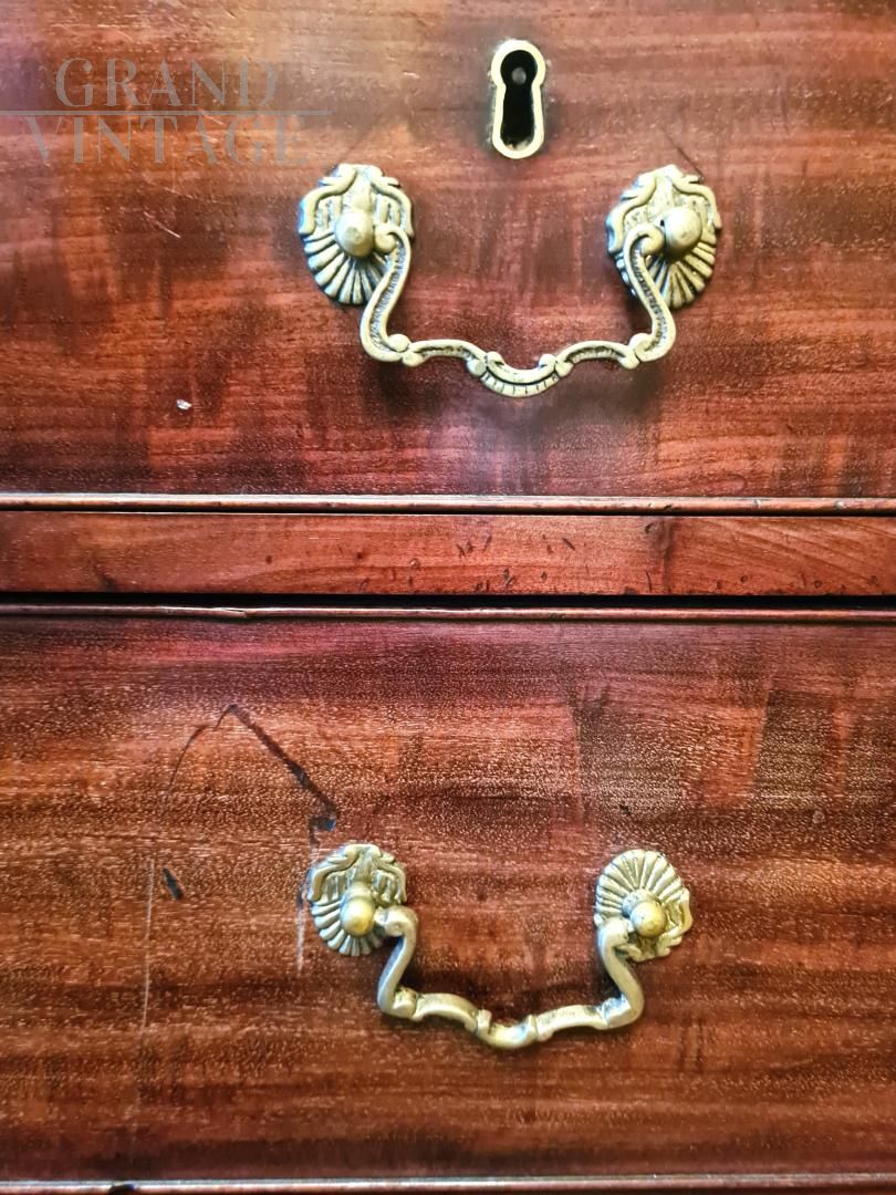 Cassettiera comò antico in legno di mogano di epoca Georgiana dell'800, composto da 5 cassetti con maniglie a collo di cigno e fregi floreali sul fondo in ottone, completo di chiave con serratura non funzionante. Presenta i naturali segni del tempo.