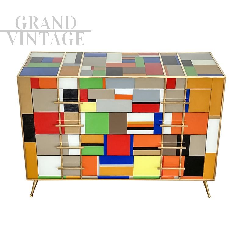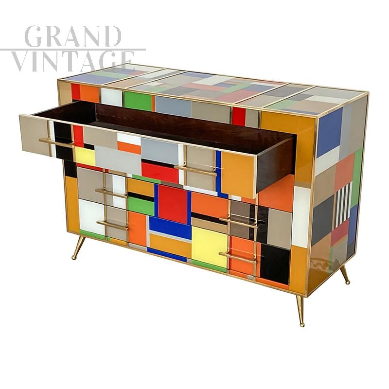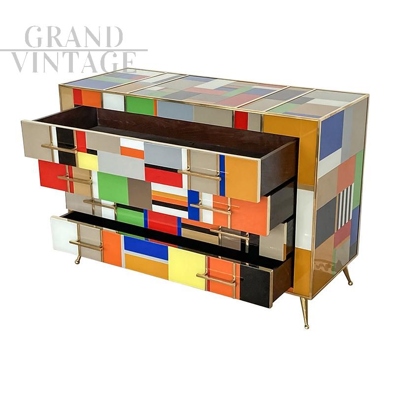 Comò cassettiera con quattro cassetti, interamente realizzato a mano con struttura in legno rivestita con tessere in vetro di Murano multicolore, e con profili, maniglie e piedi in ottone dorato.