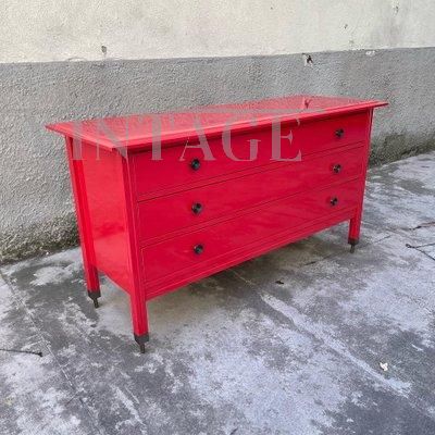 Meravigliosa cassettiera rossa disegnata da Carlo de Carli, modello D154 in legno laccato con particolari in ottone nichelato, produzione Sormani, Italia 1960.