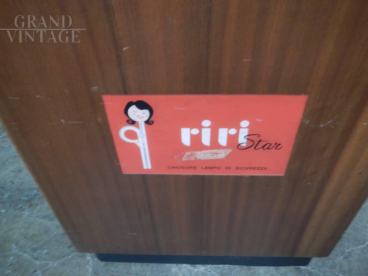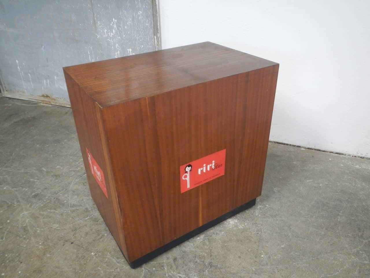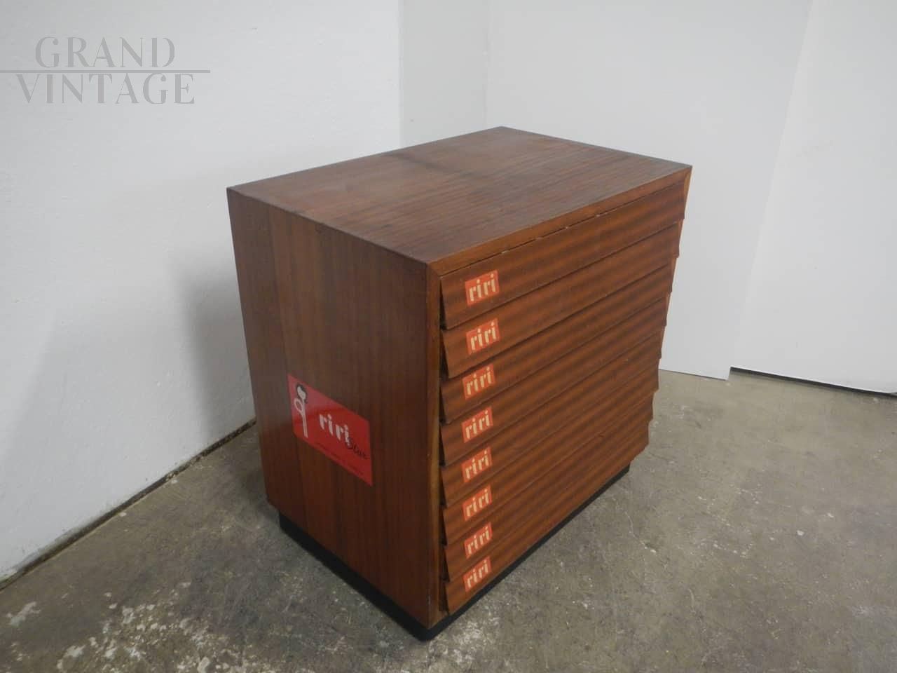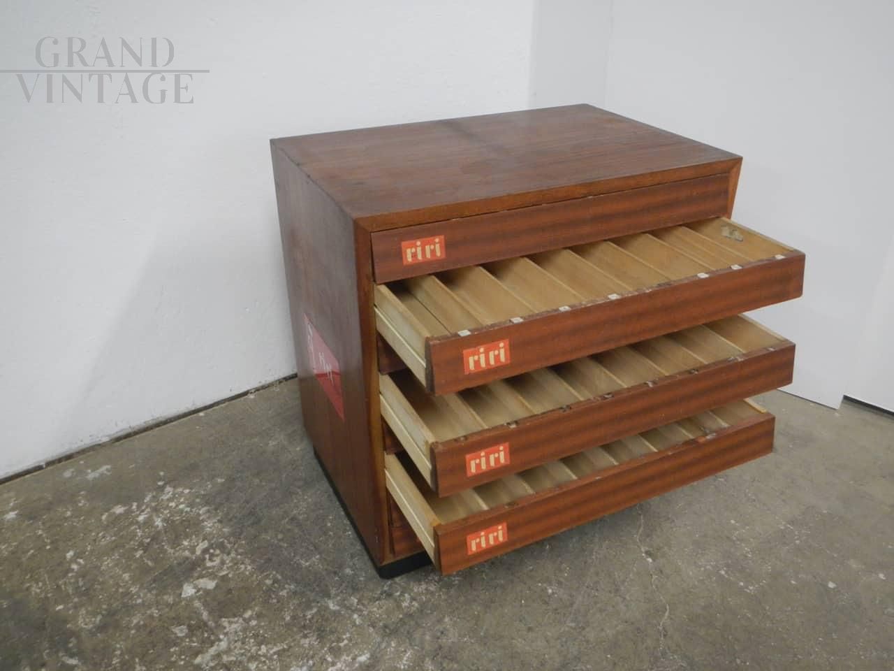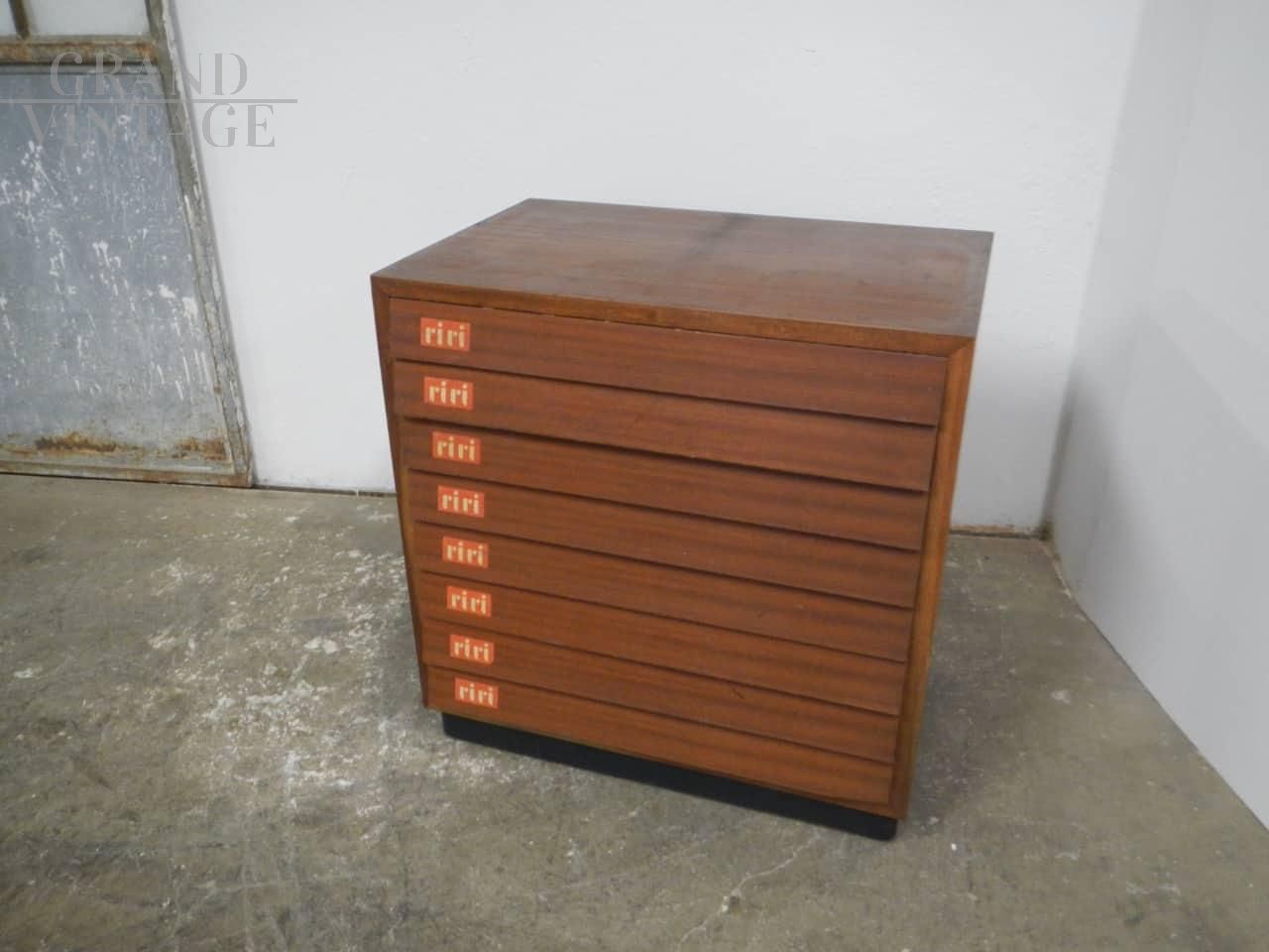 Cassettiera da merceria vintage in legno compresso rivestita in listellare di olmo, veniva utilizzata per riporre le cerniere, infatti riporta sui cassetti e sui fianchi la marca di cerniere RIRI. Dotata di 8 cassetti divisi in 8 parti di cm 8.5 di profondità. Un angolo del cassetto finale è rovinato come da foto.