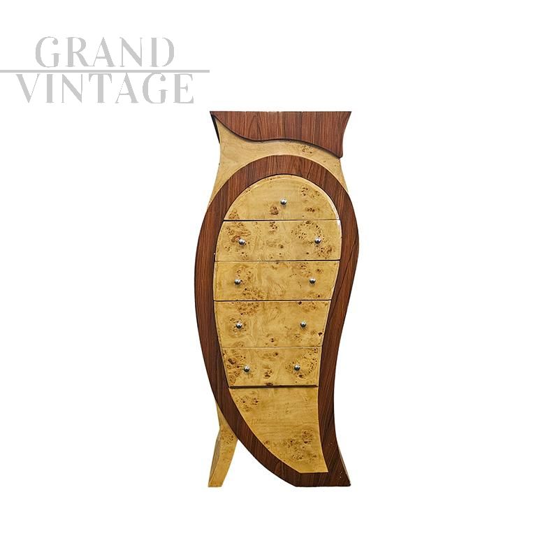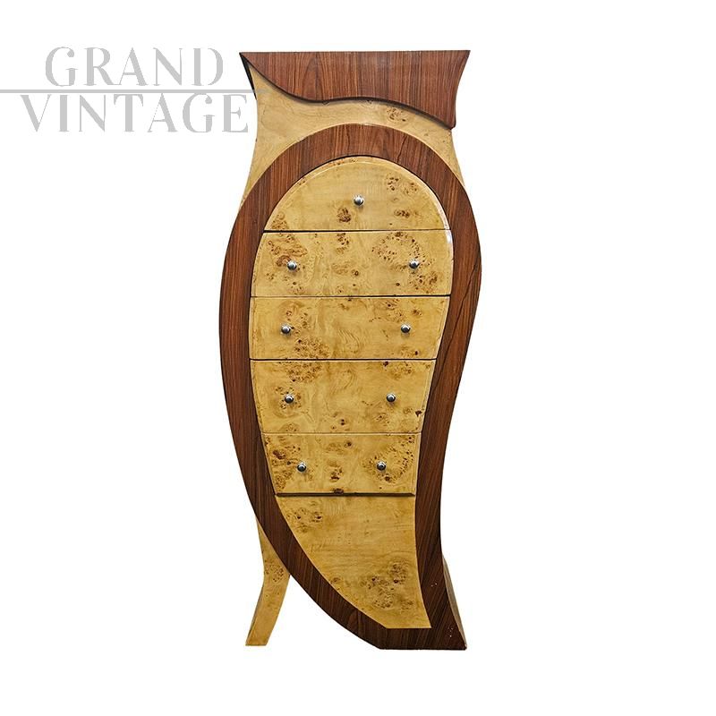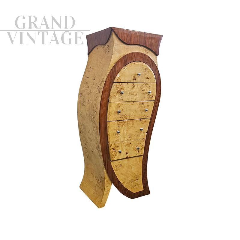Sinuosa cassettiera in stile art déco dalla forma sagomata, realizzata in radica e radica di betulla e dotata di 5 cassetti.