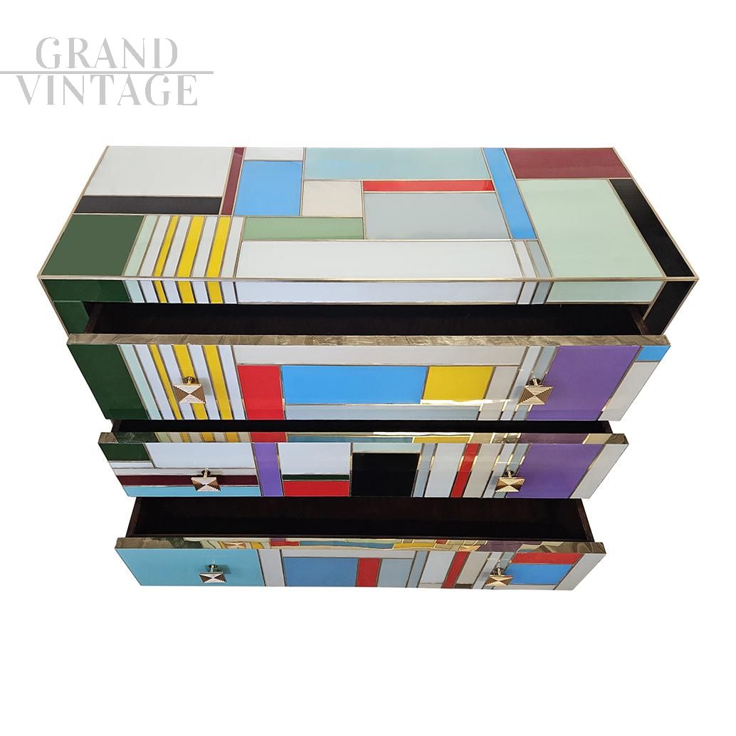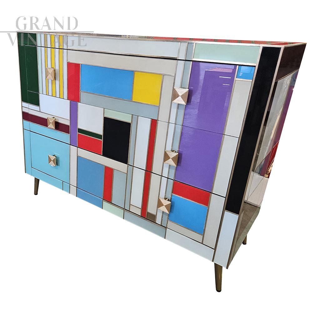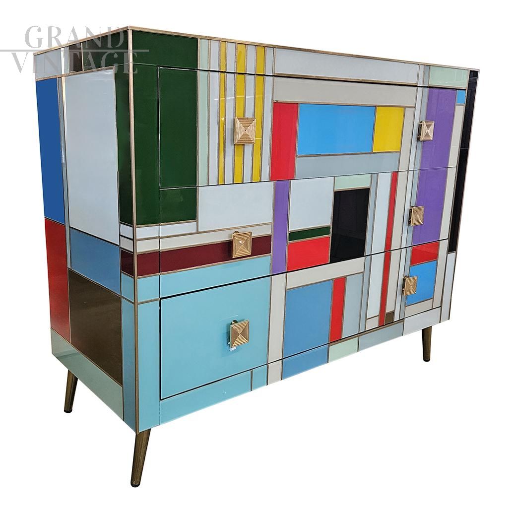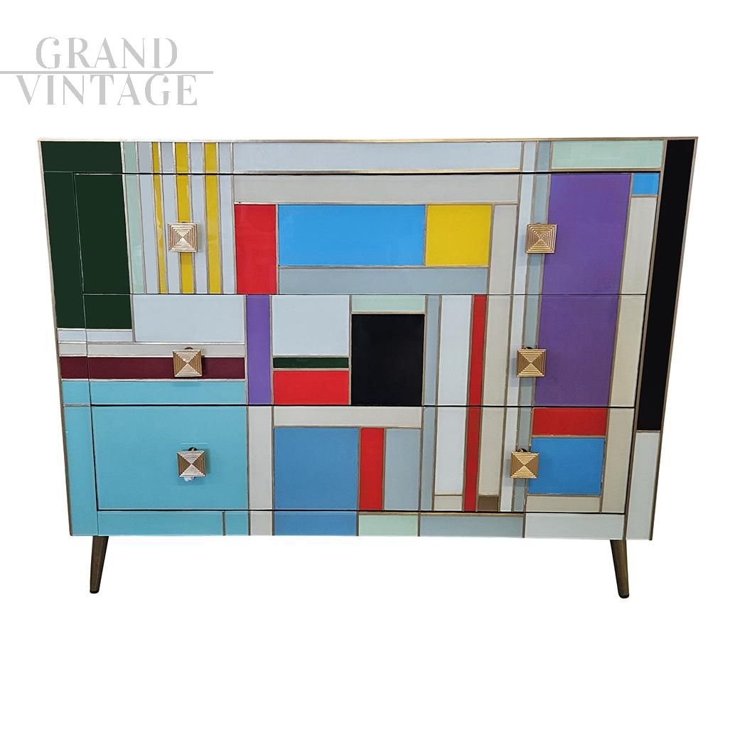 Comò cassettiera con tre cassetti completamente realizzato a mano, struttura in legno rivestita con vetri colorati, profili, maniglie e piedi in ottone dorato.