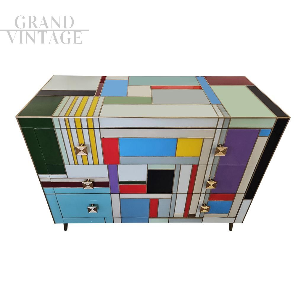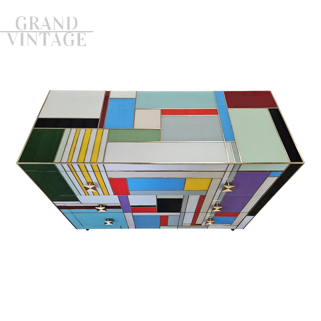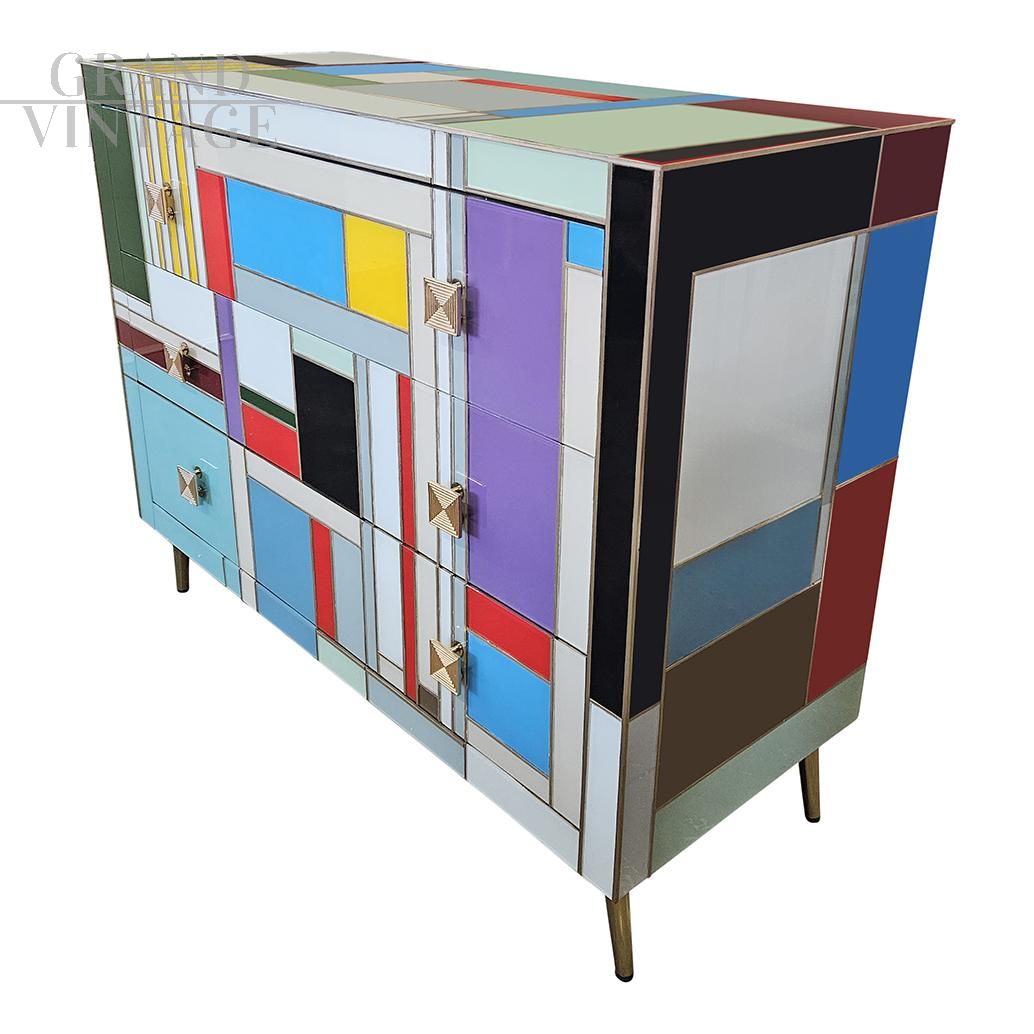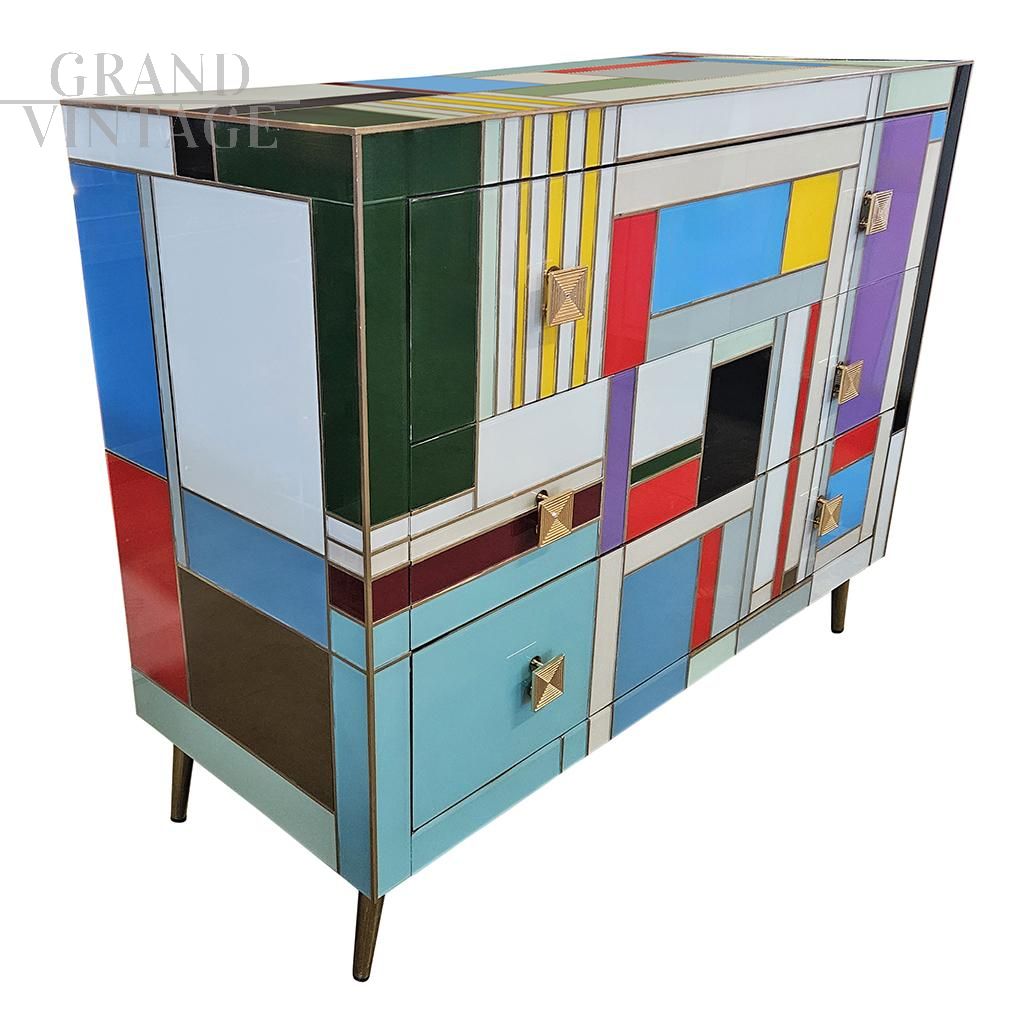 Comò cassettiera con tre cassetti completamente realizzato a mano, struttura in legno rivestita con vetri colorati, profili, maniglie e piedi in ottone dorato.