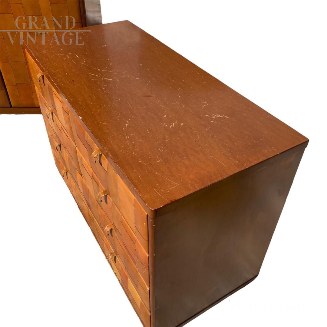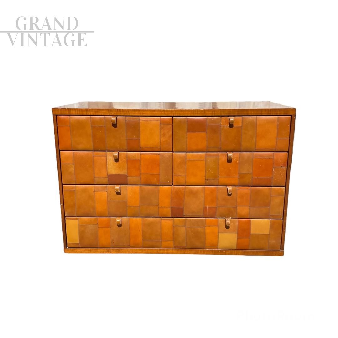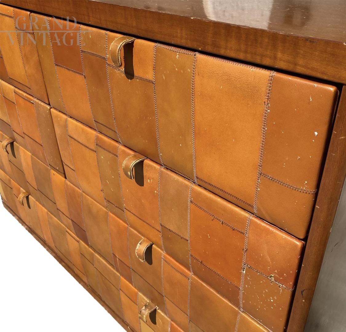 Incredibile e rarissima cassettiera disegnata da Tito Agnoli per Caleido, azienda di Poltrona Frau, nel 1970. L'oggetto è di incredibile fattura, con cassetti in pelle Pecary cuciti a mano a patchwork, utilizzando la pelle più pregiata sul mercato, per intenderci quella che Hermès utilizza per una delle borse più costose che produce, la Birkin. L'oggetto è accompagnato da expertise e autenticato direttamente da Frau SPA. Unico esemplare attualmente in commercio e oggetto di notevole artigianato italiano degli anni '70. L'oggetto è in ottime condizioni d'epoca, presenta alcuni segni di usura come mostrato nelle fotografie, ha due fori di mezzo centimetro dovuti al gatto del precedente proprietario.