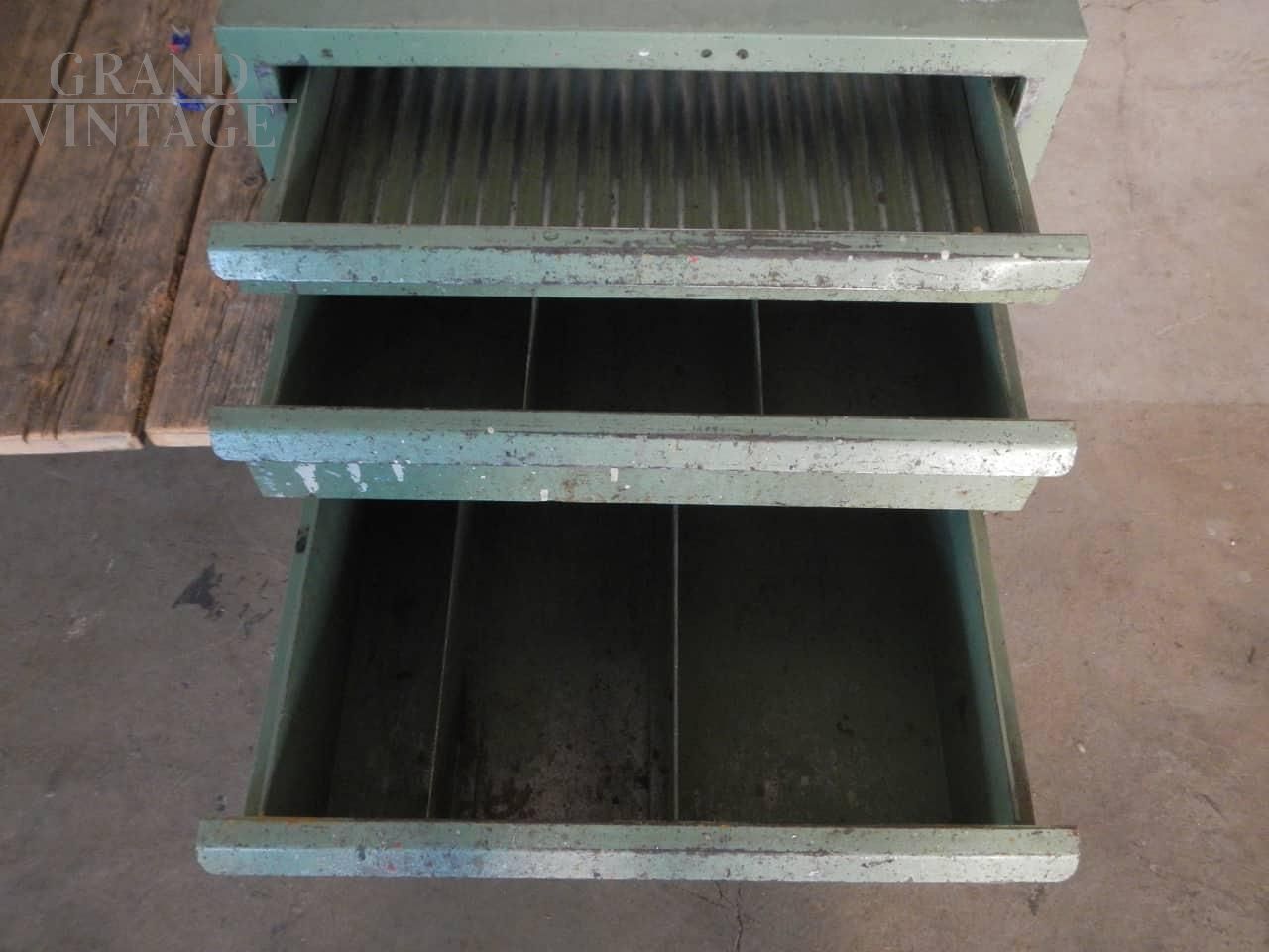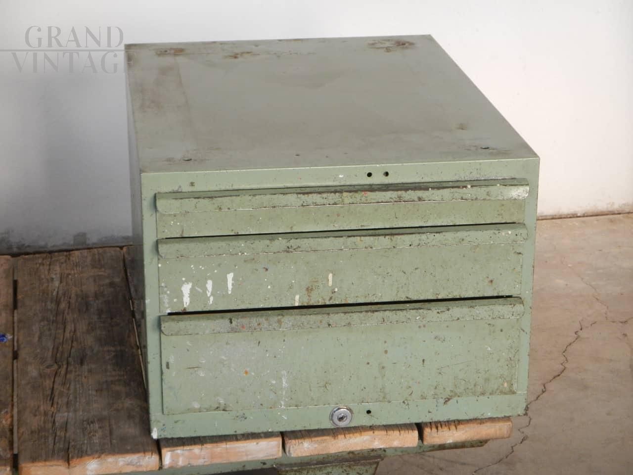 Cassettiera vintage industriale in ferro con tre cassetti posti su binari, anni '70.