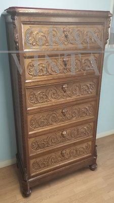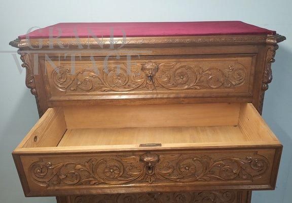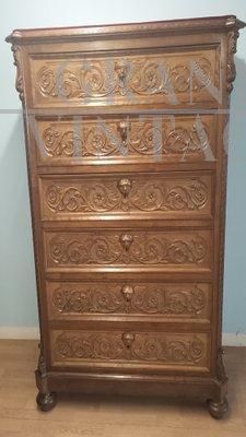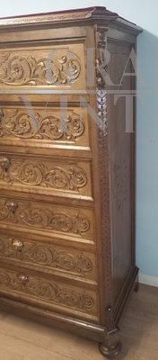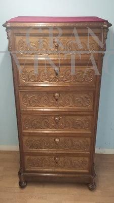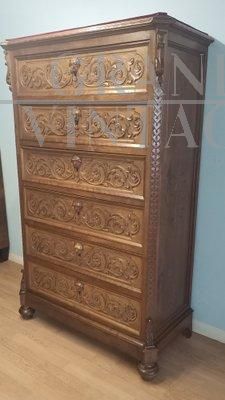 Cassettiera settimanale antica in noce intagliato del XIX secolo