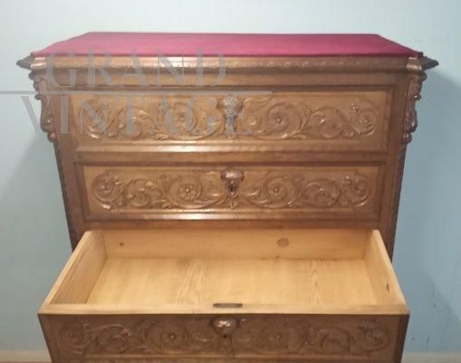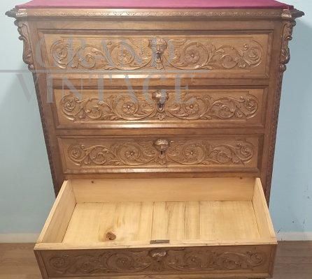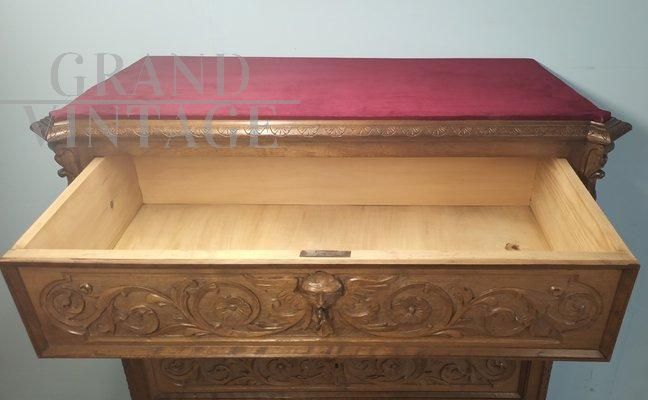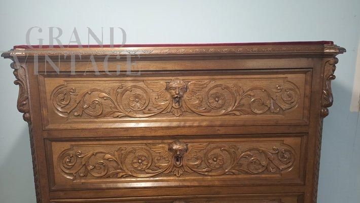 Questa cassettiera italiana in noce risale al 1890 circa, ha un piano in legno con applicazione di velluto rosso e presenta 6 cassetti in noce intagliato con chiari riferimenti neo rinascimentali. Ognuni cassetto è dotato di serratura originale funzionante. Il pezzo è completamente originale e privo di restauri, poggia su una base a zoccolo e piedi a cipolla. Provenienza: Italia Meridionale.