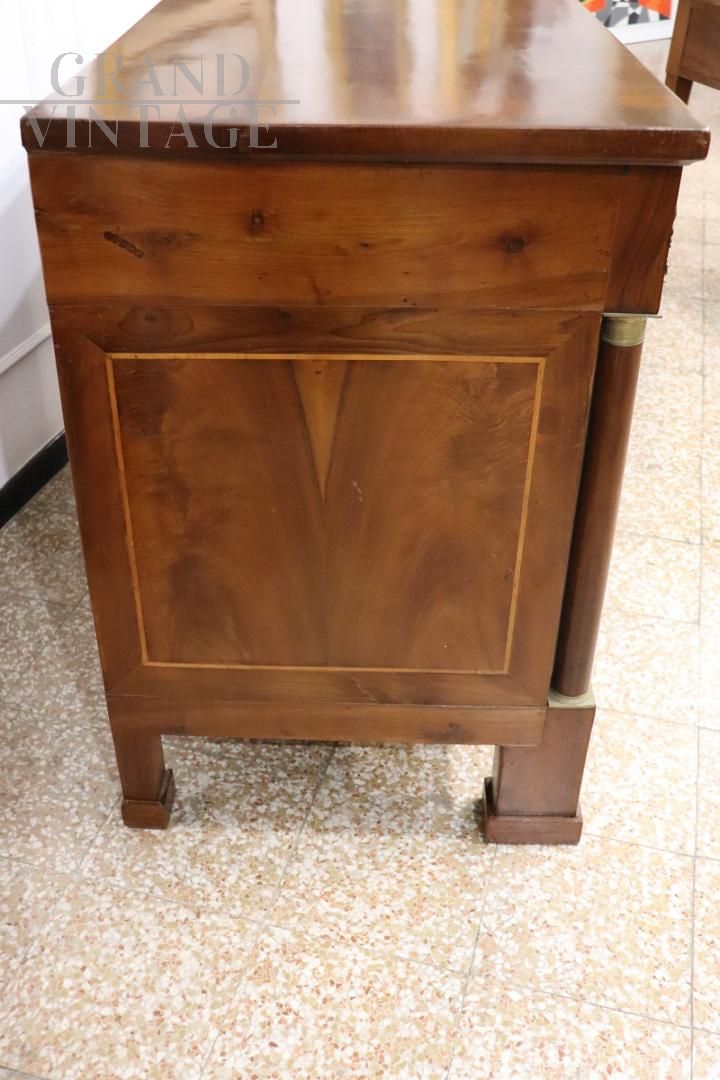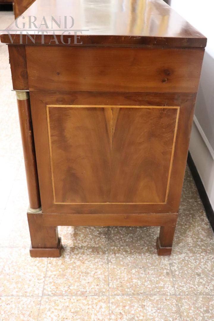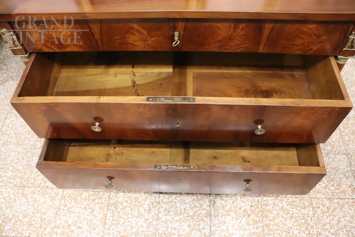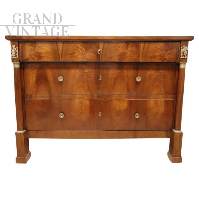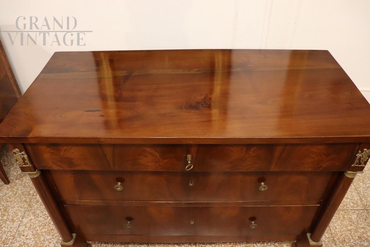 Antico cassettone italiano, risalente ai primi anni del XIX secolo, durante l'illustre periodo dell'Impero. Realizzato in legno massello di noce chiaro di prima qualità, presenta un design elegante e lineare che sottolinea l'eleganza e la raffinatezza. Il fronte è accentuato da due maestose colonne laterali, ornate da capitelli in bronzo dorato finemente cesellati che aggiungono un tocco di grandezza. Sopra le colonne, delicate figure alate in bronzo dorato conferiscono un raffinato accento decorativo. Questa spaziosa cassettiera offre un ampio spazio di archiviazione con tre cassetti, perfetti per organizzare le vostre cose. Il primo cassetto è dotato di due piccoli cassetti segreti sul fondo ideali per conservare con discrezione oggetti preziosi o documenti riservati. Restaurato.