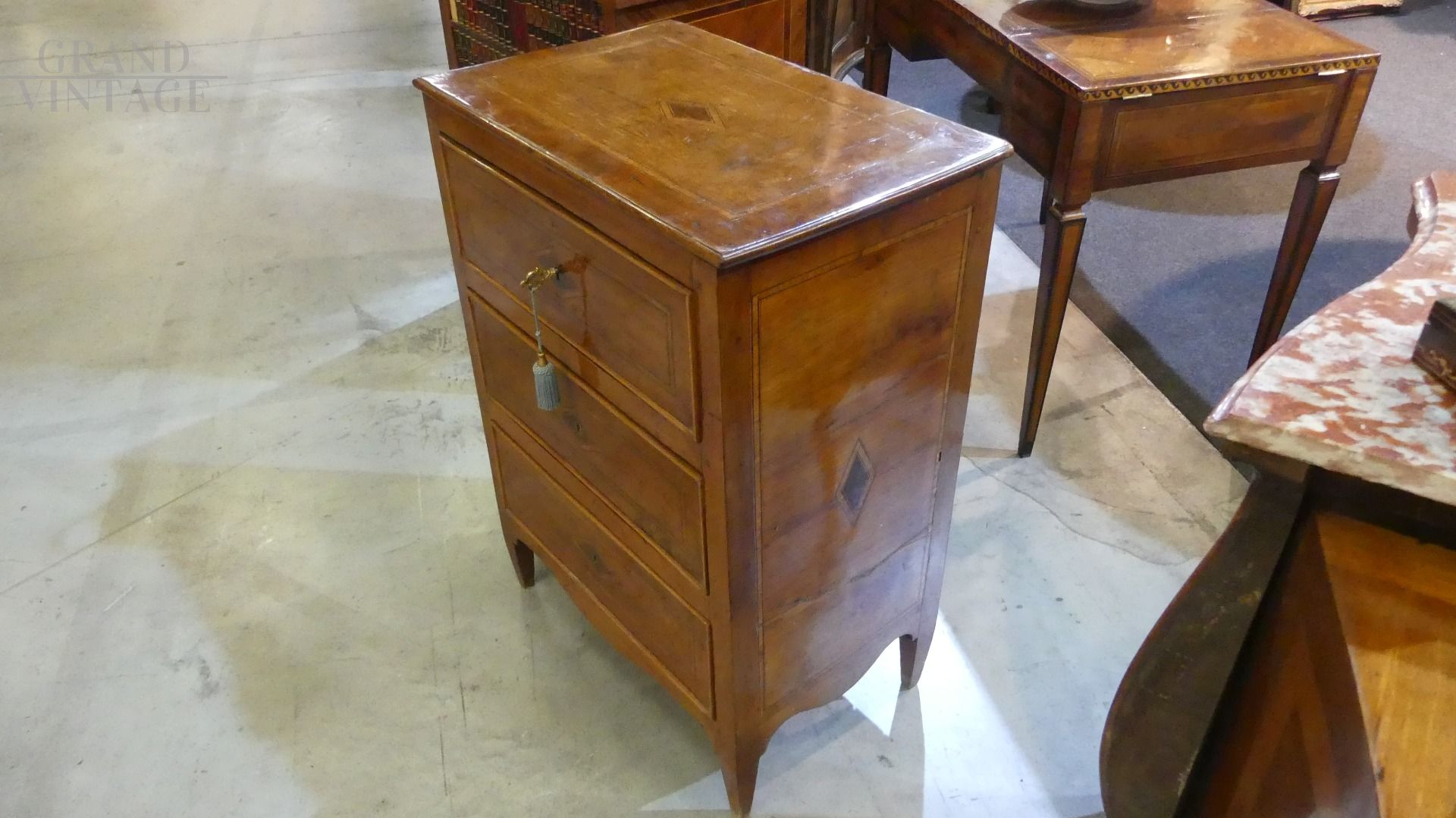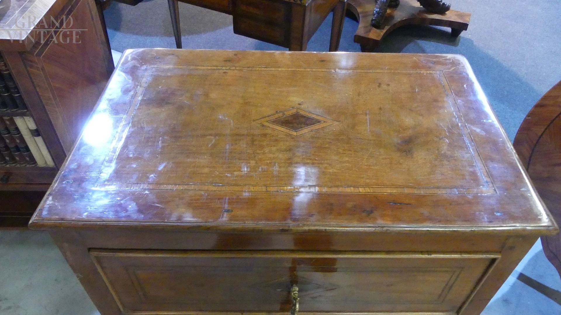 Cassettone Luigi XVI in legno di noce e di rosa, con rombi in ebano.