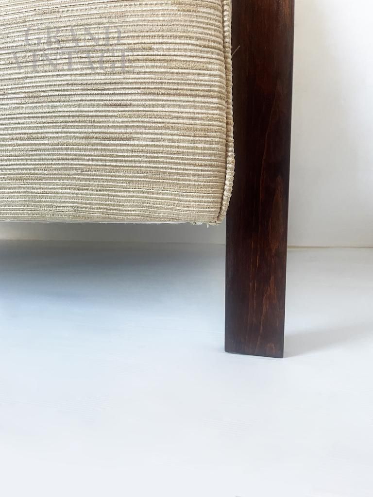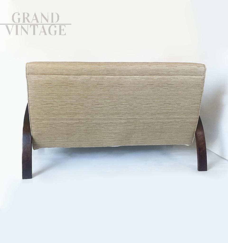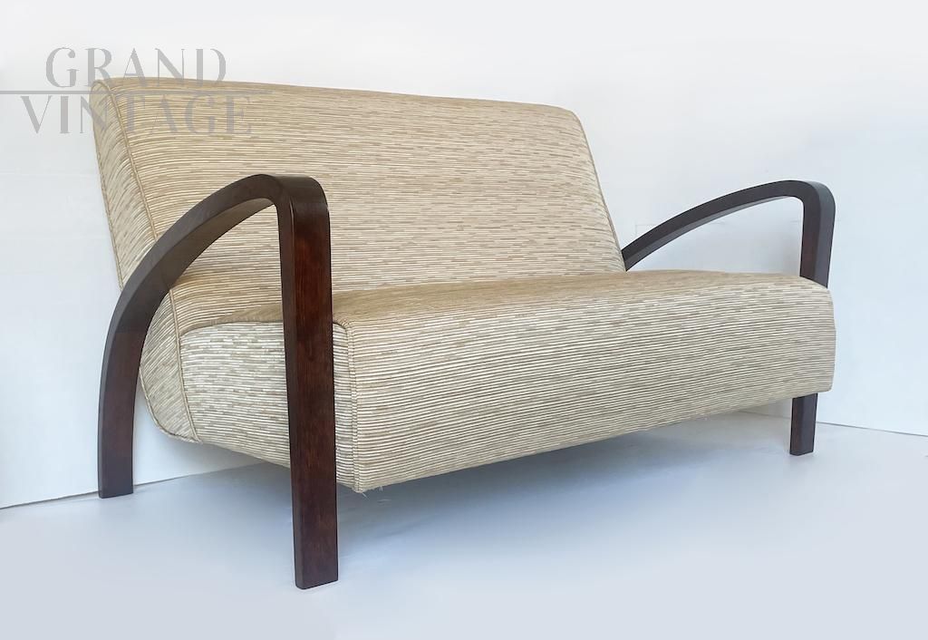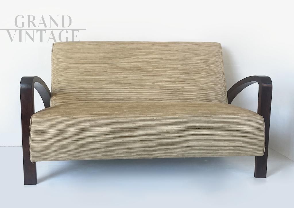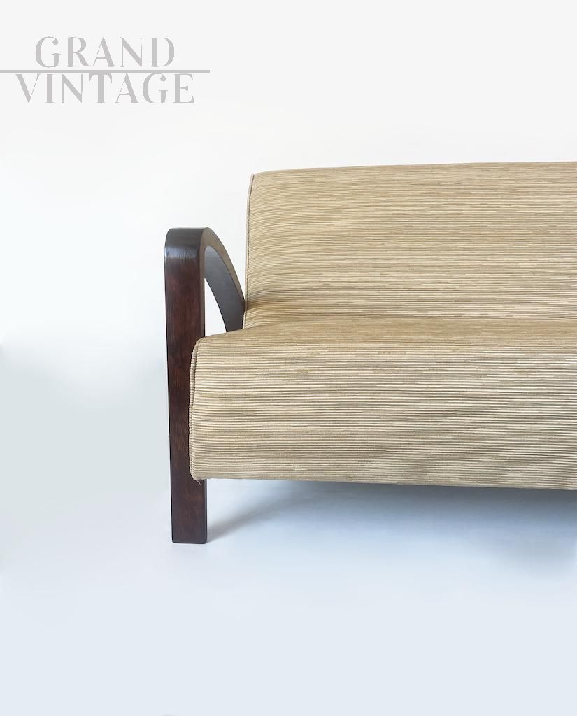 Particolare divano Art Déco italiano degli anni 30 con struttura e braccioli originali in noce e rivestimento in tessuto.