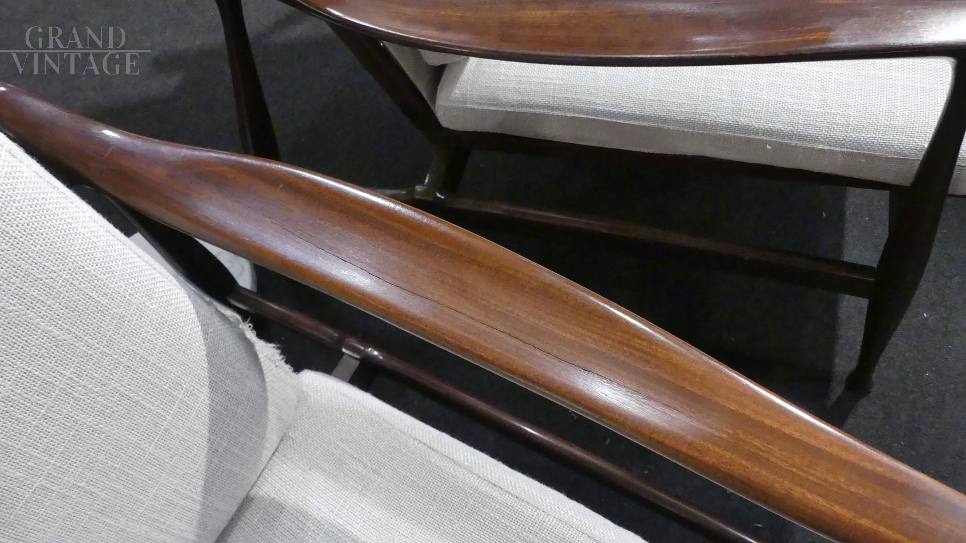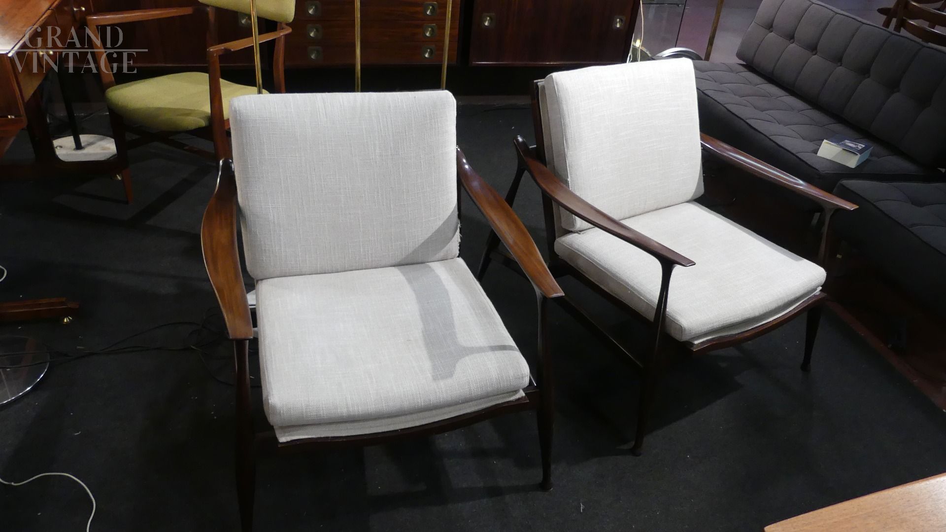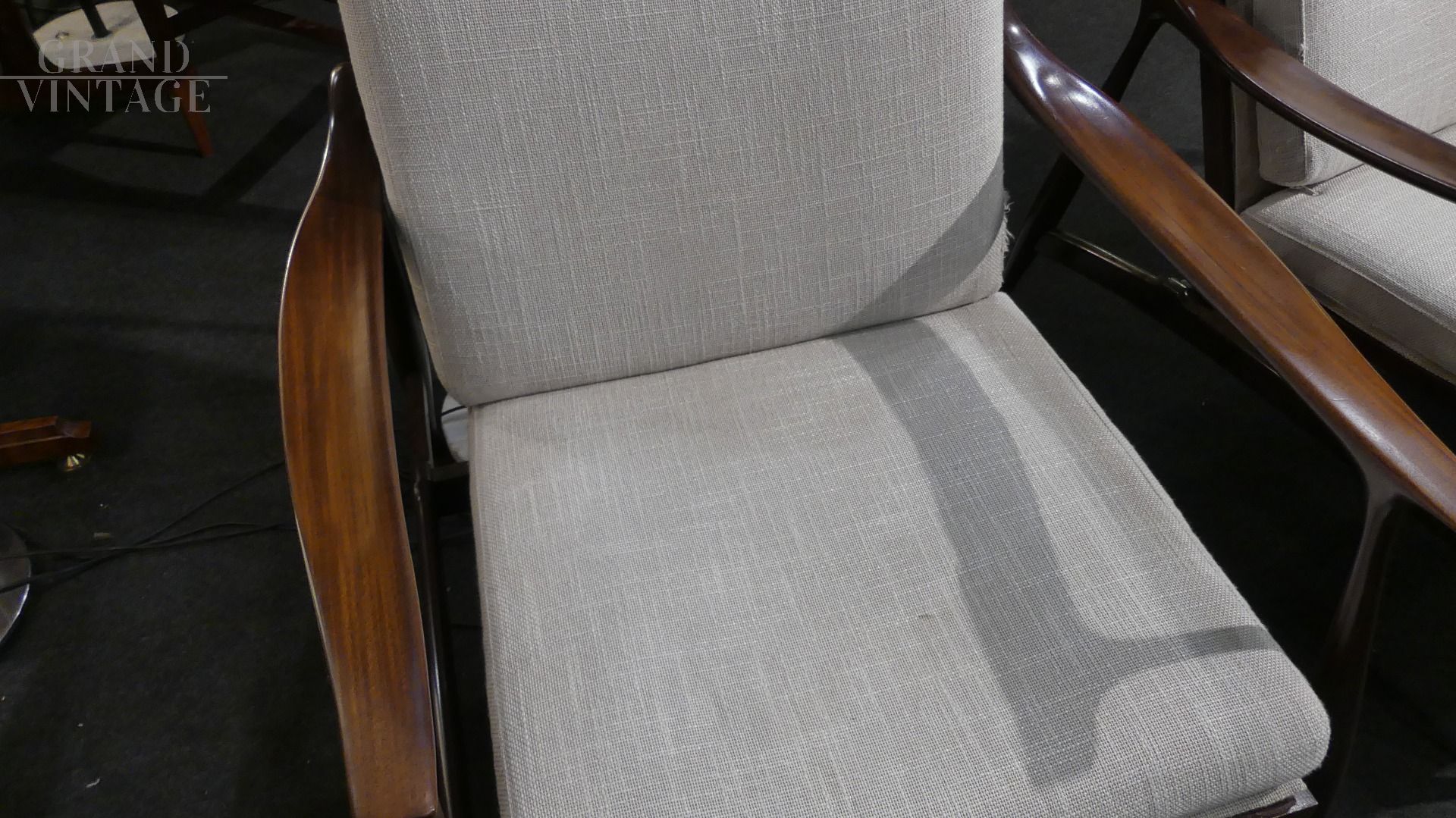 Coppia di poltroncine by Ico Parisi per Fratelli Reguitti, con struttura in legno teak e parti in stoffa rifoderate color grigio chiaro.