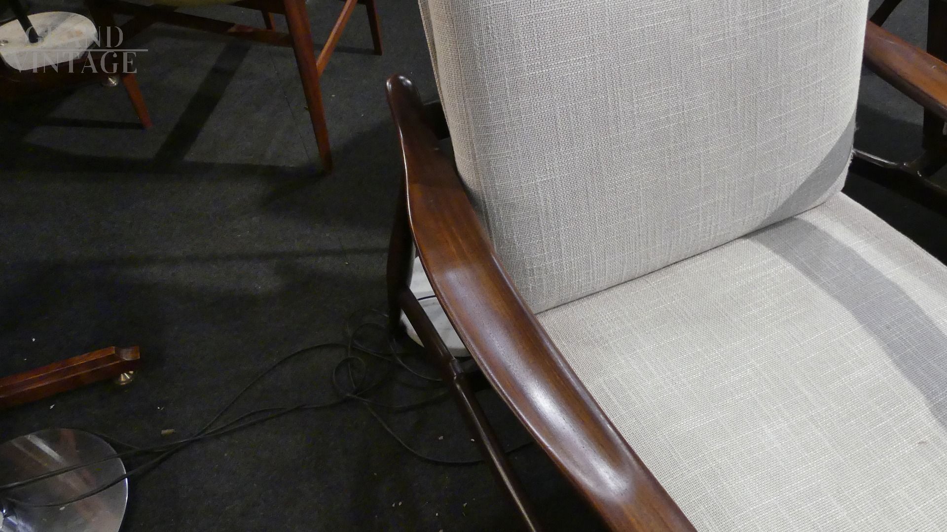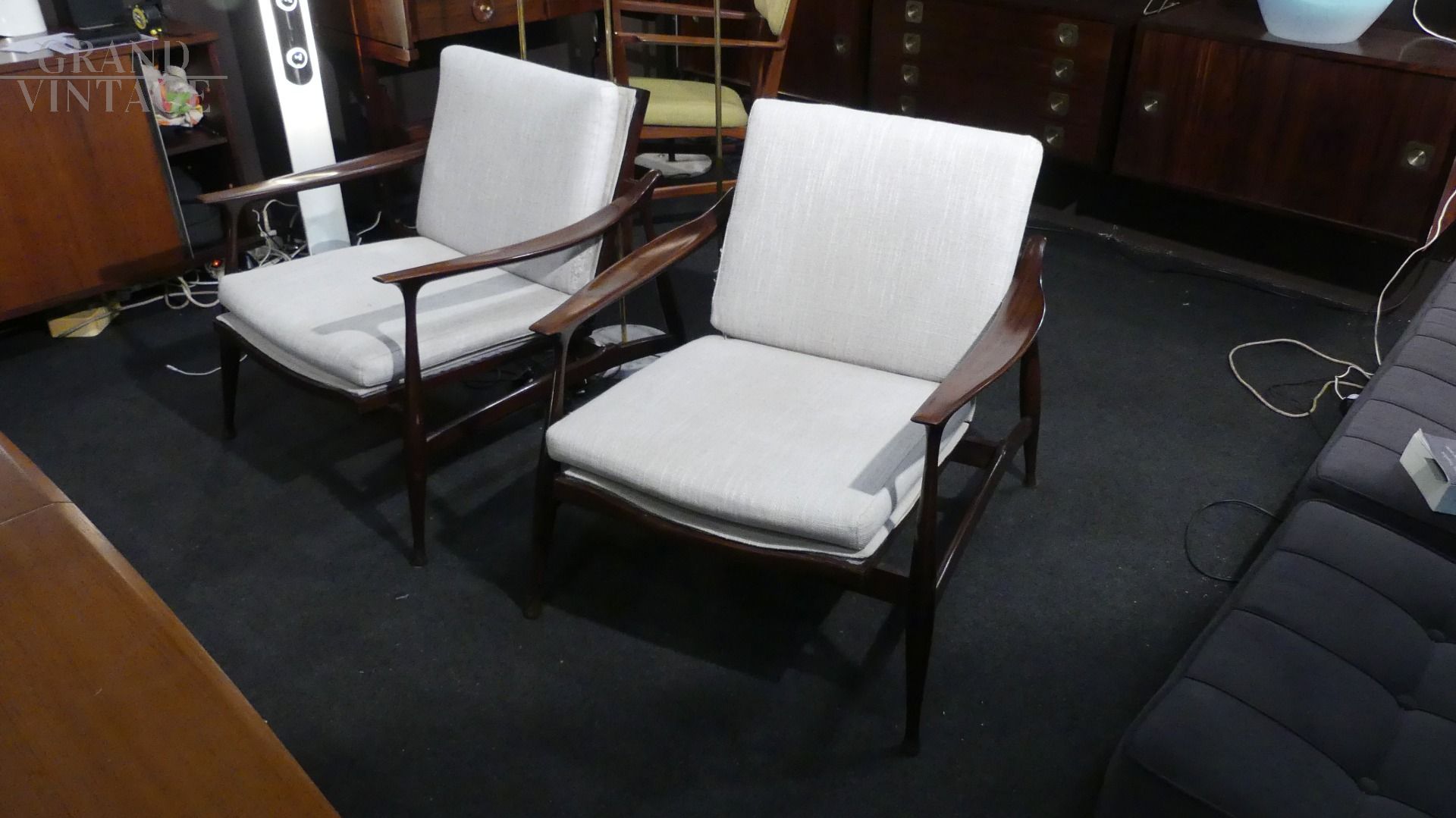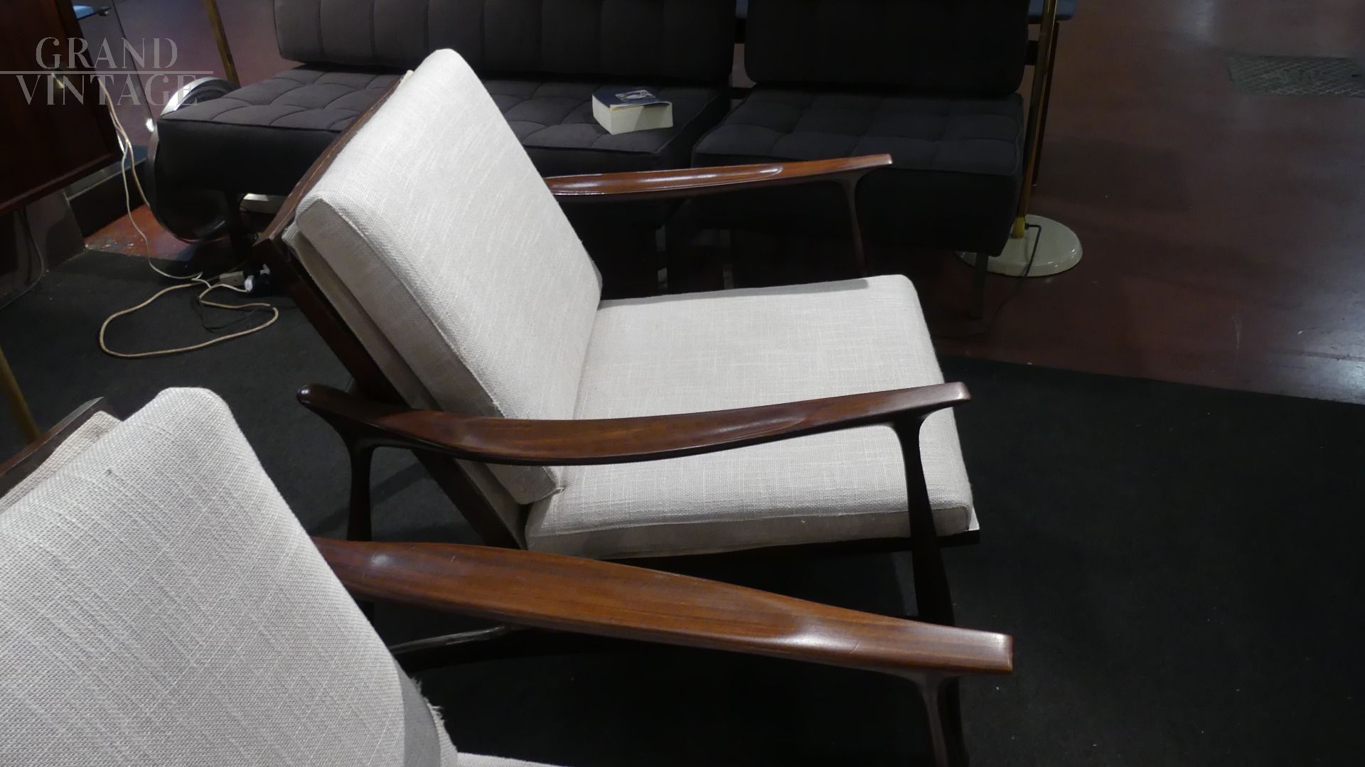 Coppia di poltroncine by Ico Parisi per Fratelli Reguitti, con struttura in legno teak e parti in stoffa rifoderate color grigio chiaro.